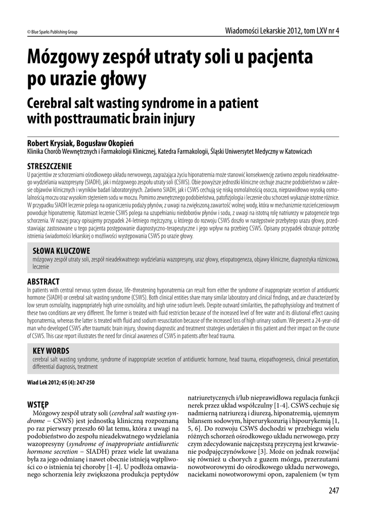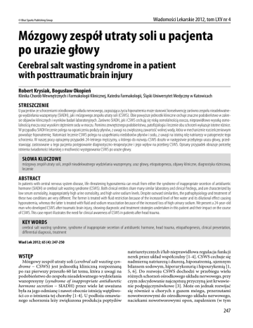 © Blue Sparks Publishing Group Wiadomości Lekarskie 2012, tom LXV nr 4 Mózgowy zespół utraty soli u pacjenta po urazie głowy Cerebral salt wasting syndrome in a patient with posttraumatic brain injury Robert Krysiak, Bogusław Okopień Klinika Chorób Wewnętrznych i Farmakologii Klinicznej, Katedra Farmakologii, Śląski Uniwersytet Medyczny w Katowicach STRESZCZENIE U pacjentów ze schorzeniami ośrodkowego układu nerwowego, zagrażająca życiu hiponatremia może stanowić konsekwencję zarówno zespołu nieadekwatnego wydzielania wazopresyny (SIADH), jak i mózgowego zespołu utraty soli (CSWS). Obie powyższe jednostki kliniczne cechuje znaczne podobieństwo w zakresie objawów klinicznych i wyników badań laboratoryjnych. Zarówno SIADH, jak i CSWS cechują się niską osmolalnością osocza, nieprawidłowo wysoką osmolalnością moczu oraz wysokim stężeniem sodu w moczu. Pomimo zewnętrznego podobieństwa, patofizjologia i leczenie obu schorzeń wykazuje istotne różnice. W przypadku SIADH leczenie polega na ograniczeniu podaży płynów, z uwagi na zwiększoną zawartość wolnej wody, która w mechanizmie rozcieńczeniowym powoduje hiponatremię. Natomiast leczenie CSWS polega na uzupełnianiu niedoborów płynów i sodu, z uwagi na istotną rolę natriurezy w patogenezie tego schorzenia. W naszej pracy opisujemy przypadek 24-letniego mężczyzny, u którego do rozwoju CSWS doszło w następstwie przebytego urazu głowy, przedstawiając zastosowane u tego pacjenta postępowanie diagnostyczno-terapeutyczne i jego wpływ na przebieg CSWS. Opisany przypadek obrazuje potrzebę istnienia świadomości lekarskiej o możliwości występowania CSWS po urazie głowy. SŁOWA KLUCZOWE mózgowy zespół utraty soli, zespół nieadekwatnego wydzielania wazopresyny, uraz głowy, etiopatogeneza, objawy kliniczne, diagnostyka różnicowa, leczenie ABSTRACT In patients with central nervous system disease, life-threatening hyponatremia can result from either the syndrome of inappropriate secretion of antidiuretic hormone (SIADH) or cerebral salt wasting syndrome (CSWS). Both clinical entities share many similar laboratory and clinical findings, and are characterized by low serum osmolality, inappropriately high urine osmolality, and high urine sodium levels. Despite outward similarities, the pathophysiology and treatment of these two conditions are very different. The former is treated with fluid restriction because of the increased level of free water and its dilutional effect causing hyponatremia, whereas the latter is treated with fluid and sodium resuscitation because of the increased loss of high urinary sodium. We present a 24-year-old man who developed CSWS after traumatic brain injury, showing diagnostic and treatment strategies undertaken in this patient and their impact on the course of CSWS. This case report illustrates the need for clinical awareness of CSWS in patients after head trauma. KEY WORDS cerebral salt wasting syndrome, syndrome of inappropriate secretion of antidiuretic hormone, head trauma, etiopathogenesis, clinical presentation, differential diagnosis, treatment Wiad Lek 2012; 65 (4): 247-250 WSTĘP Mózgowy zespół utraty soli (cerebral salt wasting syndrome − CSWS) jest jednostką kliniczną rozpoznaną po raz pierwszy przeszło 60 lat temu, która z uwagi na podobieństwo do zespołu nieadekwatnego wydzielania wazopresyny (syndrome of inappropriate antidiuretic hormone secretion − SIADH) przez wiele lat uważana była za jego odmianę i nawet obecnie istnieją wątpliwości co o istnienia tej choroby [1-4]. U podłoża omawianego schorzenia leży zwiększona produkcja peptydów natriuretycznych i/lub nieprawidłowa regulacja funkcji nerek przez układ współczulny [1-4]. CSWS cechuje się nadmierną natriurezą i diurezą, hiponatremią, ujemnym bilansem sodowym, hiperurykozurią i hipourykemią [1, 5, 6]. Do rozwoju CSWS dochodzi w przebiegu wielu różnych schorzeń ośrodkowego układu nerwowego, przy czym zdecydowanie najczęstszą przyczyną jest krwawienie podpajęczynówkowe [3]. Może on jednak rozwijać się również u chorych z guzem mózgu, przerzutami nowotworowymi do ośrodkowego układu nerwowego, naciekami nowotworowymi opon, zapaleniem (w tym 247 Robert Krysiak, Bogusław Okopień gruźliczym) opon mózgowo-rdzeniowych, u chorych poddanych przezklinowej resekcji gruczolaka przysadki oraz − jak obrazuje to opisany w niniejszej pracy przypadek chorego − u chorych z przebytym urazem czaszki [6]. Istnieją wątpliwości co do częstości występowania tego zespołu w stosunku do SIADH. Choć jeszcze kilka lat temu przyjmowano, że u chorych z patologią w obrębie ośrodkowego układu nerwowego CSWS występuje częściej od SIADH [5, 7], wyniki niedawno opisanego badania wydają się nie potwierdzać tego przypuszczenia [8]. Różnicowanie SIADH i CSWS jest zagadnieniem niezwykle istotnym z uwagi na zupełnie odmienne postępowanie w leczeniu obu powyższych jednostek chorobowych [6, 10]. Jeżeli u chorego z CSWS rozpozna się błędnie SIADH i ograniczy podaż płynów, może dojść do nasilenia hipowolemii, w tym do zmniejszenia przepływu mózgowego, którego potencjalną konsekwencją jest wtórne uszkodzenie tego narządu i zwiększone zagrożenie zgonem [9]. Natomiast zastosowanie u chorych z SIADH fizjologicznego roztworu chlorku sodu może sprzyjać retencji wolnej wody i − co za tym idzie − dalszemu spadkowi stężenia sodu w osoczu [2]. W naszej pracy przedstawiamy przypadek pacjenta, u którego doszło do rozwoju CSWS na podłożu przebytego urazu głowy, traktowanego początkowo jako SIADH. OBRAZ KLINICZNY Opisywany w niniejszej pracy mężczyzna doznał w wieku 24 lat urazu komunikacyjnego głowy i z powodu stanu śpiączkowego był hospitalizowany w oddziale intensywnej opieki medycznej. Przy przyjęciu stan ciężkości chorego w skali Glasgow oceniono na 8 punktów. Akcja serca wynosiła 86/minutę, natomiast ci