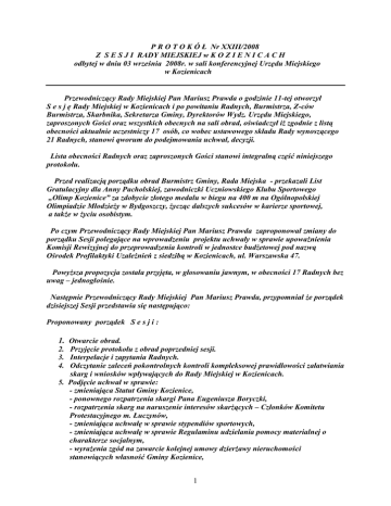P R O T O K Ó Ł Nr XXIII/2008 Z S E S J I RADY MIEJSKIEJ w K O Z I E N I C A C H odbytej w dniu 03 września 2008r. w sali konferencyjnej Urzędu Miejskiego w Kozienicach Przewodniczący Rady Miejskiej Pan Mariusz Prawda o godzinie 11-tej otworzył S e s j ę Rady Miejskiej w Kozienicach i po powitaniu Radnych, Burmistrza, Z-ców Burmistrza, Skarbnika, Sekretarza Gminy, Dyrektorów Wydz. Urzędu Miejskiego, zaproszonych Gości oraz wszystkich obecnych na sali obrad, oświadczył iż zgodnie z listą obecności aktualnie uczestniczy 17 osób, co wobec ustawowego składu Rady wynoszącego 21 Radnych, stanowi qworum do podejmowania uchwał, decyzji. Lista obecności Radnych oraz zaproszonych Gości stanowi integralną część niniejszego protokołu. Przed realizacją porządku obrad Burmistrz Gminy, Rada Miejska - przekazali List Gratulacyjny dla Anny Pacholskiej, zawodniczki Uczniowskiego Klubu Sportowego „Olimp Kozienice” za zdobycie złotego medalu w biegu na 400 m na Ogólnopolskiej Olimpiadzie Młodzieży w Bydgoszczy, życząc dalszych sukcesów w karierze sportowej, a także w życiu osobistym. Po czym Przewodniczący Rady Miejskiej Pan Mariusz Prawda zaproponował zmiany do porządku Sesji polegające na wprowadzeniu projektu uchwały w sprawie upoważnienia Komisji Rewizyjnej do przeprowadzenia kontroli w jednostce budżetowej pod nazwą Ośrodek Profilaktyki Uzależnień z siedzibą w Kozienicach, ul. Warszawska 47. Powyższa propozycja została przyjęta, w głosowaniu jawnym, w obecności 17 Radnych bez uwag – jednogłośnie. Następnie Przewodniczący Rady Miejskiej Pan Mariusz Prawda, przypomniał że porządek dzisiejszej Sesji przedstawia się następująco: Proponowany porządek S e s j i : 1. Otwarcie obrad. 2. Przyjęcie protokołu z obrad poprzedniej sesji. 3. Interpelacje i zapytania Radnych. 4. Odczytanie zaleceń pokontrolnych kontroli kompleksowej prawidłowości załatwiania skarg i wniosków wpływających do Rady Miejskiej w Kozienicach. 5. Podjęcie uchwał w sprawie: - zmieniająca Statut Gminy Kozienice, - ponownego rozpatrzenia skargi Pana Eugeniusza Boryczki, - rozpatrzenia skarg na naruszenie interesów skarżących – Członków Komitetu Protestacyjnego m. Łuczynów, - zmieniająca uchwałę w sprawie stypendiów sportowych, - zmieniająca uchwałę w sprawie Regulaminu udzielania pomocy materialnej o charakterze socjalnym, - wyrażenia zgód na zawarcie kolejnej umowy dzierżawy nieruchomości stanowiących własność Gminy Kozienice, 1 - wyrażenia zgody na nabycie do zasobu mienia komunalnego nieruchomości położonych w Kozienicach, - wyrażenia zgody na ustanowienie służebności gruntowej nieruchomości położonej w Kozienicach, - przeznaczenia do sprzedaży w drodze bezprzetargowej nieruchomości położonej w Kozienicach, - wyrażenia zgody na sprzedaż w drodze przetargu nieograniczonego nieruchomości stanowiącej własność Gminy Kozienice, - opinii o projekcie uchwały Rady Powiatu Kozienickiego o likwidacji komórek organizacyjnych w SP ZZOZ w Kozienicach, - zasad oddawania w dzierżawę najem majątku będącego w dyspozycji SP ZOZ „Przychodnie Kozienickie”, - przyjęcia Programu Aktywności Lokalnej dla Gminy Kozienice na lata 2008-2013, - uchwalenia Lokalnego Programu Rewitalizacji miasta Kozienice na lata 2008-2013, - zmian w budżecie Gminy Kozienice na 2008 rok - upoważnienia Komisji Rewizyjnej do przeprowadzenia kontroli kompleksowej w jednostce budżetowej pod nazwą Ośrodek Profilaktyki Uzależnień. 6. Odpowiedzi na interpelacje i zapytania Radnych. 7. Wolne wnioski i informacje. 8. Zamknięcie obrad. Przewodniczący Rady Miejskiej Pan Mariusz Prawda zwrócił się z pytaniem, czy ktoś z Radnych chciałby wystąpić z wnioskiem o dokonanie zmian w wyżej wymienionym porządku obrad? Radni nie zgłosili żadnych zmian, bądź innych propozycji. Proponowany porządek Sesji j.w. został przyjęty w głosowaniu jawnym, w obecności 17 Radnych bez uwag – jednogłośnie. Ad. 2. Punkt 2 - to przyjęcie protokołu z obrad poprzedniej Sesji. Protokoł Nr XXII/2008 z dnia 30 czerwca 2008r został przyjęty bez zastrzeżeń. Ad. 3. W punkcie interpelacje i zapytania radnych, głos zabrali: Radny Pan Krzysztof Pawlik zapytał: - Dlaczego przewoźnik nie zabezpieczył na Dworcu autobusowym toalet z których by mogli korzystać pasażerowie kursów przelotowych w godzinach nocnych? - Czy w 2009 roku nasza Gmina wraz ze Starostwem Powiatowym wybuduje chodnik który zagwarantuje pieszym bezpieczne dojście do znanej w Polsce Stadniny Koni, terenów sportowych, rekreacyjnych oraz bloków mieszkalnych? Dodał, że musi być równowaga w inwestowaniu w drogi na terenie miasta i gminy. 2 - - W imieniu Lokatorów mieszkań komunalnych zapytał: czy przygotowywana jest nowa uchwała Rady Miejskiej dot. zwiększenia bonifikat na wykup mieszkań spółdzielczych czy zakładowych tj. ok. 90% ? Zwrócił uwagę, że na Osiedlu Pokoju wzdłuż istniejącego chodnika z kostki brukowej ktoś ustawił płyty chodnikowe, które uniemożliwiają wjazd samochodów mimo, że są ustawione znaki zakazu. Płyty te zagrażają przechodniom, były wypadki. Czy KGK, która obecnie remontuje chodniki na tym osiedlu nie mogłaby tego usunąć i posadzić żywopłot? Radny Pan Jaworski Henryk zapytał: - Kiedy będzie realizowana inwestycja związana z przebudową drogi krajowej nr 79 i dlaczego nie jest realizowana? Radny Pan Buczkowski Marek zapytał: - Czy wszyscy mieszkańcy wpłacili jednakowe kwoty jako udział ludności przy realizacji inwestycji związanej z budową sieci wodno – kanalizacyjnej w m. Brzeźnica? Czy rozliczenie wpłat zostało zrealizowane do końca, czy mieszkańcy dokonywali jednakowych wpłat? - Czy ziemia znajdująca się na Stadionie jest własnością głównego wykonawcy czy KCKRiS? - Na jakim etapie jest realizacja inwestycji związanej z budową kanalizacji deszczowej w ul. Lubelskiej? Czy jest opracowywany projekt, 