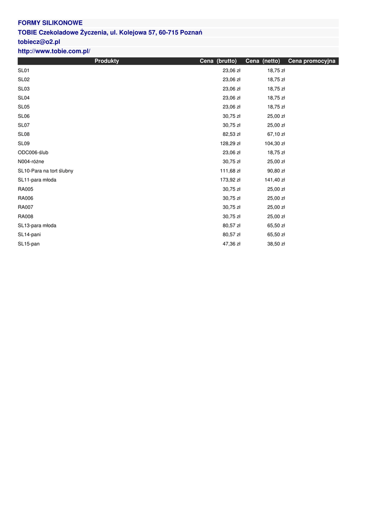 FORMY SILIKONOWE TOBIE Czekoladowe Życzenia, ul. Kolejowa 57, 60-715 Poznań [email protected] http://www.tobie.com.pl/ Produkty Cena (brutto) Cena (netto) SL01 23,06 zł 18,75 zł SL02 23,06 zł 18,75 zł SL03 23,06 zł 18,75 zł SL04 23,06 zł 18,75 zł SL05 23,06 zł 18,75 zł SL06 30,75 zł 25,00 zł SL07 30,75 zł 25,00 zł SL08 82,53 zł 67,10 zł SL09 128,29 zł 104,30 zł 23,06 zł 18,75 zł ODC006-ślub N004-różne 30,75 zł 25,00 zł SL10-Para na tort ślubny 111,68 zł 90,80 zł SL11-para młoda 173,92 zł 141,40 zł RA005 30,75 zł 25,00 zł RA006 30,75 zł 25,00 zł RA007 30,75 zł 25,00 zł RA008 30,75 zł 25,00 zł SL13-para młoda 80,57 zł 65,50 zł SL14-pani 80,57 zł 65,50 zł SL15-pan 47,36 zł 38,50 zł Cena promocyjna