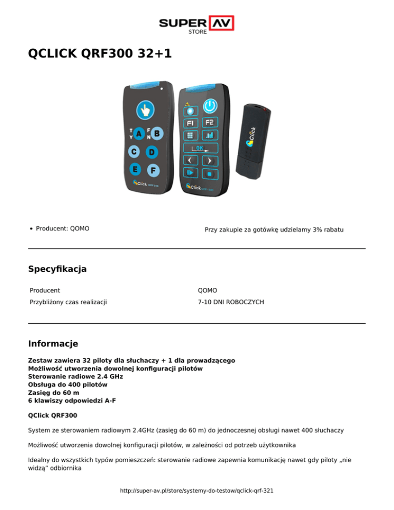 QCLICK QRF300 32+1 Producent: QOMO Przy zakupie za gotówkę udzielamy 3% rabatu Specyfikacja Producent QOMO Przybliżony czas realizacji 7-10 DNI ROBOCZYCH Informacje Zestaw zawiera 32 piloty dla słuchaczy + 1 dla prowadzącego Możliwość utworzenia dowolnej konfiguracji pilotów Sterowanie radiowe 2.4 GHz Obsługa do 400 pilotów Zasięg do 60 m 6 klawiszy odpowiedzi A-F QClick QRF300 System ze sterowaniem radiowym 2.4GHz (zasięg do 60 m) do jednoczesnej obsługi nawet 400 słuchaczy Możliwość utworzenia dowolnej konfiguracji pilotów, w zależności od potrzeb użytkownika Idealny do wszystkich typów pomieszczeń: sterowanie radiowe zapewnia komunikację nawet gdy piloty „nie widzą” odbiornika http://super-av.pl/store/systemy-do-testow/qclick-qrf-321 Proste i funkcjonalne piloty z przyciskami A-F umożliwiają wybór z 6 możliwych odpowiedzi Pilot prowadzącego wyposażony jest we wskaźnik laserowy Możliwość przypisania numeru ID do pilotów, co pozwala skojarzyć konkretnego ucznia z danym pilotem nawet na okres całego semestru, roku lub edukacji. W przypadku firm, pozwoli on np. na głosowania jawne System do sprawdzania testów QClick to: Błyskawiczne sprawdzanie poziomu opanowania materiału – interaktywne testy wiedzy Szybka i obiektywna ocena rezultatów nauczania Przeprowadzanie ankiet, badanie opinii Zliczanie głosów podczas posiedzeń gremiów samorządowych (głosowania jawne lub tajne) Teleturnieje, quizy, interaktywne zabawy itp. Oszczędność czasu na lekcji – natychmiastowa reakcja zwrotna Oszczędność pracy nauczyciela Duża oszczędność papieru Uwaga! do działania oprogramowania QClick wymagany jest program Power Point. Super AV al. Jana Pawła II 32 43 - 100 Tychy tel: 32 217 01 12 http://super-av.pl/store/systemy-do-testow/qclick-qrf-321