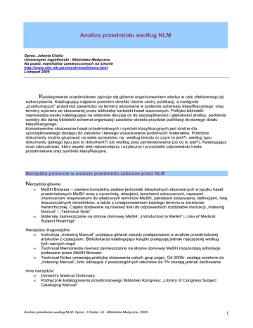 Analiza przedmiotu według NLM Oprac. Jolanta Cieśla Uniwersytet Jagielloński - Biblioteka Medyczna Na podst. materiałów zamieszczonych na stronie http://www.nlm.nih.gov/mesh/meshhome.html Listopad 2005 Katalogowanie przedmiotowe zajmuje się głównie organizowaniem wiedzy w celu efektywnego jej wykorzystania. Katalogujący najpierw powinien określić istotne cechy publikacji, a następnie „przetłumaczyć” przedmiot zawartości na terminy stosowane w systemie schematu klasyfikacyjnego oraz terminy wybrane ze stosowanej przez bibliotekę kartoteki haseł wzorcowych. Polityka biblioteki naprowadza osoby katalogujące na właściwe decyzje co do szczegółowości i głębokości analizy, podobnie swoisty dla danej biblioteki schemat organizacji zasobów określa przydział publikacji do danego działu klasyfikacyjnego. Konsekwentne stosowanie haseł przedmiotowych i symboli klasyfikacyjnych jest istotne dla uporządkowanego dostępu do zasobów i łatwego wyszukiwania podobnych materiałów. Podobne dokumenty moŜna grupować na wiele sposobów, np. według tematu (o czym to jest?), według typu dokumentu (jakiego typu jest to dokument?) lub według pola zainteresowania (po co to jest?). Katalogujący musi zdecydować, który aspekt jest najwaŜniejszy i uŜyteczny i przydzielić odpowiednio hasła przedmiotowe oraz symbole klasyfikacyjne. Narzędzia pomocne w analizie przedmiotu zalecane przez NLM Narzędzia główne • • MeSH Browser – zawiera kompletny zestaw jednostek leksykalnych stosowanych w języku haseł przedmiotowych MeSH wraz z synonimią, relacjami, terminami odrzuconymi, nazwami chemicznymi mapowanymi do właściwych terminów MeSH, zakresem stosowania, definicjami, listą dopuszczalnych określników, a takŜe z umiejscowieniem kaŜdego terminu w strukturze hierarchicznej. Często dodawane są równieŜ linki do odpowiednich rozdziałów instrukcji „Indexing Manual” i „Technical Note” Materiały zamieszczane na stronie domowej MeSH: „Introduction to MeSH” i „Use of Medical Subject Headings” Narzędzia drugorzędne • Instrukcja „Indexing Manual” podająca główne zasady postępowania w analizie przedmiotowej artykułów z czasopism. Bibliotekarze katalogujący ksiąŜki postępują jednak najczęściej według tych samych reguł • Technical Memoranda równieŜ zamieszczone na stronie domowej MeSH rozszerzają adnotacje podawane przez MeSH Browser • Technical Notes omawiają praktykę stosowania całych grup pojęć. Od 2005r. zostają wcielone do „Indexing Manual”, linki istniejące z poszczególnych rekordów do TN zostają jednak zachowane Inne narzędzia • Dorland’s Medical Dictionary • Podręcznik katalogowania przedmiotowego Biblioteki Kongresu: „Library of Congress Subject Cataloging Manual” Analiza przedmiotu według NLM. Oprac. J.Cieśla, UJ - Biblioteka Medyczna, 2005 1 Charakterystyka przedmiotowa z podziałem na główne i drugorzędne hasła przedmiotowe – powiązanie z klasyfikacją Hasło lub hasła przedmiotowe główne (primary heading) reprezentują główny temat charakteryzowanej pracy i – jeśli to moŜliwe, w połączeniu z typem publikacji - prowadzą do nadania symbolu klasyfikacji. Bezpośrednie powiązanie między hasłem głównym i numerem klasyfikacyjnym jest moŜliwe w większości przypadków. Zaleca się jedno hasło główne. W przypadkach, gdy główny temat pracy nie moŜe być ujęty przy pomocy jednego hasła (np. brak jednego pojęcia lub kombinacji właściwego hasła z określnikiem prowadzącego do odpowiedniego numeru klasyfikacyjnego) mogą być przyznane dwa lub trzy hasła główne. Przykład: Praca o zapobieganiu poŜarom w szpitalu wymaga połączenia haseł: Fires--prevention and control Hospitals Właściwy wybór działu klasyfikacyjnego prowadzi do symbolu WX 185, w systemie klasyfikacji NLM stosowanego do prac o bezpieczeństwie w szpitalach i programach na wypadek poŜaru lub katastrofy. Wszystkie inne hasła przedmiotowe nie prowadzące bezpośrednio do wybranego numeru klasyfikacyjnego są określane jako hasła drugorzędne (secondary subject headings). Przydzielanie haseł MeSH NaleŜy przydzielać hasła najściślej i najpełniej opisujące zawartość pozycji, tak by objąć wszystkie waŜne aspekty, ale bez nadmiaru informacji (redundancji). Zasadą jest stosowanie zawsze moŜliwie najbardziej szczegółowych haseł. Przy wyborze haseł ogólnych naleŜy stosować rozsądną ocenę, czy powinno być do opisu dodane hasło opisujące część wstępną - tło dla dalszych zagadnień (np. rozdziały dotyczące anatomii lub fizjologii układu w pracy traktującej o chorobach tego układu). Wskazówki przy wyborze haseł: • Generalnie nie powinno się jednocześnie przydzielać haseł, którym przypisano węŜszy i szerszy zakres pojęciowy, nawet jeśli pochodzą one z róŜnych drzew w strukturze hierarchicznej (np. Health Services (N2) i Delivery of Health Care (N4, N5)) • NaleŜy rozsądnie rozwaŜyć zastosowanie jednocześnie haseł z jednego drzewa pozostających we wzajemnej relacji nadrzędności i podrzędności. UŜycie ich moŜe być właściwe w przypadkach kiedy połowa pracy jest bardzo ogólna lub tematycznie odnosi się do wszystkich haseł w jednym drzewie jako całości, ale specjalny nacisk połoŜony jest na jedno czy dwa wąskie zagadnienia • Czasami moŜe być właściwe przydzielenie tego samego hasła dwa lub trzy razy z róŜnymi określnikami (zob. „Praktyka katalogowania wg NLM”: Stosowanie określników) • MoŜna zastosować to samo hasło bez określnika i jednocześnie powtórzyć je z określnikiem, o ile połowa pracy mówi o danym pojęciu bardzo ogólnie, a druga połowa omawia jego jeden specyficzny aspekt • Nie naleŜy przydzielać hasła ze względu na typ czytelnika lub przeznaczenie publikacji, chyba Ŝe zawiera ona treść swoistą tylko dla danego typu odbiorcy (np. hasło Dentistry nie powinno znaleźć si