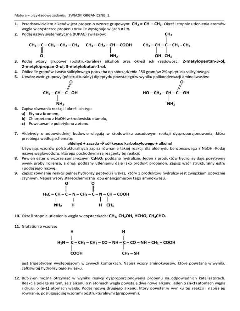 Matura – przykładowe zadania: ZWIĄZKI ORGANICZNE_1. _____________________________________________________________________________________________________________________ 1. Przedstawicielem alkenów jest propen o wzorze grupowym: CH2 = CH – CH3. Określ stopnie utlenienia atomów węgla w cząsteczce propenu oraz ile występuje wiązao σ i π. 2. Podaj nazwy systematyczne (IUPAC) związków: CH3 CH3 – C – CH2 – CH2 – CH3 CH3 – CH2 – CH – COOH O NH2 CH3 – CH – C – CH2 - CH3 OH CH3 3. Podaj wzory grupowe (półstrukturalne) alkoholi oraz określ ich rzędowośd: 2-metylopentan-3-ol, 2-metylopropan-2-ol, 3-metylobutan-1-ol. 4. Oblicz ile gramów kwasu salicylowego potrzeba do sporządzenia 250 gramów 2% spirytusu salicylowego. 5. Utwórz wzór grupowy (półstrukturalny) dipeptydu powstałego w wyniku polikondensacji aminokwasów: O O CH3 – CH – C - OH HO – CH2 – CH – C – OH NH2 NH2 6. Zapisz równania reakcji i określ ich typ: a) Etynu z bromem, b) Chloroetanu z NaOH w środowisku etanolu, c) Powstawanie polietylenu z etenu. 7. Aldehydy o odpowiedniej budowie ulegają w środowisku zasadowym reakcji dysproporcjonowania, która przebiega według schematu: aldehyd + zasada  sól kwasu karboksylowego + alkohol Używając wzorów półstrukturalnych zapisz równanie takiej reakcji dla aldehydu benzoesowego z NaOH. Podaj nazwę węglowodoru, którego pochodnymi są reagenty tej reakcji. 8. Pewien ester o wzorze sumarycznym C4H8O2 poddano hydrolizie. Jeden z produktów hydrolizy daje pozytywny wynik próby Tollensa, a drugi poddany utlenieniu daje jako produkt propanon. Zapisz wzór strukturalny estru i podaj jego nazwę. 9. Zapisz równanie reakcji pełnej hydrolizy peptydu i wskaż, który z produktów hydrolizy jest związkiem optycznie czynnym. Napisz wzory stereochemiczne obu enancjomerów tego aminokwasu. O O H3C – CH – C – N – CH2 – C – N – CH – COOH NH2 H H CH3 10. Określ stopnie utlenienia węgla w cząsteczkach: CH4, CH3OH, HCHO, CH3CHO. 11. Glutation o wzorze: H H H2N – C – CH2 – CH2 – CO – NH – C – CO – NH – CH2 – COOH COOH CH2 – SH jest tripeptydem występującym w żywych komórkach. Napisz wzory aminokwasów, które powstaną w wyniku całkowitej hydrolizy tego związku. 12. But-2-en można otrzymad w wyniku reakcji dysproporcjonowania propenu na odpowiednich katalizatorach. Reakcja polega na tym, że z alkenu o n atomach węgla powstają dwa nowe alkeny: jeden o (n+1) atomach węgla i drugi, o (n-1) atomach węgla. Podaj nazwę drugiego alkenu, który powstał w wyniku tej reakcji i napisz jej równanie, posługując się wzorami póstrukturalnymi (grupowymi). Matura – przykładowe zadania: ZWIĄZKI ORGANICZNE_1. _____________________________________________________________________________________________________________________ 13. Dokonaj analizy schematycznych rysunków przedstawiających trzy doświadczenia i uzupełnij brakujące informacje, podając wzór substancji X oraz formułując w tabeli obserwacje: 14. Zaprojektuj doświadczenie, w którym wykażesz, że produkt termicznego rozkładu polietylenu ma charakter nienasycony. W tym celu: a) przedstaw słowny opis doświadczenia, b) opisz obserwacje, jakich można dokonad podczas badania nienasyconego charakteru produktu rozkładu. 15. Wpisz w miejsce kropek odpowiednie wzory półstrukturalne (grupowe) produktu głównego i podaj nazwę. a) CH3 – CH2 – CH = CH2 + HCl  ……………………………………………………. + b) CH3 – C(CH3) = CH – CH3 + H2O (H )  …………………………….….…………………. c) CH3 – CH = CH2 + H2O (H+)  ………………………………..…………………. 16. Związki X, Y, Z, Q to jednofunkcyjne pochodne alkanów, zawierające po cztery atomy węgla w cząsteczce. Korzystając z poniższych informacji, zidentyfikuj związki X, Y, Z, Q, podając ich wzory półstrukturalne (grupowe). a) Związek X jest produktem łagodnego utleniania związku o wzorze: CH3 – CH2 – CH(OH) – CH3. b) Związek Y jest alkoholem monohydroksylowym, który nie ulega działaniu łagodnych utleniaczy. c) Alkohol Z utleniany w łagodnych warunkach daje związek Q, który pod działaniem amoniakalnego roztworu tlenku srebra przekształca się w kwas o wzorze: CH3 – CH(CH3) – COOH. 17. Poniższy wzór przedstawia cząsteczkę kwasu p-aminosalicylowego, leku o działaniu przeciwgruźliczym, nazywanego w skrócie PAS. Podaj nazwy pochodnych węglowodorów, do których należałyby związki organiczne zawierające grupy funkcyjne (fragmenty cząsteczki PAS) oznaczone w powyższym wzorze numerami 2 i 4, 3 i 4 oraz 1 i 2. Podaj nazwę jednej grupy funkcyjnej, występującej w cząsteczce PAS, która może brad udział w reakcjach z odczynnikami: a) HCl, b) CH3COOH w obecności H2SO4 c) KOH d) CH3OH w obecności H2SO4