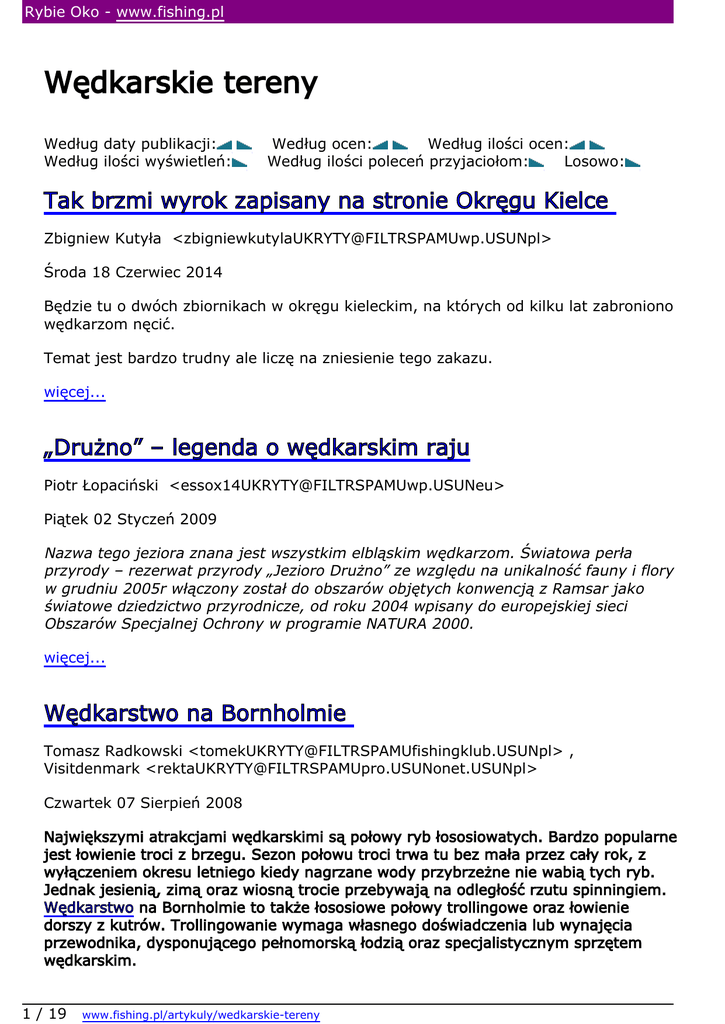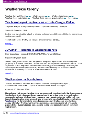 Rybie Oko - www.fishing.pl Wędkarskie tereny Według daty publikacji: Według ilości wyświetleń: Według ocen: Według ilości ocen: Według ilości poleceń przyjaciołom: Losowo: Tak brzmi wyrok zapisany na stronie Okręgu Kielce Zbigniew Kutyła <[email protected]> Środa 18 Czerwiec 2014 Będzie tu o dwóch zbiornikach w okręgu kieleckim, na których od kilku lat zabroniono wędkarzom nęcić. Temat jest bardzo trudny ale liczę na zniesienie tego zakazu. więcej... „Drużno” – legenda o wędkarskim raju Piotr Łopaciński <[email protected]> Piątek 02 Styczeń 2009 Nazwa tego jeziora znana jest wszystkim elbląskim wędkarzom. Światowa perła przyrody – rezerwat przyrody „Jezioro Drużno” ze względu na unikalność fauny i flory w grudniu 2005r włączony został do obszarów objętych konwencją z Ramsar jako światowe dziedzictwo przyrodnicze, od roku 2004 wpisany do europejskiej sieci Obszarów Specjalnej Ochrony w programie NATURA 2000. więcej... Wędkarstwo na Bornholmie Tomasz Radkowski <[email protected]> , Visitdenmark <[email protected]> Czwartek 07 Sierpień 2008 Największymi atrakcjami wędkarskimi są połowy ryb łososiowatych. Bardzo popularne jest łowienie troci z brzegu. Sezon połowu troci trwa tu bez mała przez cały rok, z wyłączeniem okresu letniego kiedy nagrzane wody przybrzeżne nie wabią tych ryb. Jednak jesienią, zimą oraz wiosną trocie przebywają na odległość rzutu spinningiem. Wędkarstwo na Bornholmie to także łososiowe połowy trollingowe oraz łowienie dorszy z kutrów. Trollingowanie wymaga własnego doświadczenia lub wynajęcia przewodnika, dysponującego pełnomorską łodzią oraz specjalistycznym sprzętem wędkarskim. 1 / 19 www.fishing.pl/artykuly/wedkarskie-tereny Rybie Oko - www.fishing.pl więcej... Bliska Szwecja - Getno Gard - Asnen Piotr Wawrzyniuk Sobota 22 Marzec 2008 Załączam kilka informacji dotyczących sprostowania wcześniejszego artykułu dotyczącego sportowego łowienia ryb w jeziorze Asnen. więcej... Rzeczka (czyli prosto z lamusa) Sławek Rybicki Wtorek 07 Sierpień 2007 Mam "swoją" rzeczkę. Nie, nie dlatego że ją wykupiłem, ale dlatego że ją lubię. więcej... Wędkuję na Prośnie elel22 elel22 Poniedziałek 23 Lipiec 2007 Przez moje rodzinne miasto- Kalisz przepływa rzeka Prosna. więcej... Łowiska specjalne cz.II Ryszard Siejakowski 2 / 19 www.fishing.pl/artykuly/wedkarskie-tereny Rybie Oko - www.fishing.pl Poniedziałek 23 Lipiec 2007 Kończąc pierwszą część artykułu „Łowiska specjalne”, postawiłem na końcu trzy literki cdn. To jest druga część mojego spojrzenia na problem łowisk specjalnych i „łowisk specjalnych”. W przygotowaniu część III :-) więcej... Łowiska specjalne cz.III Ryszard Siejakowski Poniedziałek 23 Lipiec 2007 Po dwóch odcinkach, pora na trzeci. Tym razem trochę porównań i subiektywnych ocen autora tekstu. Jest oczywistym, że moje spostrzeżenia będą w sprzeczności z opiniami innych. Zwłaszcza osób bezpośrednio zainteresowanych tematem z takich czy innych racji. więcej... Łowiska specjalne Ryszard Siejakowski Poniedziałek 23 Lipiec 2007 Gdy równo dwa lata temu, pisałem dla starego RO, dwuczęściowy artykuł pt. „Poza rok 2010”, pisałem go w odruchu protestu i sarkazmu na zjawiska, jakie występowały i miały charakter jednostkowy.. Pamiętam dwa komentarze do tego artykułu. Jeden Sławka Rybickiego, że jestem optymistą, bo opisane „łowiska specjalne” staną się 3 / 19 www.fishing.pl/artykuly/wedkarskie-tereny Rybie Oko - www.fishing.pl powszechnością znacznie wcześniej. I drugi, utrzymany w tonie, aby nam taka zagłada idei wędkarskiej, nigdy nie zagroziła. Dzisiaj wiem, że to, co wyśmiewałem, staje się rzeczywistością, niestety…. więcej... Sandomierz i dryga Zbigniew Kutyła Niedziela 26 Wrzesień 2004 Coś, co dzieje się naprawdę. więcej... Następna » 1 2 3 Ostatnie wypowiedzi Zakaz nęcenia - wyrok Po za tym Wojciech Łęcki 09.07.2014 10:12 Argumentacja szczerze oburzonego, że jak płaci składki, to on tu jest najważniejszy i ma być pod niego, a najlepiej tak jak było "zawsze". Jest argumentacją, rozkapryszonego dziecka i co najwyżej śmieszna. Zakaz nęcenia - wyrok O co chodzi. 4 / 19 www.fishing.pl/artykuly/wedkarskie-tereny Rybie Oko - www.fishing.pl Wojciech Łęcki 08.07.2014 10:18 Pozwoliłem sobie z uwagą przeczytać ten tekst. Zacząłem się zastanawiać, o co tak naprawdę chodzi. Może od początku. Tu zwracam się do kolegi, który umieścił ten artykuł i pozwolił sobie na słowo wstępu. Drogi kolego jako redaktor powinien być kolega bardziej konkretny i "pełny" w opisie słowa wstępnego. Już na początku jakoś w moim rozumieniu wybija się nastawienie czytelnika niepozytywnie do decyzji PZW. Napisał kolega, w tym, że wstępie, że opłacający kartę w innym okręgu nie mogą łowić na tym zbiorniku. I kropka. Co jest nie prawdziwe. Można łowić.Należy jedynie wnieś oczywiście dodatkową opłatę za wędkowanie w innym okręgu lub wykupując tzw. dniówkę. Nie będę dalej punktował, aby nie zostać uznanym za "czepiacza" i badacza pisma świętego. Jednak zawłaszcza w przypadku kolegi obowiązuje pełen obiektywizm i rzetelność. Co do skargi wędkarzy na zakaz i ograniczenia dotyczący nęcenia, to bicie w dzwony z tej przyczyny i pisanie, że zakaz nęcenia to zamach na wolność, tradycje i wartości jest dużą przesadą jak i niesie ze sobą nutę histerii. Nikt nikomu nie ograniczył możliwości przebywania nad wodą, korzystania z rekreacji i realizowania pasji. W obecnych czasach powstało w Polsce wiele łowisk specjalnych na rzekach jak i zbiornikach. Wprowadzono zasady "no kill", obowiązek stosowania haków bezzadziorowych, bezwęzłowych siatek limitowanych "wyjść na wodę" itp. Przyszły zmiany i ze względu na coraz bardziej zmniejszającą się ilość dostępnych łowisk, należy się spodziewać większych ogranicz