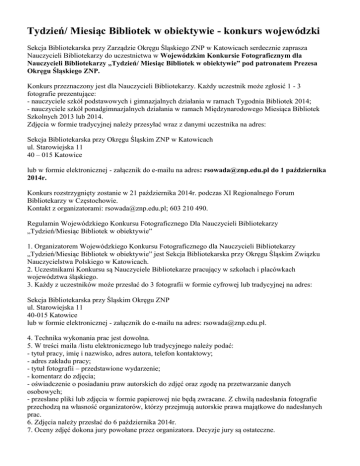 Tydzień/ Miesiąc Bibliotek w obiektywie - konkurs wojewódzki Sekcja Bibliotekarska przy Zarządzie Okręgu Śląskiego ZNP w Katowicach serdecznie zaprasza Nauczycieli Bibliotekarzy do uczestnictwa w Wojewódzkim Konkursie Fotograficznym dla Nauczycieli Bibliotekarzy „Tydzień/ Miesiąc Bibliotek w obiektywie” pod patronatem Prezesa Okręgu Śląskiego ZNP. Konkurs przeznaczony jest dla Nauczycieli Bibliotekarzy. Każdy uczestnik może zgłosić 1 - 3 fotografie prezentujące: - nauczyciele szkół podstawowych i gimnazjalnych działania w ramach Tygodnia Bibliotek 2014; - nauczyciele szkół ponadgimnazjalnych działania w ramach Międzynarodowego Miesiąca Bibliotek Szkolnych 2013 lub 2014. Zdjęcia w formie tradycyjnej należy przesyłać wraz z danymi uczestnika na adres: Sekcja Bibliotekarska przy Okręgu Śląskim ZNP w Katowicach ul. Starowiejska 11 40 – 015 Katowice lub w formie elektronicznej - załącznik do e-mailu na adres: [email protected] do 1 października 2014r. Konkurs rozstrzygnięty zostanie w 21 października 2014r. podczas XI Regionalnego Forum Bibliotekarzy w Częstochowie. Kontakt z organizatorami: [email protected]; 603 210 490. Regulamin Wojewódzkiego Konkursu Fotograficznego Dla Nauczycieli Bibliotekarzy „Tydzień/Miesiąc Bibliotek w obiektywie” 1. Organizatorem Wojewódzkiego Konkursu Fotograficznego dla Nauczycieli Bibliotekarzy „Tydzień/Miesiąc Bibliotek w obiektywie” jest Sekcja Bibliotekarska przy Okręgu Śląskim Związku Nauczycielstwa Polskiego w Katowicach. 2. Uczestnikami Konkursu są Nauczyciele Bibliotekarze pracujący w szkołach i placówkach województwa śląskiego. 3. Każdy z uczestników może przesłać do 3 fotografii w formie cyfrowej lub tradycyjnej na adres: Sekcja Bibliotekarska przy Śląskim Okręgu ZNP ul. Starowiejska 11 40-015 Katowice lub w formie elektronicznej - załącznik do e-mailu na adres: [email protected]. 4. Technika wykonania prac jest dowolna. 5. W treści maila /listu elektronicznego lub tradycyjnego należy podać: - tytuł pracy, imię i nazwisko, adres autora, telefon kontaktowy; - adres zakładu pracy; - tytuł fotografii – przedstawione wydarzenie; - komentarz do zdjęcia; - oświadczenie o posiadaniu praw autorskich do zdjęć oraz zgodę na przetwarzanie danych osobowych; - przesłane pliki lub zdjęcia w formie papierowej nie będą zwracane. Z chwilą nadesłania fotografie przechodzą na własność organizatorów, którzy przejmują autorskie prawa majątkowe do nadesłanych prac. 6. Zdjęcia należy przesłać do 6 października 2014r. 7. Oceny zdjęć dokona jury powołane przez organizatora. Decyzje jury są ostateczne. 8. Konkurs rozstrzygnięty zostanie w 21 października 2014r. podczas XI Regionalnego Forum Bibliotekarzy w Częstochowie. 9. Wszyscy laureaci zostaną powiadomieni o werdykcie jury. 10. Udział w konkursie jest jednoznaczny z nieodpłatnym udzieleniem prawa do nieodpłatnego wykorzystywania prac w następujących polach eksploatacji: druku w dowolnej liczbie publikacji i w dowolnym nakładzie, używania ich w Internecie oraz w innych formach utrwaleń, nadających się do rozpowszechniania. 11. Nadesłanie prac oznacza akceptację warunków konkursu i regulaminu, którego ostateczna interpretacja należy do jury konkursu. Żadne odwołania nie zostaną uwzględnione. 12. Organizator zastrzega sobie prawo do przerwania lub odwołania konkursu. 13. Udział w konkursie jest równoznaczny z wyrażeniem przez osoby uczestniczące zgody na przetwarzanie przez organizatora ich danych osobowych na potrzeby konkursu oraz w celach marketingowych organizatora/ustawa o ochronie danych osobowych z dn.29.08.1997r. Dz. U. Nr 133 poz.833 z póz. zm./. Osoby uczestniczące w konkursie potwierdzają swoją zgodę na powyższe w formie przesłania do organizatora oświadczenia.