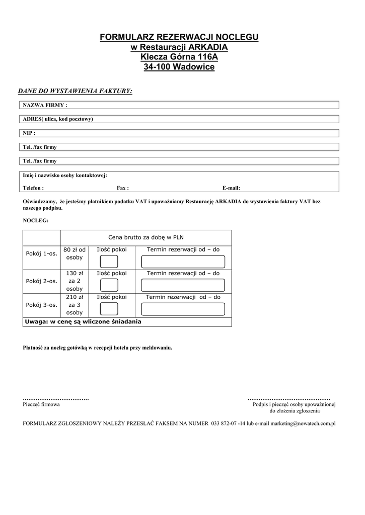 FORMULARZ REZERWACJI NOCLEGU w Restauracji ARKADIA Klecza Górna 116A 34-100 Wadowice DANE DO WYSTAWIENIA FAKTURY: NAZWA FIRMY : ADRES( ulica, kod pocztowy) NIP : Tel. /fax firmy Tel. /fax firmy Imię i nazwisko osoby kontaktowej: Telefon : Fax : E-mail: Oświadczamy, że jesteśmy płatnikiem podatku VAT i upoważniamy Restaurację ARKADIA do wystawienia faktury VAT bez naszego podpisu. NOCLEG: Cena brutto za dobę w PLN Pokój 1-os. 80 zł od osoby Ilość pokoi Termin rezerwacji od – do 130 zł za 2 osoby Ilość pokoi Termin rezerwacji od – do Pokój 2-os. 210 zł za 3 osoby Ilość pokoi Termin rezerwacji od – do Pokój 3-os. Uwaga: w cenę są wliczone śniadania Płatność za nocleg gotówką w recepcji hotelu przy meldowaniu. ……………………………… Pieczęć firmowa ……………………………………… Podpis i pieczęć osoby upoważnionej do złożenia zgłoszenia FORMULARZ ZGŁOSZENIOWY NALEŻY PRZESŁAĆ FAKSEM NA NUMER 033 872-07 -14 lub e-mail [email protected]