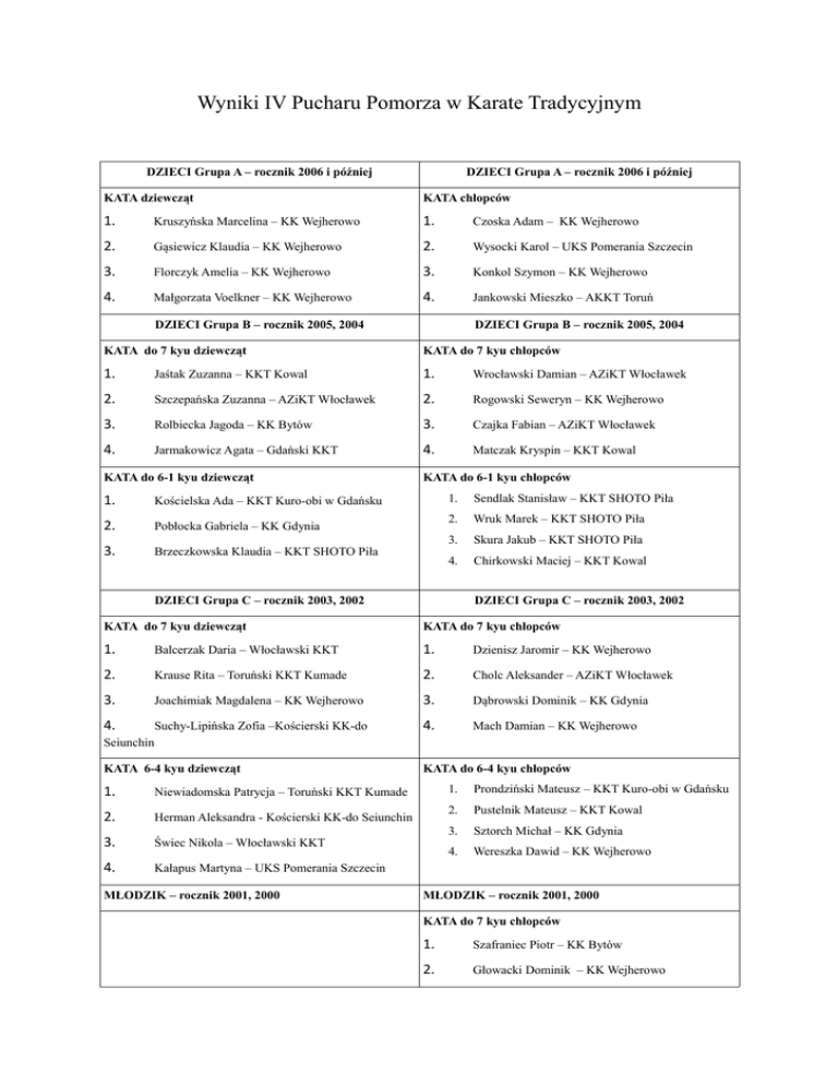 Wyniki IV Pucharu Pomorza w Karate Tradycyjnym DZIECI Grupa A – rocznik 2006 i później DZIECI Grupa A – rocznik 2006 i później KATA dziewcząt KATA chłopców 1. Kruszyńska Marcelina – KK Wejherowo 1. Czoska Adam – KK Wejherowo 2. Gąsiewicz Klaudia – KK Wejherowo 2. Wysocki Karol – UKS Pomerania Szczecin 3. Florczyk Amelia – KK Wejherowo 3. Konkol Szymon – KK Wejherowo 4. Małgorzata Voelkner – KK Wejherowo 4. Jankowski Mieszko – AKKT Toruń DZIECI Grupa B – rocznik 2005, 2004 DZIECI Grupa B – rocznik 2005, 2004 KATA do 7 kyu dziewcząt KATA do 7 kyu chłopców 1. Jaśtak Zuzanna – KKT Kowal 1. Wrocławski Damian – AZiKT Włocławek 2. Szczepańska Zuzanna – AZiKT Włocławek 2. Rogowski Seweryn – KK Wejherowo 3. Rolbiecka Jagoda – KK Bytów 3. Czajka Fabian – AZiKT Włocławek 4. Jarmakowicz Agata – Gdański KKT 4. Matczak Kryspin – KKT Kowal KATA do 6-1 kyu dziewcząt 1. Kościelska Ada – KKT Kuro-obi w Gdańsku 2. Pobłocka Gabriela – KK Gdynia 3. Brzeczkowska Klaudia – KKT SHOTO Piła KATA do 6-1 kyu chłopców 1. Sendlak Stanisław – KKT SHOTO Piła 2. Wruk Marek – KKT SHOTO Piła 3. Skura Jakub – KKT SHOTO Piła 4. Chirkowski Maciej – KKT Kowal DZIECI Grupa C – rocznik 2003, 2002 DZIECI Grupa C – rocznik 2003, 2002 KATA do 7 kyu dziewcząt KATA do 7 kyu chłopców 1. Balcerzak Daria – Włocławski KKT 1. Dzienisz Jaromir – KK Wejherowo 2. Krause Rita – Toruński KKT Kumade 2. Cholc Aleksander – AZiKT Włocławek 3. Joachimiak Magdalena – KK Wejherowo 3. Dąbrowski Dominik – KK Gdynia 4. Suchy-Lipińska Zofia –Kościerski KK-do 4. Mach Damian – KK Wejherowo Seiunchin KATA 6-4 kyu dziewcząt 1. Niewiadomska Patrycja – Toruński KKT Kumade 2. Herman Aleksandra - Kościerski KK-do Seiunchin 3. Świec Nikola – Włocławski KKT 4. Kałapus Martyna – UKS Pomerania Szczecin MŁODZIK – rocznik 2001, 2000 KATA do 6-4 kyu chłopców 1. Prondziński Mateusz – KKT Kuro-obi w Gdańsku 2. Pustelnik Mateusz – KKT Kowal 3. Sztorch Michał – KK Gdynia 4. Wereszka Dawid – KK Wejherowo MŁODZIK – rocznik 2001, 2000 KATA do 7 kyu chłopców 1. Szafraniec Piotr – KK Bytów 2. Głowacki Dominik – KK Wejherowo 3. Gospodarczyk Michał – KK Bytów 4. Lubiński Jakub – KK Bytów KATA 6 – 4 kyu dziewcząt KATA 6 – 4 kyu chłopców 1. Bulińska Natalia – AZiKT Włocławek 1. Kot Eryk – Włocławski KKT 2. Turska Natalia – Włocławski KKT 2. Majchrzak Jakub – Włocławski KKT 3. Tymburska Wiktoria – Włocławski KKT 3. Dampc Mateusz – KK Gdynia 4. Ostrowska Martyna – AZiKT Włocławek 4. Stolarski Adam – Włocławski KKT KATA 3 - 1 kyu chłopców 1. Dziwulski Dariusz – AZiKT Włocławek 2. Obiala Jakub – Toruński KKT Kumade 3. Gierszewski Dorian – Kościerski KK-do Seiunchn 4. Bottcher Błażej – Kościerski KK-do Seiunchin JUNIOR MŁODSZY – rocznik 1999, 1998 JUNIOR MŁODSZY – rocznik 1999, 1998 KATA dziewcząt KATA chłopców 1. Kochalska Magdalena – Gdański KKT 1. Algusiewicz Dawid – Toruński KKT Kumade 2. Pobłocka Julia – Kościerski KK-do Seiunchin 2. Stańczuk Mikołaj – KK Gdynia 3. Jacher Julia – AKT Koszalin 3. Jatkowski Dominik – AKT Koszalin 4. Bebel Kamil – Gdański KKT FUKU-GO dziewcząt 1. Kochalska Magdalena – Gdański KKT 2. Jacher Julia – AKT Koszalin 3. Pobłocka Julia – Kościerski KK-do Seiunchin FUKU-GO chłopców 1. Algusiewicz Dawid – Toruński KKT Kumade 2. Stańczuk Mikołaj – KK Gdynia 3. Wesołowski Adam – KK Gdynia 4. Kowalewski Błażej – KK Gdynia KUMITE dziewcząt KUMITE chłopców 1. Kochalska Magdalena – Gdański KKT 1. Wesołowski Adam – KK Gdynia 2. Pobłocka Julia – Kościerski KK-do Seiunchin 2. Ciesiński Michał – AKKT Toruń Jacher Julia – AKT Koszalin 3. Algusiewicz Dawid – Toruński KKT Kumade 4. Kowalewski Błażej – KK Gdynia 3. JUNIOR – rocznik 1997, 1996 JUNIOR – rocznik 1997, 1996 KATA chłopców 1. Leśko Bartosz – KKT Gdynia 2. Lotka Kacper – KKT Gdynia 3. Lotka Jakub – KKT Gdynia 4. Suchecki Oskar – KK Gdynia FUKU-GO chłopców 1. Leśko Bartosz – KKT Gdynia 2. Lotka Jakub – KKT Gdynia 3. Lotka Kacper – KKT Gdynia 4. Dąbrowski Błażej – AKKT Toruń KUMITE chłopców MŁODZIEŻOWIEC – rocznik 1995, 1994, 1993 1. Leśko Bartosz – KKT Gdynia 2. Suchecki Oskar – KK Gdynia 3. Lotka Kacper – KKT Gdynia 4. Lotka Jakub – KKT Gdynia MŁODZIEŻOWIEC – rocznik 1995, 1994, 1993 KATA kobiet 1. Maria Magdalena Mielnik – Kościerski KK-do Seiuchin 2. Szpak Aleksandra – Toruński KKT Kumade 3. Ciesińska Małgorzata – AKKT Toruń 4. Wilk Daria – KKT SHOTO Piła FUKU-GO kobiet 1. Maria Magdalena Mielnik – Kościerski KK-do Seiuchin 2. Szpak Aleksandra – Toruński KKT Kumade 3. Ciesińska Małgorzata – AKKT Toruń 4. Wiktorowicz Róża – KKT Gdynia KUMITE kobiet 1. Maria Magdalena Mielnik – Kościerski KK-do Seiuchin 2. Szpak Aleksandra – Toruński KKT Kumade 3. Ciesińska Małgorzata – AKKT Toruń 4. Wiktorowicz Róża – KKT Gdynia SENIOR – rocznik 1992 i starsi SENIOR – rocznik 1992 i starsi KATA mężczyzn 1. Wardencki Kamil – Toruński KKT Kumade 2. Konieczny Tomasz – KK Gdynia 3. Sobiechowski Eryk – Toruński KKT Kumade 4. Bierecki Dominik – PAKT Gdynia FUKU-GO mężczyzn 1. Bierecki Dominik – PAKT Gdynia 2. Konieczny Tomasz – KK Gdynia 3. Miszkurka Michał – Toruński KKT Kumade 4. Wardencki Kamil – Toruński KKT Kumade KUMITE mężczyzn 1. Konieczny Tomasz – KK Gdynia 2. Bierecki Dominik – PAKT Gdynia 3. Sobiechowski Eryk – Toruński KKT Kumade KLASYFIKACJA: LP KLUBY 1 2 3 4 PUNKTACJA 1 Karate Klub Bytów 1 - 2 1 9 2 Karate Klub Gdynia 2 6 4 3 37 3 Klub Karate Tradycyjnego Gdynia 3 2 3 3 27 4 Gdański Klub Karate Tradycyjnego 3 - - 2 14 5 Klub Karate Tradycyjnego „Kuro-obi” – Gdańsk, 2 - - - 8 6 Kościerski Klub Karate-do „Seiunchin” 3 3 2 2 27 7 Karate Klub Wejherowo 3 3 3 3 28 8 Pomorska Akademia