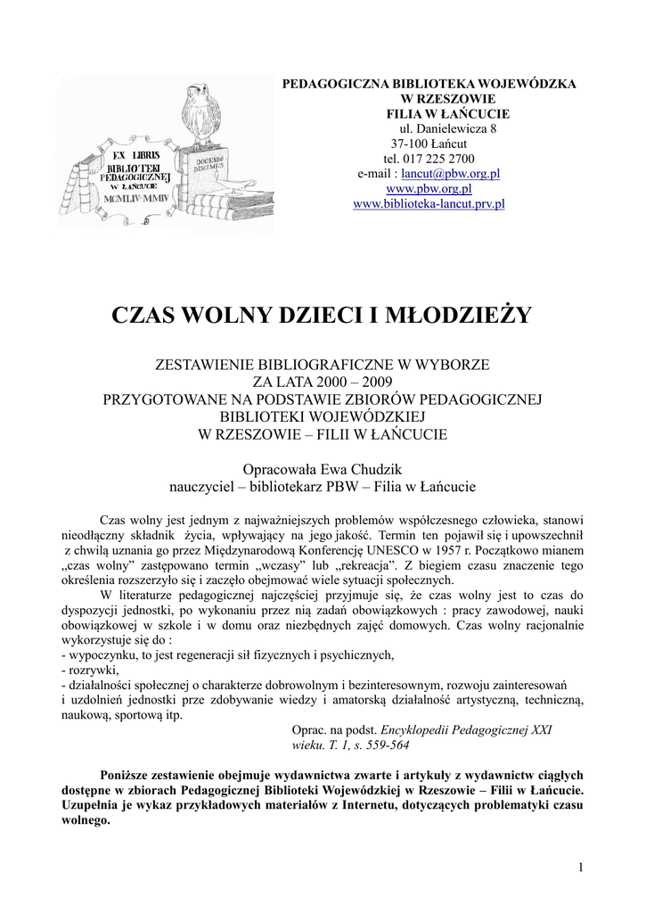 PEDAGOGICZNA BIBLIOTEKA WOJEWÓDZKA W RZESZOWIE FILIA W ŁAŃCUCIE ul. Danielewicza 8 37-100 Łańcut tel. 017 225 2700 e-mail : [email protected] www.pbw.org.pl www.biblioteka-lancut.prv.pl CZAS WOLNY DZIECI I MŁODZIEŻY ZESTAWIENIE BIBLIOGRAFICZNE W WYBORZE ZA LATA 2000 – 2009 PRZYGOTOWANE NA PODSTAWIE ZBIORÓW PEDAGOGICZNEJ BIBLIOTEKI WOJEWÓDZKIEJ W RZESZOWIE – FILII W ŁAŃCUCIE Opracowała Ewa Chudzik nauczyciel – bibliotekarz PBW – Filia w Łańcucie Czas wolny jest jednym z najważniejszych problemów współczesnego człowieka, stanowi nieodłączny składnik życia, wpływający na jego jakość. Termin ten pojawił się i upowszechnił z chwilą uznania go przez Międzynarodową Konferencję UNESCO w 1957 r. Początkowo mianem „czas wolny” zastępowano termin „wczasy” lub „rekreacja”. Z biegiem czasu znaczenie tego określenia rozszerzyło się i zaczęło obejmować wiele sytuacji społecznych. W literaturze pedagogicznej najczęściej przyjmuje się, że czas wolny jest to czas do dyspozycji jednostki, po wykonaniu przez nią zadań obowiązkowych : pracy zawodowej, nauki obowiązkowej w szkole i w domu oraz niezbędnych zajęć domowych. Czas wolny racjonalnie wykorzystuje się do : - wypoczynku, to jest regeneracji sił fizycznych i psychicznych, - rozrywki, - działalności społecznej o charakterze dobrowolnym i bezinteresownym, rozwoju zainteresowań i uzdolnień jednostki prze zdobywanie wiedzy i amatorską działalność artystyczną, techniczną, naukową, sportową itp. Oprac. na podst. Encyklopedii Pedagogicznej XXI wieku. T. 1, s. 559-564 Poniższe zestawienie obejmuje wydawnictwa zwarte i artykuły z wydawnictw ciągłych dostępne w zbiorach Pedagogicznej Biblioteki Wojewódzkiej w Rzeszowie – Filii w Łańcucie. Uzupełnia je wykaz przykładowych materiałów z Internetu, dotyczących problematyki czasu wolnego. 1 WYDAWNICTWA ZWARTE 1. CZEREPANIAK-WALCZAK, Maria Od próżniaczenia do zniewolenia – w poszukiwaniu dyskursu czasu wolnego // W: Pedagogika społeczna : podręcznik akademicki. T. 2, Debata / red. nauk. Ewa Marynowicz-Hetka. Warszawa : Wydaw. Naukowe PWN, 2007. – s. 219-236 2. CZEREPANIAK-WALCZAK, Maria Wychowanie do czasu wolnego : poszukiwanie miejsca dla homo ludens w świecie homo faber // W: Wychowanie : pojęcia, procesy, konteksty : interdyscyplinarne ujęcie. T. 2 / red. nauk. Maria Dudzikowa, Maria Czerepaniak-Walczak. Gdańsk : Gdańskie Towarzystwo Psychologiczne, 2007. – s. 303-323, bibliogr. 3. KRETSCHMANN, Rudolf Stres w zawodzie nauczyciela / Rudolf Kretschmann, Kornelia Kirschner. - Gdańsk : Gdańskie Wydawnictwo Psychologiczne, 2003. - s. 46-61 : Między rodziną, czasem wolnym a przygotowaniami 4. MATYJAS, Bożena Czas wolny / Bożena Matyjas // W : Encyklopedia Pedagogiczna XXI wieku. T. 1, A-F / red. Ewa Różycka [i in.]. – Wydawnictwo Akademickie „Żak”, 2003. – s. 559-564 5. ORŁOWSKA, Małgorzata Problemy czasu wolnego w pedagogice społecznej // W: Pedagogika społeczna : dokonania : aktualność : perspektywy : podręcznik akademicki dla pedagogów / koncepcja i red. nauk. Stanisław Kawula. Toruń : Wydawnictwo Adam Marszałek, 2007. – s. 581-598, bibliogr. 6. PIĘTA, Jan Pedagogika czasu wolnego / Jan Pięta. - Warszawa : Wyższa Szkoła Ekonomiczna, 2004. – 272 s. 7. PIĘTA, Jan Pedagogika czasu wolnego / Jan Pieta. – Wyd. 2. - Warszawa : Wyższa Szkoła Ekonomiczna, 2008. – 272 s. 8. SOKOŁOWSKA – DZIOBA, Teresa Formy aktywności młodzieży w czasie wolnym // W : Aktywność dzieci i młodzieży / red. Sabina Guz, Teresa Sokołowska – Dzioba, Andrzej Pilecki. - Warszawa : WSP TWP, 2008. s. 187– 194, bibliogr. 9. ŻUKOWSKA, Hanna Czas wolny studentów // W: Wychowanie fizyczne : sport dzieci i młodzieży / pod red. A. Michalskiego, M. Napierały, M. Zasady. - Bydgoszcz : Akademia Bydgoska, 2005. – s. 90-95 ARTYKUŁY Z WYDAWNICTW CIĄGŁYCH 1. AKTYWNOŚĆ fizyczna w stylu życia dzieci w wieku 10-13 lat w środowisku małomiejskim / Maria Gacek // Kultura Fizyczna. – 2007, nr 3/4, s. 16-18 2. AKTYWNOŚĆ fizyczna w stylu życia studentek krakowskich uczelni / Urszula Miązek // Wychowanie Fizyczne i Zdrowotne. – 2005, nr 3, s. 12-19 2 3. AKTYWNOŚĆ ruchowa dzieci w czasie wolnym / Katarzyna Sępowicz – Buczko // Wychowanie Fizyczne i Zdrowotne. – 2003, nr 12, s 32-35 4. AKTYWNOŚĆ ruchowa dziewcząt w czasie wolnym – kończących naukę w szkołach ponadgimnazjalnych / Gabriela Karkoszka, Violetta Kozik, Danuta Palica // Wychowanie Fizyczne i Zdrowotne. – 2008, nr 10, s. 30-33 5. AKTYWNOŚĆ ruchowa młodzieży gimnazjalnej w czasie wolnym od nauki / Ewa Mędrala Kuder // Kultura Fizyczna. – 2007, nr 3/4, s. 19-20 6. AKTYWNOŚĆ ruchowa młodzieży w czasie wolnym : preferencje – bariery – uwarunkowania / Adam Jurczak // Wychowanie Fizyczne i Zdrowotne. – 2005, nr 12, s. 25-30 7. AKTYWNOŚĆ ruchowa nauczycieli w czasie wolnym / Grażyna Kosiba // Wychowanie Fizyczne i Sport. – 2006, nr 3, s. 151-156, bibliogr. 8. AKTYWNY wypoczynek nad wodą / Aldona Zawalska, Krzysztof Zawalski // Wychowanie Fizyczne i Zdrowotne. - 2004, nr 8-9, dod. s. 2-5 9. ALEKSANDER Kamiński kreatorem samorealizowania się młodzieży w aktywnych formach wypoczynku / Zofia Żukowska // Wychowanie Fizyczne i Zdrowotne. - 2003, nr 4, s. 4-7 10. ASPIRACJE wolnoczasowe młodzieży / Kinga Musialska // Opieka, Wychowanie, Terapia. 2009, nr 1-2, s. 64-65 11. CO robi uczeń w czasie wolnym? / Małgorzata Hamada // Wychowawca. - 2003, nr 7-8, s. 31-33 12. CZAS wolny / Leszek Kołosiński // Wychowawca. – 2007, nr 4, s. 14 13. CZAS wolny / Lidia Lebioda // Wychowawca. - 2004, nr 7-8, s. 17 14. CZAS wolny a bezpieczeństwo dziecka / Joanna Karczewska // Nauczanie Początkowe. – 2008/ 2009, nr 1, s. 7-14 15. CZAS wolny a zachowania ryzykowne młodzieży/ Ryszard Bobrowski // Alkoholizm i Narkomania. – 2007, nr 3, s. 267-287, bibliogr. 16. CZAS wolny, czas stracony / Małgorza