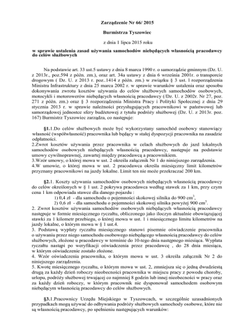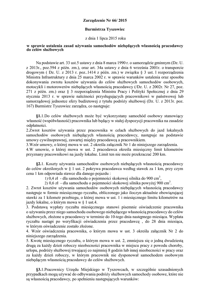 Zarządzenie Nr 66/ 2015 Burmistrza Tyszowiec z dnia 1 lipca 2015 roku w sprawie ustalenia zasad uŜywania samochodów niebędących własnością pracodawcy do celów słuŜbowych Na podstawie art. 33 ust.5 ustawy z dnia 8 marca 1990 r. o samorządzie gminnym (Dz. U. z 2013r., poz.594 z późn. zm.), oraz art. 34a ustawy z dnia 6 września 2001r. o transporcie drogowym ( Dz. U. z 2013 r. poz..1414 z późn. zm.) w związku § 3 ust. l rozporządzenia Ministra Infrastruktury z dnia 25 marca 2002 r. w sprawie warunków ustalenia oraz sposobu dokonywania zwrotu kosztów uŜywania do celów słuŜbowych samochodów osobowych, motocykli i motorowerów niebędących własnością pracodawcy (/Dz. U. z 2002r. Nr 27, poz. 271 z późn. zm.) oraz § 3 rozporządzenia Ministra Pracy i Polityki Społecznej z dnia 29 stycznia 2013 r. w sprawie naleŜności przysługujących pracownikowi w państwowej lub samorządowej jednostce sfery budŜetowej z tytułu podróŜy słuŜbowej (Dz. U. z 2013r. poz. 167) Burmistrz Tyszowiec zarządza, co następuje: §1.1.Do celów słuŜbowych moŜe być wykorzystany samochód osobowy stanowiący własność (współwłasność) pracownika lub będący w stałej dyspozycji pracownika na zasadzie odpłatności. 2.Zwrot kosztów uŜywania przez pracownika w celach słuŜbowych do jazd lokalnych samochodów osobowych niebędących własnością pracodawcy, następuje na podstawie umowy cywilnoprawnej, zawartej między pracodawcą a pracownikiem. 3.Wzór umowy, o której mowa w ust. 2 określa załącznik Nr 1 do niniejszego zarządzenia. 4.W umowie, o której mowa w ust. 2 pracodawca określa miesięczny limit kilometrów przyznany pracownikowi na jazdy lokalne. Limit ten nie moŜe przekraczać 200 km. §2.1. Koszty uŜywania samochodów osobowych niebędących własnością pracodawcy do celów określonych w § 1 ust. 2 pokrywa pracodawca według stawek za 1 km, przy czym cena 1 km odpowiada stawce dla danego pojazdu : 1) 0,4 zł - dla samochodu o pojemności skokowej silnika do 900 cm3, 2) 0,6 zł - dla samochodu o pojemności skokowej silnika powyŜej 900 cm3. 2. Zwrot kosztów uŜywania samochodów osobowych niebędących własnością pracodawcy następuje w formie miesięcznego ryczałtu, obliczonego jako iloczyn aktualnie obowiązującej stawki za 1 kilometr przebiegu, o której mowa w ust. 1 i miesięcznego limitu kilometrów na jazdy lokalne, o którym mowa w § 1 ust.4. 3. Podstawą wypłaty ryczałtu miesięcznego stanowi pisemnie oświadczenie pracownika o uŜywaniu przez niego samochodu osobowego niebędącego własnością pracodawcy do celów słuŜbowych, złoŜone u pracodawcy w terminie do 10-tego dnia następnego miesiąca. Wypłata ryczałtu nastąpi po weryfikacji oświadczenia przez pracodawcę , do 28 dnia miesiąca, w którym oświadczenie zostało złoŜone. 4. Wzór oświadczenia pracownika, o którym mowa w ust. 3 określa załącznik Nr 2 do niniejszego zarządzenia. 5. Kwotę miesięcznego ryczałtu, o którym mowa w ust. 2, zmniejsza się o jedną dwudziestą drugą za kaŜdy dzień roboczy nieobecności pracownika w miejscu pracy z powodu choroby, urlopu, podróŜy słuŜbowej trwającej co najmniej 8 godzin lub innej nieobecności w pracy oraz za kaŜdy dzień roboczy, w którym pracownik nie dysponował samochodem osobowym niebędącym własnością pracodawcy do celów słuŜbowych. §3.1.Pracownicy Urzędu Miejskiego w Tyszowcach, w szczególnie uzasadnionych przypadkach mogą uŜywać do odbywania podróŜy słuŜbowych samochody osobowe, które nie są własnością pracodawcy, po spełnieniu następujących warunków: a) przed rozpoczęciem podróŜy słuŜbowej złoŜą pisemny wniosek o wyraŜenie zgody na uŜywanie do odbywania podróŜy słuŜbowych samochodów, które nie są własnością pracodawcy ( wzór wniosku stanowi załącznik nr 3 do niniejszego zarządzenia), b) uzyskają zgodę pracodawcy na odbycie podróŜy słuŜbowej samochodem niebędącym własnością pracodawcy. 2. Pracodawca nie odpowiada wobec pracownika za poniesioną przez niego szkodę w związku z uŜywaniem samochodu prywatnego do celów słuŜbowych. 3. Zwrot kosztów przejazdu w podróŜy słuŜbowej samochodem niestanowiącym własności pracodawcy następować będzie na podstawie polecenia wyjazdu słuŜbowego w wysokości wynikającej z przemnoŜenia ilości przejechanych kilometrów oraz stawki za jeden kilometr przebiegu, określonej w § 2 ust. 1. niniejszego Zarządzenia. 4. Pracownik zobowiązany jest do złoŜenia dokumentów stanowiących podstawę rozliczenia kosztów podróŜy słuŜbowej w terminie 14 dni od dnia zakończenia tej podróŜy. §4.Wykonanie zarządzenia powierzam Sekretarzowi Gminy. §5.Traci moc Zarządzenie Nr 151/ 2012 Burmistrza Tyszowiec z dnia 13 listopada 2012 roku w sprawie ustalenia stawek za 1 kilometr przebiegu pojazdu niebędącego własnością pracodawcy uŜywanego do celów słuŜbowych. §6. Zarządzenie wchodzi w Ŝycie z dniem podpisania. Załącznik Nr 1 do Zarządzenia Nr 66/2015 Burmistrza Tyszowiec z dnia 1 lipca 2015 r. UMOWA nr........... o uŜywanie pojazdu prywatnego do celów słuŜbowych Zawarta w dniu ..........................w Tyszowcach pomiędzy : Urzędem Miejskim w Tyszowcach reprezentowanym przez Burmistrza Tyszowiec – Pana Mariusza Zająca zwanego dalej w umowie Pracodawcą, a Panem/ Panią .......................... zamieszkał/ym/ą w......................................................................... zwanym/ą dalej Pracownikiem, o następującej treści: § 1.1. Pracownik oświadcza, Ŝe jest właścicielem / współwłaścicielem/ uŜytkownikiem samochodu osobowego marki ................................. o poj. skokowej silnika ... cm 3, nr rejestracyjny ......... zwanym dalej w umowie samochodem prywatnym. 2. Pracownik oświadcza, Ŝe posiada polisę OC posiadaczy pojazdów mechanicznych w zakresie prowadzenia w/w samochodu prywatnego. 3. Pracownik zobowiązuje się do 