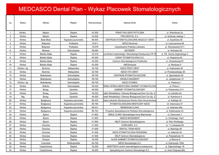 MEDCASCO Dental Plan - Wykaz Placowek Stomatologicznych Lp Status Miasto Region Kod-pocztowy Nazwa kliniki 1 Klinika Będzin Śląskie 42-500 PRAKTYKA DENTYSTYCZNA ul. Wierzbowa 2a 2 Klinika Będzin Śląskie 42-500 PRO-DENTAL S.C. ul. Królowej Jadwigi 1 3 Klinika Białe Błota Kujawsko-pomorskie 86-005 CENTRUM STOMATOLOGICZNE MAŁECCY DENT ul. Szubińska 55 4 Klinika Białystok Podlaskie 15-811 NZOZ Dentimed ul. Leszczynowa 56 5 Klinika Białystok Podlaskie 15-078 Indywidualna Praktyka Lekarska ul. Warszawska 81/1 6 Klinika Bielawa Dolnośląskie 58-260 ESTIDENT ul. Wolności 63 7 Klinika Bielsko Biała Śląskie 43-316Prywatna Klinika Implantologii i Stomatologii Estetycznej VIP DENTALul. Płk. Karola Zagórskiego 3 8 Klinika Bielsko Biała Śląskie 43-300 CARAT STOMATOLOGIA S.C. ul. Wapienna 6/I 9 Klinika Bielsko Biała Śląskie 43-300 Centrum Stomatologiczne ProDentist ul. Orzeszkowej 87 10 Klinika Bielsko Biała Śląskie 43-300 ABCDentysta ul. Mostowa 5 11 Klinika i rtg Bochnia Małopolskie 32-700 NZOZ PROFI DENT ul. Krakowska 46 12 Klinika Bochnia Małopolskie 32-700 NZOZ VITA DENT ul. Poniatowskiego 36 13 Klinika Bolesławiec Dolnośląskie 59-700 CENTRUM STOMATOLOGICZNE ul. Zgorzelecka 50 14 Klinika Bolesławiec Dolnośląskie 59-700 KEGELS MAXDENT ul. Jarzębinowa 10 15 Klinika i rtg Bolesławiec Dolnośląskie 59-700 NZOZ STOMED ul. Pasteura 1 16 Klinika Bolków Dolnośląskie 59-420RODZINNA OPIEKA MEDYCZNA GABINET STOMATOLOGICZNY 17 Klinika Brzeg Opolskie 49-300 18 Klinika Brzeg Opolskie 49-300 Ośrodek Rehabilitacji i Odnowy Biologicznej Doni Cor Sp. Z o.o. ul. Łokietka 9a 19 Rtg Brzeg Opolskie 49-300 Ośrodek Rehabilitacji i Odnowy Biologicznej Doni Cor Sp. Z o.o. ul. Kamienna 4 20 Klinika Bydgoszcz Kujawsko-pomorskie 85-433 Praktyka Lekarsko Dentystyczna Klonko Dent Anna klonkowska 21 Klinika Bydgoszcz Kujawsko-pomorskie 85-794 STOMATOLOGICZNO-MEDYCZNY NZOZ Ul. Dworcowa 47 22 Klinika Bydgoszcz Kujawsko-pomorskie 85-021 REMEDIUM CLINIC ul. Gdańska 80a 23 Klinika Bydgoszcz Kujawsko-pomorskie 85-704 Prywatna Specjalistyczna Parktyka Stomatologiczna ul. Kołobrzeska 23 24 Klinika Bytom Śląskie 41-902 SMILE CLINIC Stomatologia Anna Błachowiak ul. Dworcowa 1 25 Klinika Bytom Śląskie 41-902 NSZOZ MONODENT ul. Chrobrego 14a/1 26 Klinika Bytom Śląskie 41-900 HELP Centrum Stomatologiczne ul. Plac Wolskiego 27 Klinika Chorzów Śląskie 41-500 KORN-MED. S.C. ul. 11 Listopada 59 28 Klinika Chorzów Śląskie 41-506 DENTAL TEAM NZOZ ul. Batorego 64 29 Klinika Chorzów Śląskie 41-500 NZOZ STOMATOLOGIA RODZINNA ul. Gałeczki 30 30 Klinika Chorzów Śląskie 41-500 HELP Centrum Stomatologiczne ul. Powstańców 15 31 Klinika Cieszyn Śląskie 43-400 ALIAS GABINET STOMATOLOGICZNY ul Stroma 8 32 Klinika Czarnków Wielkopolskie 64-700 NZOZ Stomatologia S.C. ul. Kościuszki 103A 33 Klinika Częstochowa Śląskie 42-200 DENTTECH centrm stomatologiczno-protetyczne ul. Dąbrowskiego 18 34 Klinika Częstochowa Śląskie 42-200 Specjalistyczne Centrum Stomatologii S.C. ul. Armii Krajowej 68a GABINET STOMATOLOGICZNY Adres ul. Polna 2 ul. Piastowska 31/1 ul. Kolbego 30 35 Klinika Dąbrowa Górnicza Śląskie 41-300NZOZ CENTRUM MEDYCZNE REDEN MAYO-DENT BRA.MAJ S.C. 36 Klinika Dąbrowa Górnicza Śląskie 41-300 NZOZ PERFECT ul. Sobieskiego 7b 37 Klinika Dąbrowa Górnicza Śląskie 41-303 NZOZ PERFECT ul. Kasprzaka 4 38 Klinika Dębica Podkarpackie 39-200 APDENT ul. Krakowska 83 A 39 Klinika Dębica Podkarpackie 39-200 PRAKTYKA STOMATOLOGICZNA ul. Słowackiego 8 40 Klinika Dzierżoniów Dolnośląskie 58-200 NZOZ MAJDENT Oś. Tęczowe 10H 41 Klinika Gdańsk Pomorskie 80-390 Indywidualna Praktyka Stomatologiczna Lek. Stom. Monika Pietruszka - Talleux ul. Kołobrzeska 23 H 42 Klinika Gdańsk Pomorskie 80-835 43 Klinika Gdańsk Pomorskie 80-177 SOWDENT Gabinet Stomatologiczny ul. Damroki 1/ paw F1A 44 Klinika Gdańsk Pomorskie 80-283 NZOZ Stomed Przychodnia Stomatologiczno - Lekarska ul. Morenowe Wzgórze 4/4 45 Klinika Gdańsk Pomorskie 80-850 PRODENT Orszula Odya, Ewa Odya - Bojanowska S.C. ul. Rajska 10 46 Klinika Gdańsk Pomorskie 80-299 ISPL Gabinet Stomatologiczny ul. Cumowników 4a 47 Klinika Gdańsk Pomorskie 80-107 Indywidualna specjalistyczna prak. lek. ul. Milczewskiego 17 48 Klinika i rtg Gdańsk Pomorskie 80-257 FAN-DENT Specjalistyczny ul. Słowackiego 71/2 49 Klinika Gdańsk Pomorskie 80-283 IPL lek. Stom. Katarzyna Kotkowska ul. Morenowe Wzgórze 4/4 50 Klinika Gdynia Pomorskie 81-439 Indywidualna specjalistyczna prak. lek. ul. Syrokomli 4/5 51 Klinika Gdynia Pomorskie 81-388 Gabinet Dent- Prot. ul. 3 maja 16/6 52 Klinika Gdynia Pomorskie 81-388 Gabinet Dent- Prot. ul. Piłsudskiego 56/5 53 Klinika Gdynia Pomorskie 81-381 Indywidualna Paraktyka Stomatologiczna ul. Świętojańska 89/1 54 Klinika i rtg Gdynia Pomorskie 81-388 IDEAL-DENT 3 Maja 22/18, 55 Klinika Gliwice Śląskie 44-118 NZOZ Pro-Dent, Gabinet Stomatologiczny Pracownia Protetyczna ul. Młodzieżowa 3 56 Klinika Gliwice Śląskie 44-100 NZOZ CENTRUM STOMATOLOGII PLOMBEX ul. Raciborska 17 57 Klinika Gliwice Śląskie 44-117 DENT STYLE STOMATOLOGIA - IMPLANTOLOGIA S.C. ul. Wielkiej Niedzwiedzicy 35/2 58 Klinika Gliwice Śląskie 44-100 PRYWATNE CENTRUM STOMATOLOGII SILESIA s.c. ul. Sobótki 2/1 59 Klinika i rtg Gliwice Śląskie 44-103 STYL-DENT ul. Odrowązów 101r 60 Klinika i rtg Gliwice Śląskie 44-100 NSZOZ EURODENT Pl. Piastów 6A 61 Klinika Gliwice Śląskie 44-100 ALFADENT S.C. ul. Moniuszki 11/II 62 Klinika i rtg Głogów Dolnośląskie 67-200 NZOZ KODENT ul. Orbitalna 66 63 Klinika Głogów Dolnośląskie 67-200 KOLEN DENT S.C. ul. Budziszyńska 1A 64 Klinika Głogów Dolnośląskie 67-200 NZOZ DENTAL ul. Stawna 10b 65 Klinika Głogów Dolnośląskie 67-200 PIAST - DENT ul. Gala Anonima 4a 66 Klinika i rtg Gniezno Wielkopolskie 62-200 IMPLANT MEDICAL Ul. Warszawska 28 67 Klinika Gorzów Wielkopolski Lubuskie 66-400 DENTIS ul. Bora Komorowskiego 37/1 68 Klinika Gorzów Wielkopolski Lubuskie 66-400 NSZOZ 
