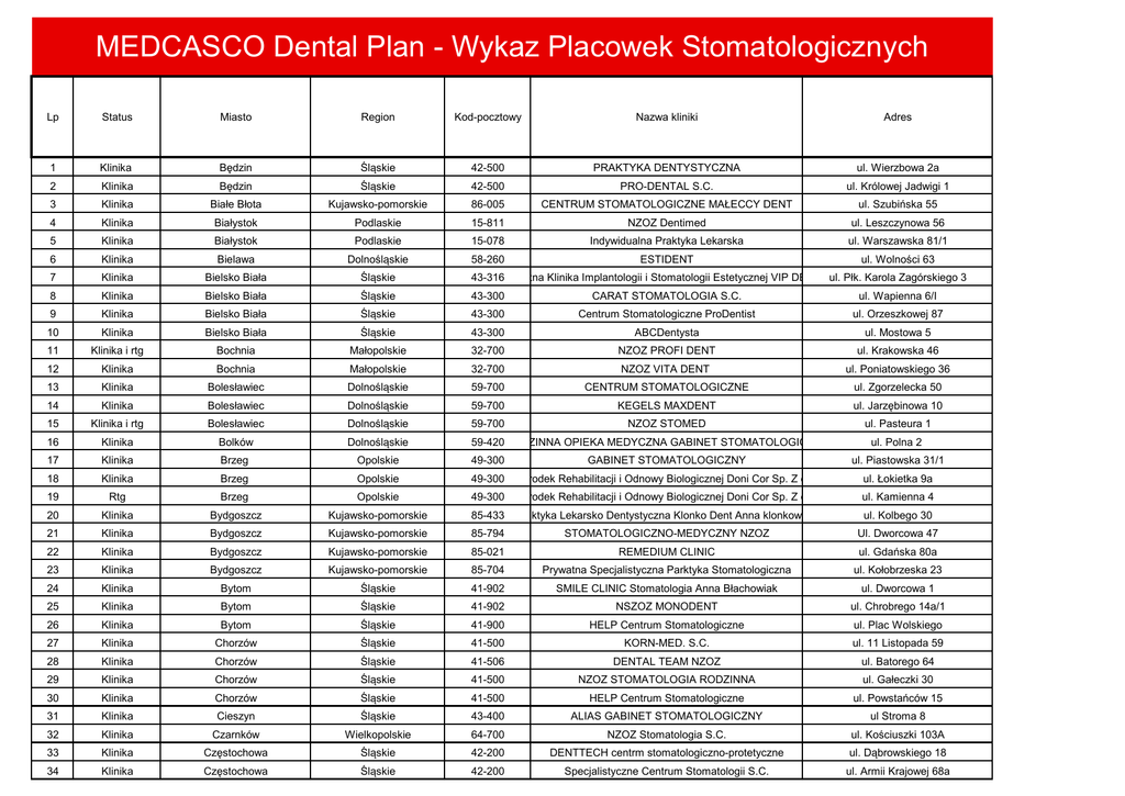 MEDCASCO Dental Plan - Wykaz Placowek Stomatologicznych