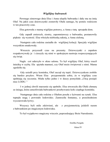 Wigilijny bałwanek Pewnego zimowego dnia Elsa i Anna ulepiły bałwanka i dały mu na imię Olaf. Na jakiś czas dziewczynki zostawiły Olafa samego, by pomóc rodzicom w ten pracowity czas. Elsa gotowała z mamą wigilijne potrawy, a Anna z tatą sprzątała dom. Gdy zapadł zmierzch, siostry, zapomniawszy o bałwanku, postanowiły pięknie się wystroić. Elsa włożyła niebieską suknię, a Anna zieloną. Następnie cała rodzina zasiadła do wigilijnej kolacji. Specjały wigilijne wszystkim smakowały. Wreszcie przyszedł czas na prezenty. Dziewczynki z zapałem rozpakowywały je i cieszyły się nimi w spokojnym nastroju rozpoczynających się świąt. Nagle coś uderzyło w okno salonu. To był wigilijny Olaf, który rzucił śnieżką w szybę. Ela spytała mamusi, czy Olaf może świętować z nimi. Mama zgodziła się. Gdy usiedli przy kominku, Olaf zaczął się topić. Dziewczynkom zrobiło się bardzo przykro. Wtem Elsa przypomniała sobie, że w wigilijny czas spełniają się życzenia. Miała tylko jedno i w duszy pomyślała ,,Chcę posiąść moc LODU.’’ I w jednej chwili marzenie się spełniło. Elsa stworzyła dla Olafa chmurę ze śniegu, która umożliwiała bałwankowi przebywanie koło ciepłego kominka. Następnego dnia cała rodzina z Olafem poszła z łyżwami na rynek. Elsa tupnęła nogą i powstało lodowisko. Zamroziła fontanny, a przechodniom wyczarowała łyżwy. Wszyscy byli mile zdziwieni, ale z bałwankiem po magicznym lodowisku. z przyjemnością jeździli razem To był wyjątkowo magiczny wieczór, poprzedzający Boże Narodzenie. Emilka Furgała klasa IV Wigilijna przygoda Pewnego ranka, a był to czas wigilijny, wstałam bardzo wcześnie. Nikogo w moim domu nie było, oprócz kuzynki Hani, która powoli się przebudzała. Gdy już była gotowa, zaproponowałam jej zabawę w tajemniczym miejscu – na strychu. Na górze, ku mojemu zdziwieniu, nie było kanapy, lalek ani ich domku, tylko wielka fabryka zabawek, w której kręciły się w ferworze pracy Elfy. Ich działaniom natomiast przyglądał się św. Mikołaj. Nie dostrzegłam na jego twarzy zadowolenia. - Święty Mikołaju, dlaczego jesteś smutny? – pełna śmiałości zapytałam. - Jestem smutny, bo Jacek Mróz zajął fabrykę w Laponii i przerobił ją na Lodową Krainę – drżącym głosem odpowiedział mi przerażony święty. - Nie przejmuj się tak bardzo…Poczekaj tu na nas, my zaraz przyniesiemy ci coś smacznego, ciasteczka i mleko, które na pewno poprawią ci nastrój – pocieszyłam gościa na strychu. Gdy zeszłyśmy na dół, nadal nikogo nie było, choć w salonie włączony był telewizor. Jak się okazało oglądała go nasza suczka Sunia - Hej, dzieciaki – powiedziała ludzkim głosem. - Asiu, Sunia mówi!- wykrzyknęła przestraszona Hania. - Nie bój się – powiedziałam – przecież w wigilijny czas wszystkie zwierzęta mówią ludzkim głosem! - A może nam zaśpiewasz, Suniu ?- nagle odezwała się do mojej suni Hania. - Z przyjemnością zaśpiewam moją ulubioną kolędę – odpowiedziała Sunia. Nagle, oprócz pięknego śpiewu suni, usłyszałam tupot nóg Mikołaja, który stojąc już w salonie zapytał - To co z tym mlekiem i ciasteczkami? I tak oto w jednym salonie stał prawdziwy święty Mikołaj i popisywała się swoim śpiewem moja suczka Sunia(…). (…) Gdy wraz z moim miłym towarzystwem doleciałam na miejsce (…) - Ta kraina wygląda jak Narnia! - wykrzyknęłam podekscytowana – Ja już przeczytałam książkę C.S. Lewis, teraz pora na ciebie Mikołaju i ty, Suniu, też mogłabyś trochę poczytać, rozwinąć swoją wyobraźnię, zamiast stale oglądać ,,Zwariowane Melodie”- powiedziałam , a wszyscy się zaśmiali (…) (Fragmenty tekstu Asi Bandurowskiej z klasy IV. Autorka ma w projekcie rozwinąć materiał do rozmiarów małej powieści świątecznej).