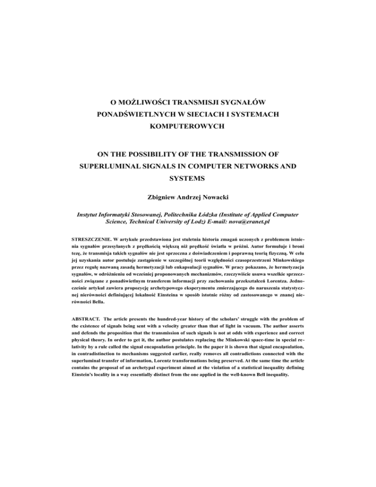 O MOŻLIWOŚCI TRANSMISJI SYGNAŁÓW PONADŚWIETLNYCH W SIECIACH I SYSTEMACH KOMPUTEROWYCH ON THE POSSIBILITY OF THE TRANSMISSION OF SUPERLUMINAL SIGNALS IN COMPUTER NETWORKS AND SYSTEMS Zbigniew Andrzej Nowacki Instytut Informatyki Stosowanej, Politechnika Łódzka (Institute of Applied Computer Science, Technical University of Lodz) E-mail: [email protected] STRESZCZENIE. W artykule przedstawiona jest stuletnia historia zmagań uczonych z problemem istnienia sygnałów przesyłanych z prędkością większą niż prędkość światła w próżni. Autor formułuje i broni tezę, że transmisja takich sygnałów nie jest sprzeczna z doświadczeniem i poprawną teorią fizyczną. W celu jej uzyskania autor postuluje zastąpienie w szczególnej teorii względności czasoprzestrzeni Minkowskiego przez regułę nazwaną zasadą hermetyzacji lub enkapsulacji sygnałów. W pracy pokazano, że hermetyzacja sygnałów, wodróżnieniu od wcześniej proponowanych mechanizmów, rzeczywiście usuwa wszelkie sprzeczności związane z ponadświetlnym transferem informacji przy zachowaniu przekształceń Lorentza. Jednocześnie artykuł zawiera propozycję archetypowego eksperymentu zmierzającego do naruszenia statystycznej nierówności definiującej lokalność Einsteina w sposób istotnie różny od zastosowanego w znanej nierówności Bella. ABSTRACT. The article presents the hundred-year history of the scholars’ struggle with the problem of the existence of signals being sent with a velocity greater than that of light in vacuum. The author asserts and defends the proposition that the transmission of such signals is not at odds with experience and correct physical theory. In order to get it, the author postulates replacing the Minkowski space-time in special relativity by a rule called the signal encapsulation principle. In the paper it is shown that signal encapsulation, in contradistinction to mechanisms suggested earlier, really removes all contradictions connected with the superluminal transfer of information, Lorentz transformations being preserved. At the same time the article contains the proposal of an archetypal experiment aimed at the violation of a statistical inequality defining Einstein’s locality in a way essentially distinct from the one applied in the well-known Bell inequality. 1. Wprowadzenie Wiadomo, że na gruncie teorii względności Einsteina transmisja sygnałów zprędkością przekraczającą prędkość światła w próżni prowadzi do sprzeczności. Jednocześnie niektórzy fizycy twierdzą, że ich dziedzina zbliża się już do końca i że zostało już tylko kilka drobnych problemów do rozwiązania. Najwybitniejszym przedstawicielem tej grupy był nieżyjący już amerykański uczony Feynman. (Właśnie powołując się na Feynmana pewien sprytny i umiejący liczyć biolog ogłosił, że wiek dwudziesty pierwszy będzie wiekiem biologii. Nie trzeba bowiem wielkiej wyobraźni, aby zrozumieć, że koniec jakiejś dziedziny musi być także praktycznym końcem uprawiających ją naukowców. Żaden parlament nie przeznaczy większych funduszy na gałąź wiedzy, w której wszystko zostało już wyjaśnione.) Jeśli Feynman miał rację, to ponadświetlna transmisja sygnałów nie będzie nigdy zrealizowana. Ale czy rzeczywiście fizyka znajduje się na etapie wyglądającym jak zbliżanie się do końca? Otóż autor uważa, że jest wprost przeciwnie, co zamierza pokazać w tym i innych artykułach. W rozdziałach od 2 do 7 omawiamy stuletnią historię zmagań uczonych z problemem istnienia sygnałów przesyłanych z ponadświetlnymi prędkościami. W rozdziale 8 przedstawiamy propozycję archetypowego eksperymentu i dowodzimy, że implikuje on propagację ponadświetlnych oddziaływań przyczynowo-skutkowych. Rozdział 9 zawiera opis statystycznej procedury umożliwiającej stwierdzenie tego faktu oraz definicję niezawodności łączy kwantowych z jednym detektorem. W rozdziale 10 podajemy nierówność (13) implikowaną przez przyczynowość stożków świetlnych Einsteina. Pokazujemy, że (13) jest dokładnym odpowiednikiem znanej dobrze fizykom nierówności Bella. Jednak o ile ta ostatnia jest naruszana w eksperymentach wykorzystujących łącza kwantowe z dwoma detektorami, o tyle (13) będzie – zdaniem autora – łamana w doświadczeniach stosujących łącza kwantowe z jednym detektorem. Powyższa substytucja jednego detektora w miejsce dwóch odegra kluczową rolę w informatycznych zastosowaniach teorii. Jest ona wykonalna dzięki potędze fizyki kwantowej dopuszczającej pomiary ‘w zasadzie’ tj. takie, że sama możliwość ich przeprowadzenia zmienia kwantową rzeczywistość. W rozdziale 8 demonstrujemy, że ograniczenie się do jednego detektora pozwala na przesyłanie użytecznych sygnałów z ponadświetlnymi prędkościami. Natomiast w rozdziale 11 podajemy mechanizm zabezpieczający przed sprzecznościami przy jednoczesnym wiernym zachowaniu przekształceń Lorentza tj. tego elementu szczególnej teorii względności, który jest potwierdzany w doświadczeniach. 2. Przekształcenia Lorentza w głównej roli Ta wyreżyserowana przez samą naturę historia zaczyna się dokładnie 100 lat temu. Nieznany do tej pory prawie nikomu urzędnik biura patentowego Albert Einstein publikuje pracę [1], w której przedstawia nową teorię czasu i przestrzeni. Jedną z jej najważniejszych konsekwencji jest zastąpienie dotychczasowych wzorów umożliwiających zmianę systemu odniesienia, tj. przekształceń Galileusza, przez przekształcenia Lorentza [2]. Cechą charakterystyczną tych drugich jest wyróżnienie pewnej stałej zwanej prędkością światła wpróżni i oznaczanej literą c. To powoduje m.in., że jeśli według pewnego obserwatora jakaś cząstka (ciało, pole, oddziaływanie, itp.) porusza się z prędkością większą niż czpunktu A do B, to zawsze istnieje taki obserwator, według którego ta sama cząstka (itp.) porusza się z 