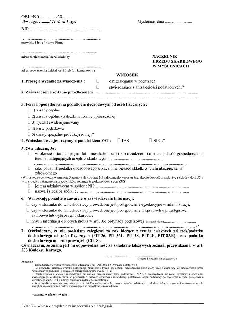OBII/490-............../20........ ilość egz. …....../ 21 zł. za 1 egz. Myślenice, dnia .......................... NIP....................................................................... …......................................................................... nazwisko i imię / nazwa Firmy …..................................................................... NACZELNIK URZĘDU SKARBOWEGO W MYŚLENICACH adres zamieszkania / adres siedziby ….......................................................................... adres prowadzenia działalności ( telefon kontaktowy ) 1. Proszę o wydanie zaświadczenia : WNIOSEK o niezaleganiu w podatkach stwierdzające stan zaległości podatkowych /* 2. Zaświadczenie zostanie przedłożone w ….............................................................................................. …....................................................................................................................................................................... 3. Forma opodatkowania podatkiem dochodowym od osób fizycznych : 1) zasady ogólne 2) zasady ogólne - zaliczki w formie uproszczonej 3) ryczałt ewidencjonowany 4) karta podatkowa 5) działy specjalne produkcji rolnej /* 4. Wnioskodawca jest czynnym podatnikiem VAT : TAK NIE /* 5. Oświadczam, że : w okresie ostatnich pięciu lat mieszkałem (am) / prowadziłem (am) działalność gospodarczą na terenie następujących urzędów skarbowych : .................................................. …................................................................................................................................................ jako podatnik podatku dochodowego wpłacam na bieżąco składki z tytułu ubezpieczenia zdrowotnego. (Wnioskodawcy którzy w punkcie 3 zaznaczyli kwadrat 2-5 załączają do wniosku kserokopie dowodów wpłat tych składek do ZUS a w przypadku zatrudnienia pracowników również kserokopie deklaracji ZUS) jestem udziałowcem w spółce : NIP …...................................................................................... nazwa i siedziba spółki : …........................................................................................................ 6. Wnioskuję ponadto o zawarcie w zaświadczeniu informacji: czy w stosunku do wnioskodawcy prowadzone jest postępowanie egzekucyjne w administracji, czy w stosunku do wnioskodawcy prowadzone jest postępowanie w sprawach o przestępstwa skarbowe lub wykroczenia skarbowe innych informacji o których mowa w art.306e ordynacji podatkowej (wskazać jakich)............................... …........................................................................................................................................................../* 7. Oświadczam, że nie posiadam zaległości za rok bieżący z tytułu należnych zaliczek/podatku dochodowego od osób fizycznych (PIT-36, PIT-36L, PIT-28, PIT-4R, PIT-8AR), oraz podatku dochodowego od osób prawnych (CIT-8). Oświadczam, że znana jest mi odpowiedzialność za składanie fałszywych zeznań, przewidziana w art. 233 Kodeksu Karnego. …....................................................... ( podpis i pieczątka wnioskodawcy ) Pouczenie - Urząd Skarbowy wydaje zaświadczenie w terminie 7 dni ( Art. 306a § 5 Ordynacji podatkowej ) - W przypadku składania wniosku podpisanego przez osoby trzecie lub odbioru zaświadczenia przez osoby trzecie wymagane jest upoważnienie przez wnioskodawcę/podatnika ( podlegające opłacie skarbowej w kwocie 17,- zł. ) - Jeżeli wniosek o wydanie zaświadczenia nie zawiera numeru identyfikacji podatkowej ( NIP ), a wnioskodawca nie został zwolniony z obowiązku ewidencyjnego, o którym mowa w przepisach o zasadach ewidencji i identyfikacji podatników, organ podatkowy po wyczerpaniu trybu postępowania określonego w art. 169 § 1 ustawy, pozostawia żądanie bez rozpatrzenia - W przypadku posiadania przez tutejszy Urząd tytułów wykonawczych z innych organów podatkowych, zaległości takie będą również analizowane w celu uwzględnienia wszystkich faktów wpływających na prawidłowość zaświadczenia * zaznacz właściwy kwadrat F-016/2 – Wniosek o wydanie zaświadczenia o niezaleganiu Komórka US Uwagi / data / podpis - księgowej Mandaty Karta Podatkowa PCC Spadki i Darowizny GK PPE, PPR, PPD CIT Zezn. Roczne PIT - 7 VAT PIT - 4 PIT – 5, PIT - 5L Opłatę skarbową można wpłacić : w kiosku Urzędu Skarbowego w Myślenicach w kasie UMiG Myślenice na konto UMiG Myślenice : BS WIELICZKA O/MYŚLENICE NR : 91861900060020000166650001 F-016/2 – Wniosek o wydanie zaświadczenia o niezaleganiu Uwagi