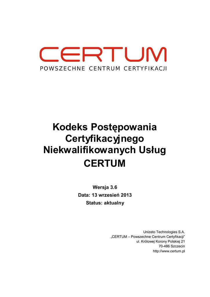 Kodeks Postępowania Certyfikacyjnego Niekwalifikowanych Usług CERTUM Wersja 3.6 Data: 13 wrzesień 2013 Status: aktualny Unizeto Technologies S.A. „CERTUM – Powszechne Centrum Certyfikacji” ul. Królowej Korony Polskiej 21 70-486 Szczecin http://www.certum.pl Kodeks Postępowania Certyfikacyjnego Niekwalifikowanych Usług CERTUM, wersja 3.6 Klauzula: Prawa Autorskie © Copyright 2002-2013 Unizeto Technologies S.A. Wszelkie prawa zastrzeżone. CERTUM – Powszechne Centrum Certyfikacji oraz CERTUM są zastrzeżonymi znakami towarowymi Unizeto Technologies S.A. Logo CERTUM i Unizeto są znakami towarowymi i serwisowymi Unizeto Technologies S.A. Pozostałe znaki towarowe i serwisowe wymienione w tym dokumencie są własnością odpowiednich właścicieli. Bez pisemnej zgody Unizeto Technologies S.A. nie wolno wykorzystywać tych znaków w celach innych niż informacyjne, to znaczy bez czerpania z tego tytułu korzyści finansowych lub pobierania wynagrodzenia w dowolnej formie. Niniejszym firma Unizeto Technologies S.A. zastrzega sobie wszelkie prawa do publikacji, wytworzonych produktów i jakiejkolwiek ich części zgodnie z prawem cywilnym i handlowym, w szczególności z tytułu praw autorskich i praw pokrewnych, znaków towarowych. Nie ograniczając praw wymienionych w tej klauzuli, żadna część niniejszej publikacji nie może być reprodukowana lub rozpowszechniana w systemach wyszukiwania danych lub przekazywana w jakiejkolwiek postaci ani przy użyciu żadnych środków (elektronicznych, mechanicznych, fotokopii, nagrywania lub innych) lub w inny sposób wykorzystywana w celach komercyjnych, bez uprzedniej pisemnej zgody Unizeto Technologies S.A. Pomimo powyższych warunków, udziela się pozwolenia na reprodukowanie i dystrybucję niniejszego dokumentu na zasadach nieodpłatnych i darmowych, pod warunkiem, że podane poniżej uwagi odnośnie praw autorskich zostaną wyraźnie umieszczone na początku każdej kopii i dokument będzie powielony w pełni wraz z uwagą, iż jest on własnością Unizeto Technologies S.A. Wszelkie pytania związane z prawami autorskimi należy adresować do Unizeto Technologies S.A., ul. Królowej Korony Polskiej 21, 70-486 Szczecin, Polska, tel. +48 91 4801 201, fax +48 91 4801 222, email: [email protected]. Kodeks Postępowania Certyfikacyjnego Niekwalifikowanych Usług CERTUM, wersja 3.6 I Spis treści 1. Wstęp................................................................................................... 1 1.1. Wprowadzenie............................................................................................ 2 1.2. Nazwa dokumentu i jego identyfikacja .................................................... 3 1.3. Strony Kodeksu Postępowania Certyfikacyjnego................................... 4 1.3.1. Urzędy certyfikacji ............................................................................. 4 1.3.1.1. Główne urzędy certyfikacji................................................................. 5 1.3.1.2. Pośrednie urzędy certyfikacji............................................................. 5 1.3.2. 1.3.3. 1.3.4. 1.3.5. Punkty rejestracji ............................................................................... 7 Subskrybenci..................................................................................... 8 Strony ufające ................................................................................... 8 Inne strony......................................................................................... 8 1.3.5.1. Urząd znacznika czasu ..................................................................... 8 1.3.5.2. Urząd weryfikacji statusu certyfikatu.................................................. 9 1.4. Zakres stosowania certyfikatów............................................................... 9 1.4.1. Typy certyfikatów i zalecane obszary ich zastosowań..................... 11 1.4.2. Nierekomendowane zastosowania certyfikatów .............................. 12 1.5. Administrowanie Kodeksem Postępowania Certyfikacyjnego ............ 12 1.5.1. Organizacja odpowiedzialna za administrowanie dokumentem ...... 12 1.5.2. Kontakt ............................................................................................ 13 1.5.3. Podmioty określające aktualność zasad określonych w dokumencie ........................................................................................................ 13 1.5.4. Procedura zatwierdzania Kodeksu Postępowania Certyfikacyjnego 13 1.6. Definicje i używane skróty ...................................................................... 13 2. Odpowiedzialność za publikacje i repozytorium.......................... 14 2.1. 2.2. 2.3. 2.4. Repozytorium........................................................................................... 14 Informacje publikowane w repozytorium............................................... 14 Częstotliwość publikowania ................................................................... 15 Dostęp do publikacji................................................................................ 15 3. Identyfikacja i uwierzytelnianie ...................................................... 17 3.1. Nadawanie nazw ...................................................................................... 17 3.1.1. Typy nazw ....................................................................................... 17 3.1.2. Konieczność używania nazw znaczących ....................................... 18 3.1.3. Anonimowość subskrybentów ......................................................... 19 3.1.4. Zasady interpretacji różnych form nazw .......................................... 19 3.1.5. Unikalność nazw ............................................................................. 19 3.1.6. Rozpoznawanie, uwierzytelnianie oraz rola znaków towarowych.... 19 3.2. Początkowa walidacja tożsamości..............................
