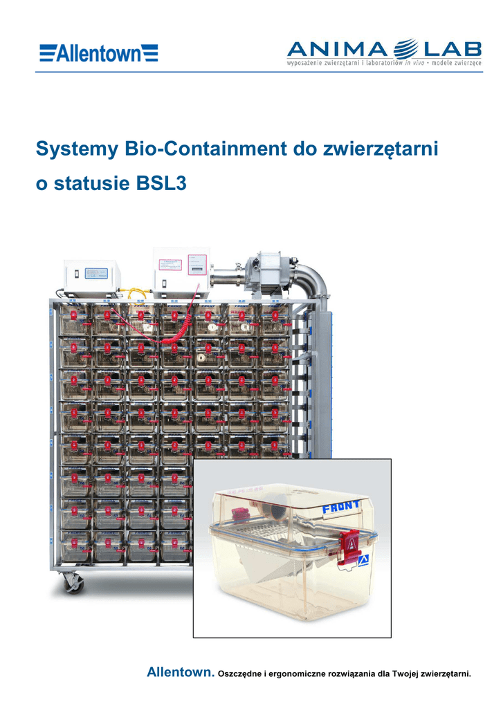 Systemy Bio-Containment do zwierzętarni o statusie BSL3 Allentown. Oszczędne i ergonomiczne rozwiązania dla Twojej zwierzętarni. Klatka BCU Klatki w systemach Bio-Containment oferują ochronę taką, jaką zapewniają komory typu glove-box czy izolatory. Hermetyczne uszczelnienie: silikonowe uszczelki, klamry zamykające system szybkich połączeń doprowadzających i odprowadzających powietrze Po zadokowaniu klatki w regale następuje samouszczelnienie połączeń, przez które doprowadzane jest czyste powietrze oraz wyciągane powietrze „zużyte”. Wyciągniecie klatki z regału powoduje zablokowanie zaworów i uszczelnienie klatki, co uniemożliwia zmianę ciśnienia panującego w jej wnętrzu. Dzięki temu klatki mogą być bezpiecznie transportowane do stacji wymiany klatek bez zagrożenia skażenia zwierząt lub otoczenia. System ten jest unikalny i został opatentowany (patent nr 6,308,660 B1). Podciśnieniowy przepływ powietrza Doprowadzane do klatek powietrze także jest oczyszczane za pomocą filtru HEPA i trafia do nich poprzez znajdujący się w dolnej części klatki nierdzewny dyfuzor. Powietrze z klatek wyciągane jest przez dmuchawę, która w sposób ciągły reguluje zdefiniowany przez użytkownika poziom podciśnienia powstającego w klatkach. Wyciągane z klatki powietrze przechodzi przez wstępny filtr znajdujący się w górnej części klatki, a następnie trafia do wspólnego filtru HEPA, który usuwa 99,99% zanieczyszczeń. AnimaLab • ul. Morawskiego 2/22 • 60-239 Poznań • Fax. + 48 61 223 74 67 • Tel. 61 861 60 04 • E-mail [email protected] • www.animalab.pl • Regał na klatki Regał posiada samouszczelniające się porty wlotu i wylotu powietrza, które zapewniają szczelność po wsunięciu klatki do regału, a także po jej usunięciu. Dzięki temu systemy BCU są całkowicie szczelne dając pełną ochronę zwierząt oraz pracujących z nimi naukowców. AnimaLab • ul. Morawskiego 2/22 • 60-239 Poznań • Fax. + 48 61 223 74 67 • Tel. 61 861 60 04 • E-mail [email protected] • www.animalab.pl • Zalety klatek każda klatka zamykana i uszczelniania – izolacja od otoczenia obsługiwany jedną ręką system zamykania zapewniający szczelność jednoczęściowa silikonowa uszczelka zapewniająca szczelność klatki samouszczelniające się porty wlotu i wylotu powietrza chroniące klatę w regale i poza nim specjalnie zaprojektowany dyfuzor na poziomie klatki powietrza zapewniający osuszanie ściółki (wydłużony okres wymiany klatek) połączenia zapewniające optymalną wydajność przepływu powietrza zamontowany w pokrywie wstępny filtr chroniący przed wydostaniem się większych cząstek wyposażone w pokrywę ze stali nierdzewnej oraz butelkę z kapslem Parametry klatek typ II dla myszy – 432 cm2, butelki 250 ml z kapslem i silikonową uszczelką typ 10147 dla szczurów – 916 cm2, butelki 450 ml z kapslem i silikonową uszczelką wykonane z trwałego polisulfonu Udel® Zalety regału Konstrukcja i sterowanie precyzyjnie wykonana rama ze stali nierdzewnej gęste rozmieszczenie klatek w regale – duża oszczędność powierzchni w pełni autoklawowalny, łatwość sterylizacji nadtlenkiem wodoru bezprzewodowa komunikacja Bluetooth do monitorowania pracy Przepływ powietrza praca w module podciśnienia monitorowana za pomocą pętli sprzężenia zwrotnego zapewniającej stały przepływ powietrza stały przepływ powietrza (ok. 40 wymian na godzinę), możliwość cotygodniowej wymiany klatek filtry HEPA oczyszczające powietrze doprowadzane i wydmuchiwane z klatki AnimaLab • ul. Morawskiego 2/22 • 60-239 Poznań • Fax. + 48 61 223 74 67 • Tel. 61 861 60 04 • E-mail [email protected] • www.animalab.pl • Zabezpieczenia awaryjne dodatkowa dmuchawa awaryjna, bateryjne zasilanie awaryjne i zabezpieczenie przed nadmiernym rozładowaniem baterii alarmowanie o stanie filtrów, wentylatora oraz zasilania programowanie alarmu wentylatora, filtrów, braku połączeń oraz trybu zasilania (zasilanie sieciowe/bateryjne) 10 godzinne zasilanie awaryjne (opcjonalnie 20h) wskaźnik naładowania baterii oraz zasilania prądem zmiennym lub zasilania bateryjnego Rozmiary systemów BCU System dla myszy Ilość zwierząt w regale Wymiary regału [szer. x gł. x wys.] 49 klatek typ II – regał jednostronny 196 myszy* 1676 x 587 x 2038 mm 98 klatek typ II – regał dwustronny 392 myszy* 1844 x 813 x 2038 mm 30 klatek typ 10147– regał jednostronny 60 szczurów** 2038 x 673 x 2273 mm 60 klatek typ 10147– regał dwustronny 120 szczurów** 2038 x 965 x 2273 mm System dla szczurów * kalkulowane wg Dyrektywy 2010/63/UE dla myszy o masie powyżej 30 g ** kalkulowane wg Dyrektywy 2010/63/UE dla szczurów o masie 400-600 g AnimaLab • ul. Morawskiego 2/22 • 60-239 Poznań • Fax. + 48 61 223 74 67 • Tel. 61 861 60 04 • E-mail [email protected] • www.animalab.pl •