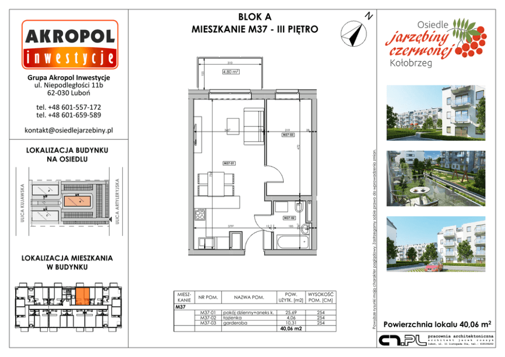 BLOK A MIESZKANIE M37 - III PIĘTRO N 310 4,80 m2 155 Grupa Akropol Inwestycje ul. Niepodległości 11b 62-030 Luboń tel. +48 601-557-172 tel. +48 601-659-589 [email protected] 3455 28 736 dy ne 22 42 k . ±0 p za lac ba w ±0 ,0 0= bu 3,2 0 C n.p dy 0= 3,2 0 m A n.p .m 1 ne ne k 21 k 42 .m dy . 22 25 m ,0 bu . 1 8 9 29 28 B .m M37-02 3795 w od om ie rzo w a 12 185 2365 n.p ULICA ARTYLERYJSKA m 1 0 26 bu 3,5 25 0= 50 ,0 1 21 1 ±0 28 LOKALIZACJA MIESZKANIA W BUDYNKU MIESZKANIE M37 NR POM. NAZWA POM. M37-01 M37-02 M37-03 pokój dzienny+aneks k. łazienka garderoba POW. WYSOKOŚĆ UŻYTK. [m2] POM. [CM] 2,67 m2 25,69 4,06 10,31 40,06 m2 254 254 254 Powyższe rysunki mają charakter poglądowy. Zastrzegamy sobie prawo do wprowadzenia zmian. 472 M37-01 5 obowizujca linia zabudowy ULICA KUJAWSKA 219 M37-03 LOKALIZACJA BUDYNKU NA OSIEDLU stud ni a 12 Powierzchnia lokalu 40,06 m2 pracownia architektoniczna a r c h i t e k t j a c e k r o s z y k luboń, ul. 11 listopada 31a, tel.: 618106202