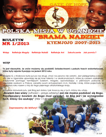 Wstęp Refleksje Magdy Refleksje Natalii Refleksje Ani Zakończenie Jak pomóc? WSTĘP To jest niezwykłe, że znów możemy się podzielić świadectwami z pobytu trzech wolontariuszek, które były rejonie Kyenjojo na jesieni 2012 roku. Magda G. z Krakowa była już po raz drugi, choć na pewno nie ostatni. Jest pielęgniarką z zawo du, ale w Ugandzie ujawniają się jej inne talenty i w okolicznościach, które ją czasem zaskakują, kreatywnie pomaga tamtejszym ludziom. Magda, opowiadając o pierwszym pobycie w Ugandzie osobom w Polsce, zaraziła swym entuzjazmem m.in. Natalię i Anię, które pojechały w ubiegłym roku razem z nią do tego pięknego afrykańskiego kraju. Wszystkie doświadczyły, jaki Bóg jest dobry i jak troszczy się o tych, którzy Mu ufają. „Bowiem bez wiary (ufności – przyp.własny) zaś nie można podobać się Bogu. Przystępujący bowiem do Boga musi uwierzyć, że Bóg jest i że wynagradza tych, którzy Go szukają” (Hbr 11:6). Zapraszamy do lektury! www.uganda.info.pl str.1/7 wspólnego czytania Biblii był nieoceniony. W Kyenjojo, gdzie przebywałyśmy, mieszkają również misjonarze- Mirka i Henry. To oni stworzyli nam „plan działania” i zajmowali się nami codziennie. Towarzyszyli Nam we wszystkich odwiedzanych miejscach, tłumaczyli niejasności i zasady ugandyjskiej kultury, pomagali w przygotowaniu zajęć dla dzieci, doradzali. A codzienne wspólne posiłki były czasem, gdzie mogliśmy dzielić się swoimi przeżyciami, doświadczeniami i zachęcać się nawzajem. Odwiedzałyśmy pięć miejsc: • • • • • Mam na imię Magda, ale jako, że do Ugandy wyjeżdża wiele Magd, a podczas mojego pobytu byłyśmy we dwie Magdy, przypadły nam przydomki w udziale. I tak jako, że mieszkam w Krakowie, nazywano mnie Magda „Kraków”, a Madzia z Augustowa była Magdą „Augustów”- to tak ku woli wyjaśnienia. Na przełomie września i października spędziłam w Ugandzie 2,5 tygodnia. Był to mój drugi pobyt w tym miejscu. Może opiszę, co działo się przez ten rok, od czasu wizyty w Ugandzie w 2011 roku do czasu tej wizyty. Przez cały ten rok Pan Bóg nie pozwolił mi zapomnieć o Ugandzie. Miałam prezentacje o Ugandzie i opowiadałam o misji tam prowadzonej w wielu miejscach: w kościele, na szkółkach niedzielnych, na spotkaniach studenckich, w świeckich przedszkolach, w pracy. Byłam tak bardzo poruszona zainteresowaniem i zaangażowaniem sprawami Ugandy ludzi w różnym wieku, z różnych środowisk i z różnych denominacji. I choć po powrocie w 2011 roku nie planowałam wyjazdu do Ugandy w najbliższym czasie, to już po pół roku wiedziałam, że swój kolejny urlop muszę spędzić znowu w Ugandzie. Kyenjojo, Kaihura, Misandika, Kidoomi Nyakagongo. Razem z dziewczynami miałyśmy zajęcia dla dzieci w tych miejscach. Specjalistkami od zajęć manualnych była Ania i Madzia „Augustów”, to one głównie malowały, rysowały, tworzyły orgiami, używały kreatywnych drucików, pokazywały dzieciom jak można coś stworzyć przy niewielkim nakładzie zasobów. My z Natalią za to prowadziłyśmy zajęcia ruchowe dla dzieci: gry, zabawy, zawody, uczyłyśmy ich również polskich i angielskich piosenek. Dzieci odwdzięczały nam się piosenkami w języku Rutooro. Ania z Magdą prowadziły szkolenia na temat naturalnego planowania rodziny i metod aktywizująch dla nauczycieli. Natalia przedstawiała prezentację o Polsce, a ja miałam szkolenie z pierwszej pomocy. I tak wszystkie współpracowałyśmy i tworzyłyśmy naprawdę zgrany zespół. Nie wyobrażałam sobie, że mogę tam nie wrócić, że mogłabym nie zobaczyć powtórnie tych dzieci, że mogłabym nie wziąć udziału w ich uwielbieniu, że mogłabym nie zobaczyć tego miejsca znowu. Tym bardziej byłam szczęśliwa, że pojechałyśmy tym razem w czteroosobowym składzie. Największą radością była dla mnie Natalia, która w Ugandzie oddała swe życie Panu Jezusowi. Przywilejem było dla mnie patrzeć, jak Go poznaje, jak się Nim cieszy, a czas www.uganda.info.pl Opiszę może jeszcze o takim małym wyzwaniu, któremu musiałam sprostać. A mianowicie, w niedzielę odwiedzałyśmy kościół w Kyenjojo. W trakcie nabożeństwa, na dwie minuty przed rozpoczęciem szkółki niedzielnej dowiedziałam się, że to właśnie ja mam poprowadzić dziś zajęcia dla dzieci. Byłam przerażona, gdyż nie miałam nic przygotowanego, żadnego programu, żadnych materiałów, żadnego pomysłu. A miałam str.2/7 spędzić 2 godziny z około czterdzieściorgiem dzieci w wieku od ok. 2 do14 lat. I jeszcze wypadałoby aby te dzieci przecież nauczyły się czegoś na tej szkółce, aby wyszły zbudowane i zachęcone. Pomodliłam się o to i wiedziałam, że tu tylko Bóg może przyjść mi z pomocą. I tak spędziliśmy cudowny czas z dziećmi ucząc się piosenek chrześcijańskich, uwielbiając Boga, opowiadałam swoje świadectwo oraz przypowieści biblijne. Myślę, że nie tylko dzieci były tym zbudowane, ale również ja, widząc Bożą pomoc i pomysły jakie mi poddawał. Byłam ogromnie zaskoczona jaką wielką ciekawość wśród dzieci, studentów i dorosłych wzbudziłam przedstawiając prezentację o Polsce. Jestem wdzięczna, że mogłam być w tym roku w Ugandzie, że mogłam widzieć radość, zadowolenie i wdzięczność na twarzach dzieci. Jestem również wdzięczna, że mogłam to robić w tak doborowym towarzystwie misjonarzy, wolontariuszek i miejscowych ludzi. Nazywam się Natalia, mam 22 lat. Koniec minionych wakacji był dla mnie niezwykły, ponieważ pierwszy raz w życiu mogłam wyjechać do Afryki. Trudno jest mi określić, dlaczego tak bardzo chciałam wyjechać na misje do tak biednego państwa. Myślę, że odważyłam się na taki krok dzięki niedawno poznanej, wspaniałej osóbce-Madzi G., która po raz drugi wybierała się do Ugandy. Bardzo miła i wesoła była sytuacja, gdy uczyłyśmy piosenki w języku polskim, skła