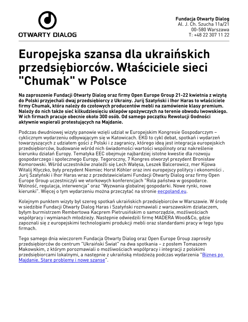 Fundacja Otwarty Dialog Al. J. Ch. Szucha 11a/21 00-580 Warszawa T: +48 22 307 11 22 Europejska szansa dla ukraińskich przedsiębiorców. Właściciele sieci "Chumak" w Polsce Na zaproszenie Fundacji Otwarty Dialog oraz firmy Open Europe Group 21-22 kwietnia z wizytą do Polski przyjechali dwaj przedsiębiorcy z Ukrainy. Jurij Szatyński i Ihor Haras to właściciele firmy Chumak, która należy do czołowych producentów mebli na zamówienie klasy premium. Należy do nich także sieć kilkudziesięciu sklepów spożywczych na terenie obwodu lwowskiego. W ich firmach pracuje obecnie około 300 osób. Od samego początku Rewolucji Godności aktywnie wspierali protestujących na Majdanie. Podczas dwudniowej wizyty panowie wzięli udział w Europejskim Kongresie Gospodarczym – cyklicznym wydarzeniu odbywającym się w Katowicach. EKG to cykl debat, spotkań i wydarzeń towarzyszących z udziałem gości z Polski i z zagranicy, którego ideą jest integracja europejskich przedsiębiorców, budowanie wśród nich świadomości wartości wspólnoty oraz nakreślenie kierunku działań Europy. Tematyka EEC obejmuje najbardziej istotne kwestie dla rozwoju gospodarczego i społecznego Europy. Tegoroczny, 7 Kongres otworzył prezydent Bronisław Komorowski. Wśród uczestników znaleźli się Lech Wałęsa, Leszek Balcerowicz, mer Kijowa Witalij Kłyczko, były prezydent Niemiec Horst Köhler oraz inni europejscy politycy i ekonomiści . Jurij Szatyński i Ihor Haras wraz z przedstawicielami Fundacji Otwarty Dialog oraz firmy Open Europe Group uczestniczyli we wtorkowych konferencjach "Rola państwa w gospodarce. Wolność, regulacja, interwencja" oraz "Wyzwania globalnej gospodarki. Nowe rynki, nowe kierunki". Więcej o tym wydarzeniu można przeczytać na stronie eecpoland.eu. Kolejnym punktem wizyty był szereg spotkań ukraińskich przedsiębiorców w Warszawie. W środę w siedzibie Fundacji Otwarty Dialog Haras i Szatyński rozmawiali z warszawskim działaczem, byłym burmistrzem Rembertowa Kacprem Pietrusińskim o samorządzie, możliwościach współpracy i wymianach młodzieży. Następnie odwiedzili firmę MADERA Wood&Co, gdzie zapoznali się z europejskimi technologiami produkcji mebli oraz standardami pracy w tego typu firmach. Tego samego dnia wieczorem Fundacja Otwarty Dialog oraz Open Europe Group zaprosiły przedsiębiorców do centrum "Ukraiński Świat" na dwa spotkania – z posłem Tomaszem Makowskim, z którym porozmawiali o możliwościach współpracy i integracji z polskimi przedsiębiorcami lokalnymi, a następnie z ukraińską młodzieżą podczas wydarzenia "Biznes po Majdanie. Stare problemy i nowe szanse". Dwudniową wizytę goście zakończyli spotkaniem z Łukaszem Włodarczykiem, członkiem rady nadzorczej Żabka Polska Sp. z o. o., przedstawicielem Mid Europa Partners – spółki, do której należy sieć marketów Żabka. Przedsiębiorcy otrzymali rekomendacje dotyczące rozwoju firmy Chumak, dowiedzieli się wiele na temat metod merchandisingu, wprowadzania samoobsługi i innych innowacji w sklepach. facebook.com/OpenDialogFoundation | [email protected] | www.odfoundation.eu