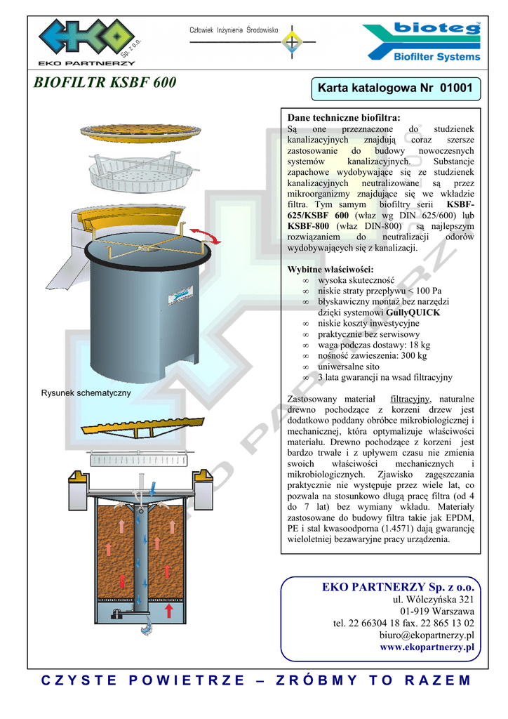 BIOFILTR KSBF 600 Karta katalogowa Nr 01001 Dane techniczne biofiltra: Są one przeznaczone do studzienek kanalizacyjnych znajdują coraz szersze zastosowanie do budowy nowoczesnych systemów kanalizacyjnych. Substancje zapachowe wydobywające się ze studzienek kanalizacyjnych neutralizowane są przez mikroorganizmy znajdujące się we wkładzie filtra. Tym samym biofiltry serii KSBF625/KSBF 600 (właz wg DIN 625/600) lub KSBF-800 (właz DIN-800) są najlepszym rozwiązaniem do neutralizacji odorów wydobywających się z kanalizacji. Wybitne właściwości: • wysoka skuteczność • niskie straty przepływu < 100 Pa • błyskawiczny montaż bez narzędzi dzięki systemowi GullyQUICK • niskie koszty inwestycyjne • praktycznie bez serwisowy • waga podczas dostawy: 18 kg • nośność zawieszenia: 300 kg • uniwersalne sito • 3 lata gwarancji na wsad filtracyjny Rysunek schematyczny Zastosowany materiał filtracyjny, naturalne drewno pochodzące z korzeni drzew jest dodatkowo poddany obróbce mikrobiologicznej i mechanicznej, która optymalizuje właściwości materiału. Drewno pochodzące z korzeni jest bardzo trwałe i z upływem czasu nie zmienia swoich właściwości mechanicznych i mikrobiologicznych. Zjawisko zagęszczania praktycznie nie występuje przez wiele lat, co pozwala na stosunkowo długą pracę filtra (od 4 do 7 lat) bez wymiany wkładu. Materiały zastosowane do budowy filtra takie jak EPDM, PE i stal kwasoodporna (1.4571) dają gwarancję wieloletniej bezawaryjne pracy urządzenia. EKO PARTNERZY Sp. z o.o. ul. Wólczyńska 321 01-919 Warszawa tel. 22 66304 18 fax. 22 865 13 02 [email protected] www.ekopartnerzy.pl CZYSTE POWIETRZE – ZRÓBMY TO RAZEM BIOFILTR KSBF Karta katalogowa Nr 01005 KARTA DOBORU BIOFILTRA System montażu - Typ A Typ A do montażu we włazach z opcją montażu biofiltra elastyczna uszczelka = b + 20mm elastyczna uszczelka opcja + 40mm Nietypowy rozmiar *standard / wszystkie wymiary w mm. Specjalne wymiary na życzenie Rodzaj materiału – krzyżak: stal zwykła ocynkowana* stal nierdzewna 1.4301 stal nierdzewna 1.4571 System montażu - Typ B (*standard) Typ B do montażu we włazach bez opcji montażu biofiltra elastyczna uszczelka = b + 20mm elastyczna uszczelka opcja + 40mm Rodzaj materiału - pierścień: stal stal stal (*standard) 1.4016* 1.4301 1.4571 Nietypowy rozmiar *standard / wszystkie wymiary w mm. Specjalne wymiary na życzenie EKO PARTNERZY Sp. z o.o. ul. Wólczyńska 321 01-919 Warszawa tel. 22 66304 18 fax. 22 865 13 02 [email protected] www.ekopartnerzy.pl CZYSTE POWIETRZE – ZRÓBMY TO RAZEM