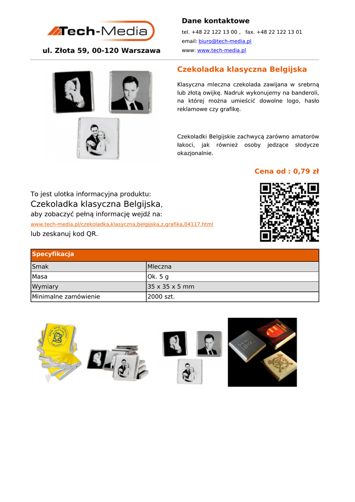 Dane kontaktowe tel. +48 22 122 13 00 , fax. +48 22 122 13 01 email: [email protected] ul. Złota 59, 00-120 Warszawa www: www.tech-media.pl Czekoladka klasyczna Belgijska Klasyczna mleczna czekolada zawijana w srebrną lub złotą owijkę. Nadruk wykonujemy na banderoli, na której można umieścić dowolne logo, hasło reklamowe czy grafikę. Czekoladki Belgijskie zachwycą zarówno amatorów łakoci, jak również osoby jedzące słodycze okazjonalnie. Cena od : 0,79 zł To jest ulotka informacyjna produktu: Czekoladka klasyczna Belgijska, aby zobaczyć pełną informację wejdź na: www.tech-media.pl/czekoladka,klasyczna,belgijska,z,grafika,04117.html lub zeskanuj kod QR. Specyfikacja Smak Mleczna Masa Ok. 5 g Wymiary 35 x 35 x 5 mm Minimalne zamówienie 2000 szt.