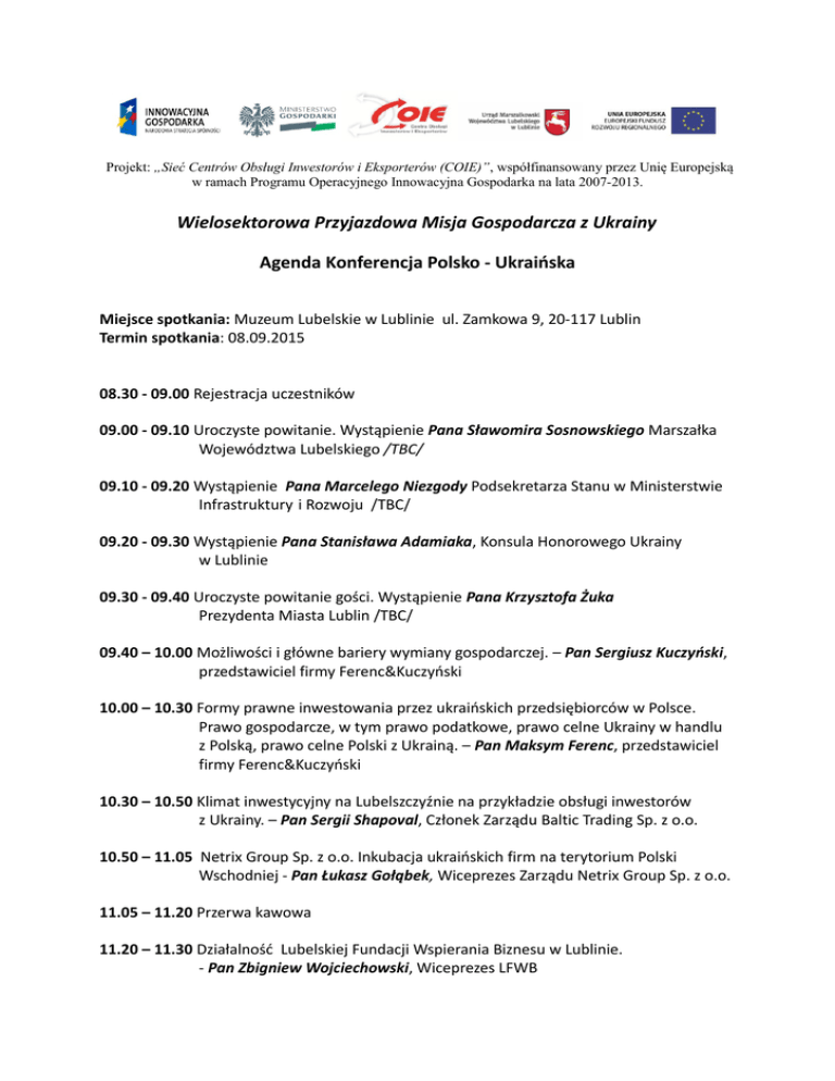 Projekt: „Sieć Centrów Obsługi Inwestorów i Eksporterów (COIE)”, współfinansowany przez Unię Europejską w ramach Programu Operacyjnego Innowacyjna Gospodarka na lata 2007-2013. Wielosektorowa Przyjazdowa Misja Gospodarcza z Ukrainy Agenda Konferencja Polsko - Ukraińska Miejsce spotkania: Muzeum Lubelskie w Lublinie ul. Zamkowa 9, 20-117 Lublin Termin spotkania: 08.09.2015 08.30 - 09.00 Rejestracja uczestników 09.00 - 09.10 Uroczyste powitanie. Wystąpienie Pana Sławomira Sosnowskiego Marszałka Województwa Lubelskiego /TBC/ 09.10 - 09.20 Wystąpienie Pana Marcelego Niezgody Podsekretarza Stanu w Ministerstwie Infrastruktury i Rozwoju /TBC/ 09.20 - 09.30 Wystąpienie Pana Stanisława Adamiaka, Konsula Honorowego Ukrainy w Lublinie 09.30 - 09.40 Uroczyste powitanie gości. Wystąpienie Pana Krzysztofa Żuka Prezydenta Miasta Lublin /TBC/ 09.40 – 10.00 Możliwości i główne bariery wymiany gospodarczej. – Pan Sergiusz Kuczyński, przedstawiciel firmy Ferenc&Kuczyński 10.00 – 10.30 Formy prawne inwestowania przez ukraińskich przedsiębiorców w Polsce. Prawo gospodarcze, w tym prawo podatkowe, prawo celne Ukrainy w handlu z Polską, prawo celne Polski z Ukrainą. – Pan Maksym Ferenc, przedstawiciel firmy Ferenc&Kuczyński 10.30 – 10.50 Klimat inwestycyjny na Lubelszczyźnie na przykładzie obsługi inwestorów z Ukrainy. – Pan Sergii Shapoval, Członek Zarządu Baltic Trading Sp. z o.o. 10.50 – 11.05 Netrix Group Sp. z o.o. Inkubacja ukraińskich firm na terytorium Polski Wschodniej - Pan Łukasz Gołąbek, Wiceprezes Zarządu Netrix Group Sp. z o.o. 11.05 – 11.20 Przerwa kawowa 11.20 – 11.30 Działalność Lubelskiej Fundacji Wspierania Biznesu w Lublinie. - Pan Zbigniew Wojciechowski, Wiceprezes LFWB 11.30 – 11.40 Prezentacja lubelskiej strefy ekonomicznej i możliwości inwestycyjne w podstrefach. - Pan Przemysław Gruba, Urząd Miasta Lublin, Wydział Strategii i Obsługi Inwestorów 11.40 – 11.50 Działalność Lubelskiego Forum Pracodawców. – Pan Zbigniew Michalak, Prezes LFP 11.50 – 12.00 Działalność Business Centre Club w Lublinie w Kontekście Polsko – Ukraińskim. - Pani Mira Gałan, Wiceprezes BCC 12.00 - 12.20 Prezentacja Firm Ukraińskich i Firm Polskich 12.20 – 13.00 Spotkania bilateralne Moderator – Pani Iwona Zdziebłowska, dyrektor Modart, specjalista ds. public relations. *Organizator zastrzega sobie prawo do zmiany agendy