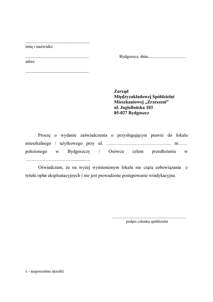 ............................................................ imię i nazwisko ........................................................... adres Bydgoszcz, dnia................................... ........................................................... Zarząd Międzyzakładowej Spółdzielni Mieszkaniowej „Zrzeszeni” ul. Jagiellońska 103 85-027 Bydgoszcz Proszę o wydanie zaświadczenia o przysługującym prawie do lokalu mieszkalnego / użytkowego przy ul. …………………………………... nr…… położonego w Bydgoszczy / Osówcu celem przedłożenia w …………………………...........…. Oświadczam, że na wyżej wymienionym lokalu nie ciążą zobowiązania z tytułu opłat eksploatacyjnych i nie jest prowadzone postępowanie windykacyjne. ........................................................................... podpis członka spółdzielni x - niepotrzebne skreślić