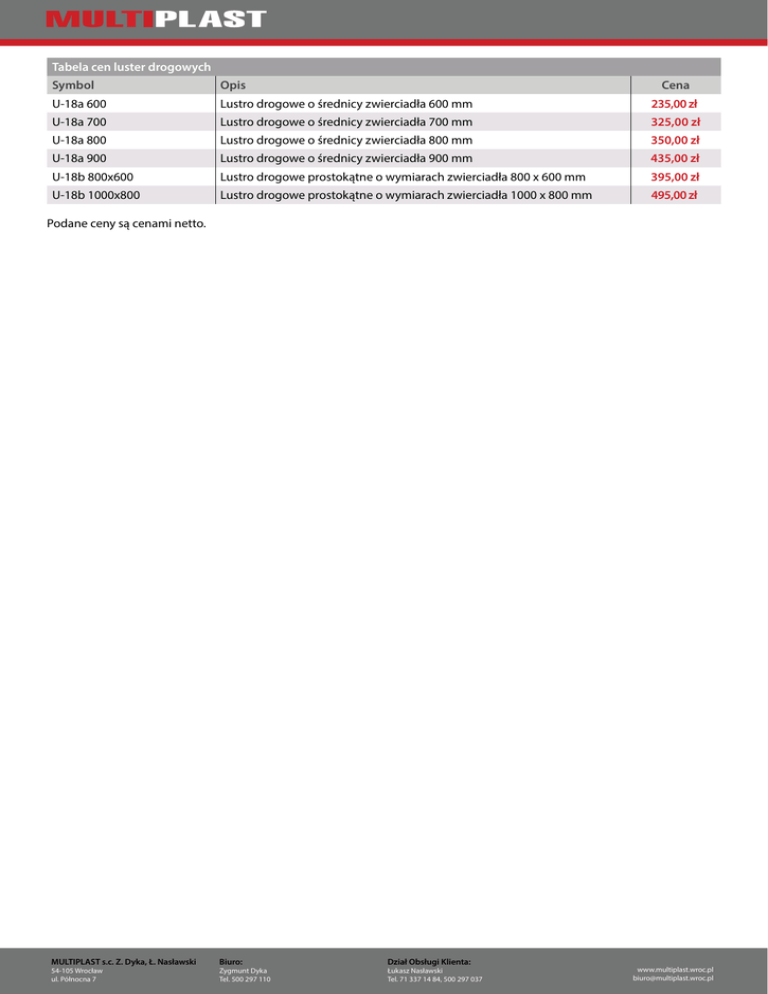Tabela cen luster drogowych Symbol Opis Cena U-18a 600 Lustro drogowe o średnicy zwierciadła 600 mm 235,00 zł U-18a 700 Lustro drogowe o średnicy zwierciadła 700 mm 325,00 zł U-18a 800 Lustro drogowe o średnicy zwierciadła 800 mm 350,00 zł U-18a 900 Lustro drogowe o średnicy zwierciadła 900 mm 435,00 zł U-18b 800x600 Lustro drogowe prostokątne o wymiarach zwierciadła 800 x 600 mm 395,00 zł U-18b 1000x800 Lustro drogowe prostokątne o wymiarach zwierciadła 1000 x 800 mm 495,00 zł Podane ceny są cenami netto. MULTIPLAST s.c. Z. Dyka, Ł. Nasławski 54-105 Wrocław ul. Północna 7 Biuro: Zygmunt Dyka Tel. 500 297 110 Dział Obsługi Klienta: Łukasz Nasławski Tel. 71 337 14 84, 500 297 037 www.multiplast.wroc.pl [email protected]