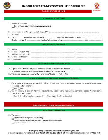 RAPORT DELEGATA MECZOWEGO LUBELSKIEGO ZPN (A) INFORMACJE OGÓLNE (A1) INFORMACJE NA TEMAT MECZU 1. Klasa rozgrywkowa III LIGA LUBELSKO-PODKARPACKA 2. Imię i nazwisko Delegata Lubelskiego ZPN …………………………………………………………… z……………………… 3. Zespoły …………………………………………………………………..…… - …………………………………………………………………… 4. Data …………….. Godzina rozpoczęcia meczu ……………….. Wynik (w nawiasie do przerwy) …………………………………... Kolejka rozgrywek ……………………….. Stadion/Miejsce zawodów ………………………………………………………………………….. (A2) INFORMACJE NA TEMAT SĘDZIÓW 5. 6. 7. 8. 9. Sędzia Sędzia – asystent nr 1 Sędzia – asystent nr 2 Sędzia – techniczny Obserwator …………………………………………………………………………………………….. z …………………………………………………… …………………………………………………………………………………………….. z …………………………………………………… …………………………………………………………………………………………….. z …………………………………………………… …………………………………………………………………………………………….. z …………………………………………………… …………………………………………………………………………………………….. z …………………………………………………… (A3) INFORMACJE NA TEMAT WIDZÓW I TRANSMISJI 10. Ogólna liczba widzów (uzyskana od Organizatora po zakończeniu meczu) ………………… 11. W tym liczba widzów zorganizowanej grupy kibiców drużyny gości …………………………. 12. Transmisja meczu „na żywo” w TV / Internecie/ Radio Tak Nie (A4) WSTĘPNA INFORMACJA NA TEMAT INCYDENTÓW/ZDARZEŃ NIEPOŻĄDANYCH 13. Czy w związku z meczem wystąpiły incydenty / zdarzenia mające negatywny wpływ na sprawną organizację i bezpieczeństwo imprezy? Tak Nie 14. Czy w związku z przedmiotowymi incydentami / zdarzeniami nastąpiło przerwanie meczu / zakończenie zawodów przed czasem? Tak Nie (ale incydenty wystąpiły ) Nie dotyczy (brak incydentów) (B) UWAGI DOTYCZĄCE ORGANIZACJI MECZU (B1) TYP IMPREZY I DOKUMENTACJA 15. Typ imprezy Impreza masowa (mecz piłki nożnej) Impreza masowa podwyższonego ryzyka (mecz piłki nożnej) Impreza – inna Komisja ds. Bezpieczeństwa na Obiektach Sportowych LZPN e-mail: [email protected]; sekretariat LZPN tel. (81) 528 05 68; Przewodniczący Komisji tel. 507 002 854 RAPORT DELEGATA MECZOWEGO LUBELSKIEGO ZPN 16. Dokumentacja przedstawiona przez Organizatora wzorowa b. dobra dobra przeciętna słaba niedopuszczalna 17. Dane kierownika ds. bezpieczeństwa – imię i nazwisko ……………………………………………………………………………………………….. 18. Dane kierownika ds. bezpieczeństwa – nr uprawnień (zaświadczenie i licencja) ……………………………………………………… 19. Dane spikera – imię i nazwisko ………………………………………………………………………………………………… 20. Dane spikera – nr uprawnień ………………………………………………………………………………………………… (B2) TEREN IMPREZY / STADIONU Jeżeli przyznano jedną z dwóch najniższych ocen („słaby” / „niedopuszczalny”) – każdorazowo należy uzasadnić taką ocenę w polu opisowym nr 28. 21. Ogólny wygląd / estetyka / porządek terenu imprezy / stadionu (w tym trybun) wzorowy b. dobry dobry przeciętny słaby niedopuszczalny 22. Przygotowanie / organizacja parkingów dla drużyn i oficjeli meczowych wzorowe b. dobre dobre przeciętne słabe niedopuszczalne 23. Przygotowanie parkingów dla kibiców drużyn gospodarzy i gości wzorowe b. dobre dobre przeciętne słabe niedopuszczalne 24. Organizacja wejścia na stadion (bramy, kanały wejściowe, furtki, kołowrotki) dla kibiców drużyny gospodarzy wzorowa b. dobra dobra przeciętna słaba niedopuszczalna 25. Przystosowanie terenu imprezy / stadionu pod kątem udogodnień dla osób / kibiców niepełnosprawnych wzorowe b. dobre dobre przeciętne słabe niedopuszczalne 26. Warunki oglądania meczu z poziomu trybun wzorowe b. dobre dobre przeciętne słabe niedopuszczalne 27. Ciągi komunikacyjne – drożność i oznakowanie wzorowe b. dobre dobre przeciętne słabe niedopuszczalne 28. Uzasadnienie najniższych ocen z obszaru (B2) / ewentualnie inne uwagi dotyczące obszaru (B2) ……………………………………………………………………………………………………………………………………………………………………………………………….. ……………………………………………………………………………………………………………………………………………………………………………………………….. ……………………………………………………………………………………………………………………………………………………………………………………………….. ……………………………………………………………………………………………………………………………………………………………………………………………….. (B3) ORGANIZACJA / OBSŁUGA IMPREZY Jeżeli przyznano jedną z dwóch najniższych ocen („słaby” / „niedopuszczalny”) – każdorazowo należy uzasadnić taką ocenę w polu opisowym nr 42. 29. Polityka informacyjna Klubu /