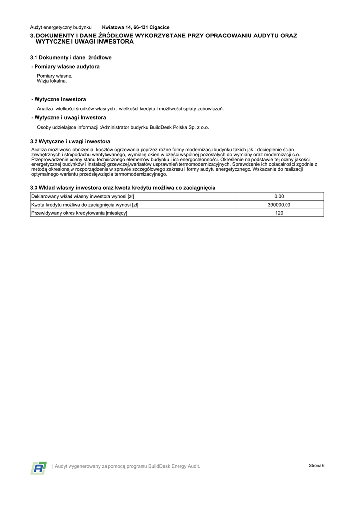 Audyt energetyczny budynku Kwiatowa 14, 66-131 Cigacice 3. DOKUMENTY I DANE ŹRÓDŁOWE WYKORZYSTANE PRZY OPRACOWANIU AUDYTU ORAZ WYTYCZNE I UWAGI INWESTORA 3.1 Dokumenty i dane źródłowe - Pomiary własne audytora Pomiary własne. Wizja lokalna. - Wytyczne Inwestora Analiza wielkości środków własnych , wielkości kredytu i możliwości spłaty zobowiazań. - Wytyczne i uwagi Inwestora Osoby udzielające informacji :Administrator budynku BuildDesk Polska Sp. z o.o. 3.2 Wytyczne i uwagi inwestora Analiza możliwości obniżenia kosztów ogrzewania poprzez różne formy modernizacji budynku takich jak : docieplenie ścian zewnętrznych i stropodachu wentylowanego, wymianę okien w części wspólnej pozostałych do wymiany oraz modernizacji c.o. Przeprowadzenie oceny stanu technicznego elementów budynku i ich energochłonności. Określenie na podstawie tej oceny jakości energetycznej budynków i instalacji grzewczej,wariantów usprawnień termomodernizacyjnych. Sprawdzenie ich opłacalności zgodnie z metodą okresloną w rozporządzeniu w sprawie szczegółowego zakresu i formy audytu energetycznego. Wskazanie do realizacji optymalnego wariantu przedsięwzięcia termomodernizacyjnego. 3.3 Wkład własny inwestora oraz kwota kredytu możliwa do zaciągnięcia Deklarowany wkład własny inwestora wynosi [zł] Kwota kredytu możliwa do zaciągnięcia wynosi [zł] Przewidywany okres kredytowania [miesięcy] | Audyt wygenerowany za pomocą programu BuildDesk Energy Audit. 0.00 390000.00 120 Strona 6 Audyt energetyczny budynku Kwiatowa 14, 66-131 Cigacice 3.4 Ustawy, Rozporządzenia, Normy - Ustawa z dnia 21 listopada 2008r. o wspieraniu termomodernizacji i remontów - Dz.U.Nr.223,poz,1459. Dalej zwana Ustawą termomodernizacyjną. - Rozporządzenie Ministra Infrastruktury z dnia 17 marca 2009r. w sprawie szczegółowego zakresu i formy audytu energetycznego oraz części audytu remontowego, wzorów kart audytów, a także algorytmów oceny opłacalności przedsięwzięcia termomodernizacyjnego. Dalej zwane Rozporządzeniem dot. audytów termomodernizacyjnych. - Rozporządzenie Ministra Infrastruktury z dnia 6 listopada 2008r. w sprawie metodologii obliczenia charakterystyki energetycznej budynku i lokalu mieszkalnego lub części budynku stanowiącej samodzielną całość techniczno użytkową oraz sposobu sporządzania i wzorów świadectw ich charakterystyki energetycznej. Dalej zwane Rozporządzeniem dot. świadectw energetycznych. - Rozporządzenie Ministra Infrastruktury z dnia 12 kwietnia 2002r. (wraz z późniejszymi zmianami) w sprawie warunków technicznych, jakim powinny odpowiadać budynki i ich usytuowanie (Dz. U. Nr 75, poz.690); ostatnia zmiana z dnia 6 listopada 2008r. Dalej zwane Warunkami Technicznymi. - Polska Norma PN - EN ISO 13790:2009 "Energetyczne właściwości użytkowe budynków - Obliczanie zużycia energii do ogrzewania i chłodzenia" - Polska Norma PN-EN ISO 6946:2008 "Elementy budowlane i części budynku. Opór cieplny i współczynnik przenikania ciepła. Metoda obliczeń". - Polska Norma PN-EN ISO 13370 "Właściwości cieplne budynków - Wymiana ciepła przez grunt - Metody obliczania" - Polska Norma PN-EN ISO 14683 "Mostki cieplne w budynkach - Liniowy współczynnik przenikania ciepła - Metody uproszczone i wartości orientacyjne". - Polska Norma PN-EN 12831:2006 "Instalacje ogrzewcze w budynkach. Metoda obliczania projektowego obciążenia cieplnego". - PN - EN ISO 13789 : 2008 "Cieplne właściwości użytkowania budynków - Współczynniki przenoszenia ciepła przez przenikanie i wentylację. Metoda obliczania" | Audyt wygenerowany za pomocą programu BuildDesk Energy Audit. Strona 7 Audyt energetyczny budynku Kwiatowa 14, 66-131 Cigacice 4. INWENTARYZACJA TECHNICZNO - BUDOWLANA BUDYNKU 4.1 Ogólne dane techniczne budynku. Konstrukcja i technologia Budynek wykonany w technologii tradycyjnej,pięciokondygnacyjny,całkowicie podpiwniczony,ściany z cegły pełnej ,stropy :nad piwnicą strop Kleina,między pietrami i nad ostatnią kondygnacją stropy drewniane.;Dach na konstrukcji drewnianej kryty dachówką ceramiczną. Schody drewniane; 4.2 Opis techniczny podstawowych elementów budynku Ściany zewnętrzne GRUPA_PRZEGROD_SCIANY ZEWN. PODŁUŻNE Ściany zewnętrzne podłużne zaprojektowane i wykonane jako ściany z cegły pełnej na parterze o gr. 51 cm a od I kondygnacji jako ściany o gr. 38cm. Ściana zewnętrzna /sąsiad Ściana wewnętrzna/sasiad. Wykonana z cegły pełnej. GRUPA_PRZEGROD_SCIANY_ZEWN. NA PODDASZU Ściany zewnętrzne na poddaszu zaprojektowane i wykonane jako ściany z bl.bet. komórkowego o gr. 25 cm. Ściana zewnętrzna -piwnice Ściany zewnętrzne w piwnicy wykonane z cegły ceramicznej pełnej. Dach / stropodach Dach skośny - strefa nieogrzewana. Dach skośny w strefie nieogrzewanej. GRUPA_PRZEGROD_STROPY - NAD PIWNICĄ Strop nad piwnicą.Wykonany ze stropu Kleina typu lekkiego. GRUPA_PRZEGROD_STROPY NAD PODDASZEM Strop nad poddaszem na belkach drewnianych, nie ocieplony. Podłoga Podłoga w podziemiu nieogrzewanym Podłoga w podziemiu nieogrzewanym wykonana jako betonowa. Ściana w podziemiu nieogrzewanym. Ściana w podziemiu nieogrzewanym wykonanaz cegły ceramicznej pełnej o gr. przegrody 51 cm. Stolarka otworowa Okna PCV - wymienione na nowe Okna wymienione na nowe z profili PCV.Stolarka okienna jest w dobrym stanie technicznym, wykazuje się dobrą szczelnością. Drzwi zewnętrzne Istniejące drzwi drewniane wejściowe na klatkę schodową.Wymienione na nowe. Występują w części wspólnej Wspólnoty. Okno piwniczne Okna piwniczne stare, drewniane o niewystarczających parametrach izolacyjności cieplnej. Stolarka drewniana jednoszybowa w złym stanie technicznym, wsp. przenikania nie spełnia warunków izolacyjności po termomodernizacji. Szczegółowe parametry przegród wielowarstwowych znajdują się w załączniku nr 2. Szczegółowe parametry stolarki otworowej znajdują się w załączniku nr 3. 4.3 Cha