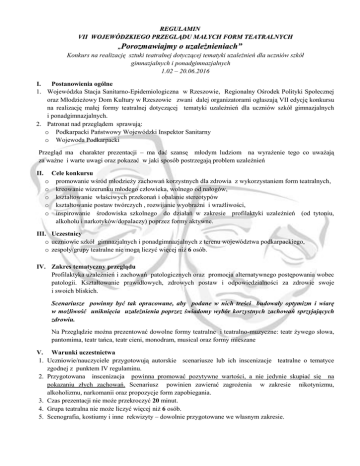REGULAMIN VII WOJEWÓDZKIEGO PRZEGLĄDU MAŁYCH FORM TEATRALNYCH „Porozmawiajmy o uzależnieniach” Konkurs na realizację sztuki teatralnej dotyczącej tematyki uzależnień dla uczniów szkół gimnazjalnych i ponadgimnazjalnych 1.02 – 20.06.2016 I. Postanowienia ogólne 1. Wojewódzka Stacja Sanitarno-Epidemiologiczna w Rzeszowie, Regionalny Ośrodek Polityki Społecznej oraz Młodzieżowy Dom Kultury w Rzeszowie zwani dalej organizatorami ogłaszają VII edycję konkursu na realizację małej formy teatralnej dotyczącej tematyki uzależnień dla uczniów szkół gimnazjalnych i ponadgimnazjalnych. 2. Patronat nad przeglądem sprawują: o Podkarpacki Państwowy Wojewódzki Inspektor Sanitarny o Wojewoda Podkarpacki Przegląd ma charakter prezentacji – ma dać szansę młodym ludziom na wyrażenie tego co uważają za ważne i warte uwagi oraz pokazać w jaki sposób postrzegają problem uzależnień II. o o o o o Cele konkursu promowanie wśród młodzieży zachowań korzystnych dla zdrowia z wykorzystaniem form teatralnych, kreowanie wizerunku młodego człowieka, wolnego od nałogów, kształtowanie właściwych przekonań i obalanie stereotypów kształtowanie postaw twórczych , rozwijanie wyobraźni i wrażliwości, inspirowanie środowiska szkolnego do działań w zakresie profilaktyki uzależnień (od tytoniu, alkoholu i narkotyków/dopalaczy) poprzez formy aktywne. III. Uczestnicy o uczniowie szkół gimnazjalnych i ponadgimnazjalnych z terenu województwa podkarpackiego, o zespoły/grupy teatralne nie mogą liczyć więcej niż 6 osób. IV. Zakres tematyczny przeglądu Profilaktyka uzależnień i zachowań patologicznych oraz promocja alternatywnego postępowania wobec patologii. Kształtowanie prawidłowych, zdrowych postaw i odpowiedzialności za zdrowie swoje i swoich bliskich. Scenariusze powinny być tak opracowane, aby podane w nich treści budowały optymizm i wiarę w możliwość uniknięcia uzależnienia poprzez świadomy wybór korzystnych zachowań sprzyjających zdrowiu. Na Przeglądzie można prezentować dowolne formy teatralne i teatralno-muzyczne: teatr żywego słowa, pantomima, teatr tańca, teatr cieni, monodram, musical oraz formy mieszane V. Warunki uczestnictwa 1. Uczniowie/nauczyciele przygotowują autorskie scenariusze lub ich inscenizacje teatralne o tematyce zgodnej z punktem IV regulaminu. 2. Przygotowana inscenizacja powinna promować pozytywne wartości, a nie jedynie skupiać się na pokazaniu złych zachowań. Scenariusz powinien zawierać zagrożenia w zakresie nikotynizmu, alkoholizmu, narkomanii oraz propozycje form zapobiegania. 3. Czas prezentacji nie może przekroczyć 20 minut. 4. Grupa teatralna nie może liczyć więcej niż 6 osób. 5. Scenografia, kostiumy i inne rekwizyty – dowolnie przygotowane we własnym zakresie. VI. Etapy konkursu Etap powiatowy Warunkiem przystąpienia szkoły do konkursu na etapie powiatowym jest przesłanie pisemnego zgłoszenia do udziału w Przeglądzie na formularzu „Zgłoszenie uczestnictwa w Wojewódzkim Przeglądzie Małych Form Teatralnych – etap powiatowy” do właściwej terytorialnie Powiatowej Stacji SanitarnoEpidemiologicznej. Ostateczny termin nadsyłania zgłoszeń – 15 kwietnia 2016r. Koordynator etapu powiatowego organizuje lokalny Przegląd w formie: o przeglądu powiatowego na bazie domu kultury lub innej sali widowiskowej (np. w szkole), o oceny inscenizacji poszczególnych sztuk prezentowanych w szkołach zgłoszonych do konkursu. Forma przebiegu etapu powiatowego jest uzależniona od liczby przystępujących do konkursu szkół i możliwości organizacyjnych koordynatora. Termin rozstrzygnięcia etapu powiatowego do 20 maja 2016 r. Do etapu wojewódzkiego zostaje zakwalifikowany laureat I miejsca w etapie powiatowym. Zwycięzca Przeglądu na etapie powiatowym przesyła scenariusz sztuki koordynatorowi powiatowemu, tym samym wyraża zgodę na bezpłatne wykorzystanie tego materiału przez organizatorów konkursu w celach promocyjno-wydawniczych w przyszłości . Koordynator etapu powiatowego zgłasza uczestnika – zwycięzcę Przeglądu Powiatowego – do etapu wojewódzkiego Przeglądu na odpowiednim formularzu niezwłocznie po zakończeniu etapu powiatowego, ale nie później niż do dnia 25 maja br. Uwaga: w sytuacji , gdy chęć uczestnictwa w programie zgłasza na poziomie powiatu zbyt mała liczba szkół (lub nieliczne powiaty podejmują inicjatywę) i organizacja przeglądu na poziomie powiatowym jest bezzasadna wówczas koordynator wojewódzki, po uzgodnieniu z koordynatorem powiatowym podejmuje decyzję o pominięciu przeglądu/ przeglądów powiatowych i organizacji jednego przeglądu na poziomie wojewódzkim. Etap wojewódzki Przegląd Wojewódzki odbędzie się w Młodzieżowym Domu Kultury w Rzeszowie (ul. Osmeckiego) w dniu 8 czerwca br. VII. Zasady pracy komisji konkursowej i oceny sztuk teatralnych Komisje konkursowe powołują koordynatorzy poszczególnych etapów. Liczba członków poszczególnych komisji nie może być mniejsza niż 3 osoby. Członkami komisji powinni być, oprócz specjalistów z zakresu tematyki konkursu, także przedstawiciele świata kultury. Prace komisji powinny być udokumentowane stosownym protokołem z podaniem uzasadnienia werdyktu (formularz). Kryteria oceny inscenizacji: walory profilaktyczne inscenizacji zgodność treści i przesłania spektaklu z tematyką przeglądu Dobór środków artystycznych Oryginalność i spójność prezentacji Razem – maksymalnie 0–6 0–6 0–6 0–6 24 pkt. Komisje na etapie wojewódzkim i powiatowym przyznają I, II, III miejsce w konkursie. Nagrody dla laureatów zapewniają organizatorzy i współorganizatorzy w miarę posiadanych środków finansowych. VIII. Nagrody Nagrody na etapie powiatowym ufundowane są przez Wojewódzką Stację Sanitarno-Epidemiologiczną w Rzeszowie. Etap powiatowy: I miejsce - udział w etapie wojewódzkim, puchar dla szkoły, upominki indywidualne dla zes