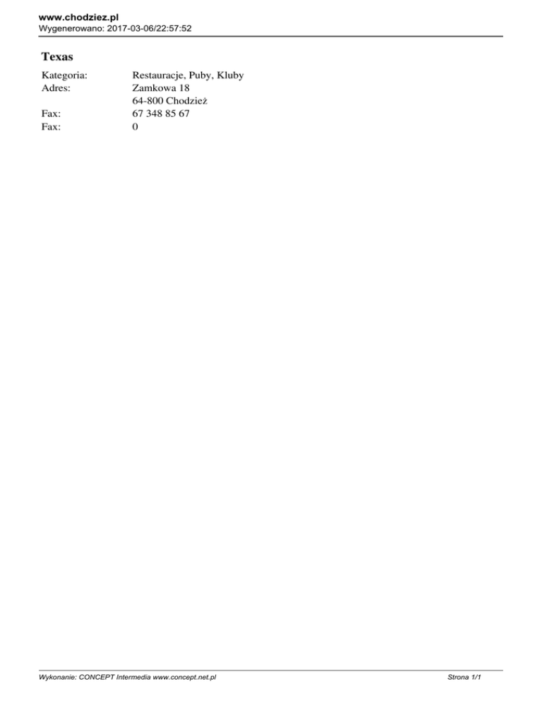 www.chodziez.pl Wygenerowano: 2017-03-06/22:57:52 Texas Kategoria: Adres: Fax: Fax: Restauracje, Puby, Kluby Zamkowa 18 64-800 Chodzież 67 348 85 67 0 Wykonanie: CONCEPT Intermedia www.concept.net.pl Strona 1/1