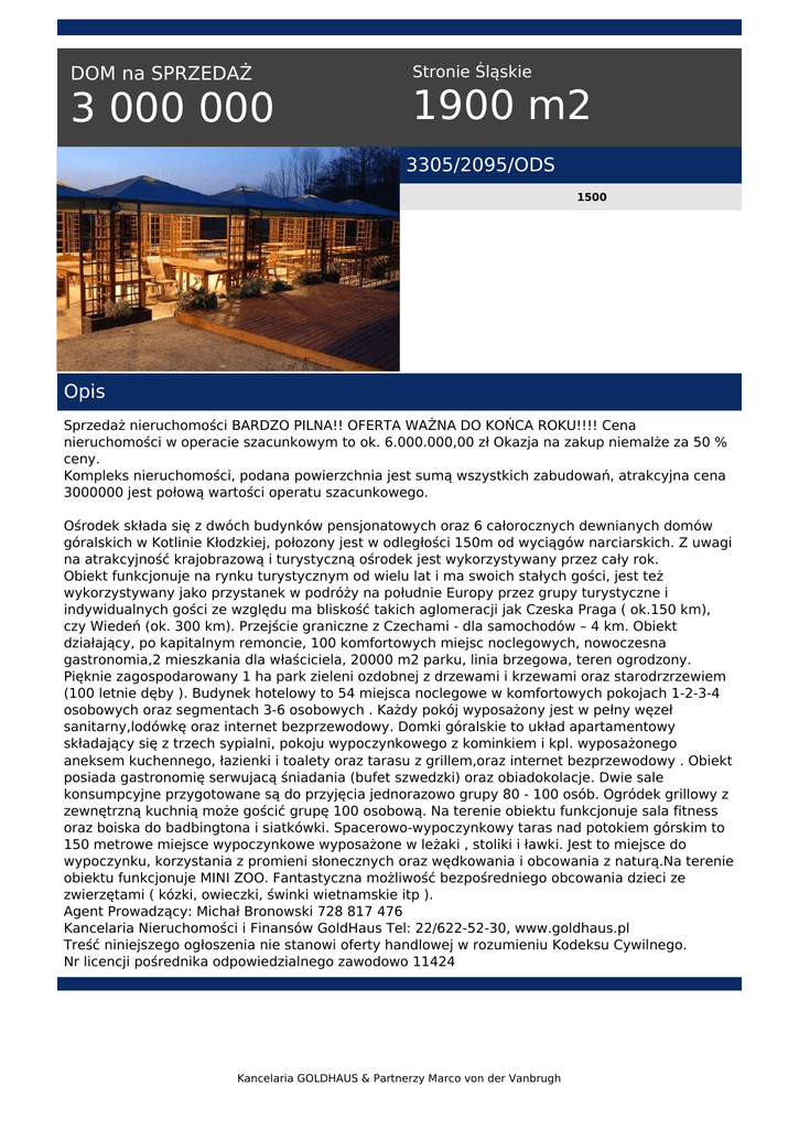 DOM na SPRZEDAŻ 3 000 000 Stronie Śląskie 1900 m2 3305/2095/ODS 1500 Opis Sprzedaż nieruchomości BARDZO PILNA!! OFERTA WAŻNA DO KOŃCA ROKU!!!! Cena nieruchomości w operacie szacunkowym to ok. 6.000.000,00 zł Okazja na zakup niemalże za 50 % ceny. Kompleks nieruchomości, podana powierzchnia jest sumą wszystkich zabudowań, atrakcyjna cena 3000000 jest połową wartości operatu szacunkowego. Ośrodek składa się z dwóch budynków pensjonatowych oraz 6 całorocznych dewnianych domów góralskich w Kotlinie Kłodzkiej, połozony jest w odległości 150m od wyciągów narciarskich. Z uwagi na atrakcyjność krajobrazową i turystyczną ośrodek jest wykorzystywany przez cały rok. Obiekt funkcjonuje na rynku turystycznym od wielu lat i ma swoich stałych gości, jest też wykorzystywany jako przystanek w podróży na południe Europy przez grupy turystyczne i indywidualnych gości ze względu ma bliskość takich aglomeracji jak Czeska Praga ( ok.150 km), czy Wiedeń (ok. 300 km). Przejście graniczne z Czechami - dla samochodów – 4 km. Obiekt działający, po kapitalnym remoncie, 100 komfortowych miejsc noclegowych, nowoczesna gastronomia,2 mieszkania dla właściciela, 20000 m2 parku, linia brzegowa, teren ogrodzony. Pięknie zagospodarowany 1 ha park zieleni ozdobnej z drzewami i krzewami oraz starodrzrzewiem (100 letnie dęby ). Budynek hotelowy to 54 miejsca noclegowe w komfortowych pokojach 1-2-3-4 osobowych oraz segmentach 3-6 osobowych . Każdy pokój wyposażony jest w pełny węzeł sanitarny,lodówkę oraz internet bezprzewodowy. Domki góralskie to układ apartamentowy składający się z trzech sypialni, pokoju wypoczynkowego z kominkiem i kpl. wyposażonego aneksem kuchennego, łazienki i toalety oraz tarasu z grillem,oraz internet bezprzewodowy . Obiekt posiada gastronomię serwujacą śniadania (bufet szwedzki) oraz obiadokolacje. Dwie sale konsumpcyjne przygotowane są do przyjęcia jednorazowo grupy 80 - 100 osób. Ogródek grillowy z zewnętrzną kuchnią może gościć grupę 100 osobową. Na terenie obiektu funkcjonuje sala fitness oraz boiska do badbingtona i siatkówki. Spacerowo-wypoczynkowy taras nad potokiem górskim to 150 metrowe miejsce wypoczynkowe wyposażone w leżaki , stoliki i ławki. Jest to miejsce do wypoczynku, korzystania z promieni słonecznych oraz wędkowania i obcowania z naturą.Na terenie obiektu funkcjonuje MINI ZOO. Fantastyczna możliwość bezpośredniego obcowania dzieci ze zwierzętami ( kózki, owieczki, świnki wietnamskie itp ). Agent Prowadzący: Michał Bronowski 728 817 476 Kancelaria Nieruchomości i Finansów GoldHaus Tel: 22/622-52-30, www.goldhaus.pl Treść niniejszego ogłoszenia nie stanowi oferty handlowej w rozumieniu Kodeksu Cywilnego. Nr licencji pośrednika odpowiedzialnego zawodowo 11424 Kancelaria GOLDHAUS & Partnerzy Marco von der Vanbrugh 101/ Goldhaus Nieruchomości tel. +48/22622-52-30 email: [email protected] Kancelaria GOLDHAUS & Partnerzy Marco von der Vanbrugh Powered by TCPDF (www.tcpdf.org)