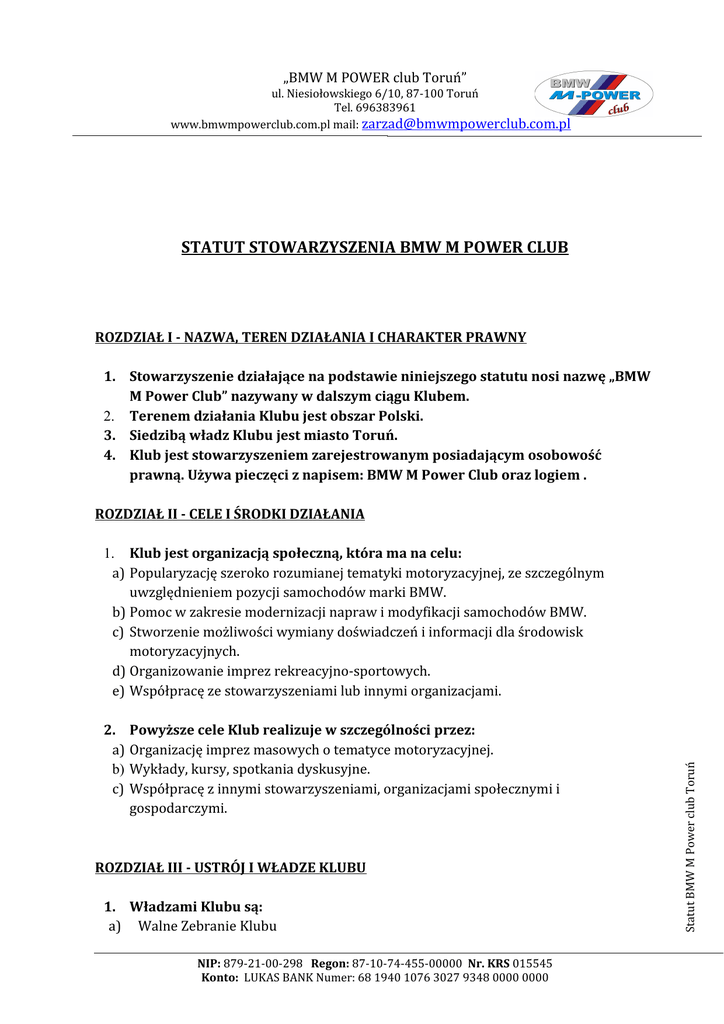 „BMW M POWER club Toruń” ul. Niesiołowskiego 6/10, 87-100 Toruń Tel. 696383961 www.bmwmpowerclub.com.pl mail: [email protected] STATUT STOWARZYSZENIA BMW M POWER CLUB ROZDZIAŁ I - NAZWA, TEREN DZIAŁANIA I CHARAKTER PRAWNY 1. Stowarzyszenie działające na podstawie niniejszego statutu nosi nazwę „BMW M Power Club” nazywany w dalszym ciągu Klubem. 2. Terenem działania Klubu jest obszar Polski. 3. Siedzibą władz Klubu jest miasto Toruń. 4. Klub jest stowarzyszeniem zarejestrowanym posiadającym osobowość prawną. Używa pieczęci z napisem: BMW M Power Club oraz logiem . ROZDZIAŁ II - CELE I ŚRODKI DZIAŁANIA 2. a) b) c) Powyższe cele Klub realizuje w szczególności przez: Organizację imprez masowych o tematyce motoryzacyjnej. Wykłady, kursy, spotkania dyskusyjne. Współpracę z innymi stowarzyszeniami, organizacjami społecznymi i gospodarczymi. ROZDZIAŁ III - USTRÓJ I WŁADZE KLUBU 1. Władzami Klubu są: a) Walne Zebranie Klubu NIP: 879-21-00-298 Regon: 87-10-74-455-00000 Nr. KRS 015545 Konto: LUKAS BANK Numer: 68 1940 1076 3027 9348 0000 0000 Statut BMW M Power club Toruń 1. Klub jest organizacją społeczną, która ma na celu: a) Popularyzację szeroko rozumianej tematyki motoryzacyjnej, ze szczególnym uwzględnieniem pozycji samochodów marki BMW. b) Pomoc w zakresie modernizacji napraw i modyfikacji samochodów BMW. c) Stworzenie możliwości wymiany doświadczeń i informacji dla środowisk motoryzacyjnych. d) Organizowanie imprez rekreacyjno-sportowych. e) Współpracę ze stowarzyszeniami lub innymi organizacjami. „BMW M POWER club Toruń” ul. Niesiołowskiego 6/10, 87-100 Toruń Tel. 696383961 www.bmwmpowerclub.com.pl mail: [email protected] b) c) Zarząd Klubu Komisja Rewizyjna 2. Do zakresu działania Walnego Zebrania Klubu należy: a) Uchwalanie Statutu i zmian w Statucie. b) Uchwalenie regulaminu Klubu i Komisji Rewizyjnej c) Wybór Zarządu Klubu i Komisji Rewizyjnej, d) Rozpatrywanie i zatwierdzanie na wniosek Komisji Rewizyjnej przedstawionego przez Zarząd rocznego sprawozdania, e) Podejmowanie uchwał w sprawie absolutorium dla Zarządu Klubu f) Przyjmowanie rocznego programu działania Klubu, g) Ustalanie wysokości składek członkowskich, h) Rozpatrywanie wniosków Zarządu Klubu i Komisji Rewizyjnej i) Podejmowanie uchwał we wszystkich innych sprawach, które ze względu na swoją szczególną wagę wymagają wyrażenia woli całego Klubu. j) Podejmowanie uchwały o rozwiązaniu Klubu. 3. Uchwały i postanowienia Walnego zebrania członków. a) Do ważności uchwał Walnego Zebrania Klubu konieczna jest obecność co najmniej połowy ogólnej liczby członków. b) Uchwały Walnego Zebrania Klubu zapadają zwykłą większością głosów 5. Skład Zarządu. a) Zarząd Klubu składa się z Prezesa ,Vice Prezesa, Asystenta Zarządu i Skarbnika wybieranych w głosowaniu tajnym przez Walne Zebranie Klubu. b) Ilość Członków Zarządu określa Walne Zebranie Klubu. c) Kadencja Zarządu trwa dwa lata. W przypadku zmniejszenia się liczby Członków Zarządu w trakcie trwania kadencji, skład organów uzupełnia się drogą głosowania. d) Na swoim pierwszym posiedzeniu Zarząd uchwala Regulamin Zarządu Klubu w którym określony jest zakres praw i obowiązków członków Zarządu. NIP: 879-21-00-298 Regon: 87-10-74-455-00000 Nr. KRS 015545 Konto: LUKAS BANK Numer: 68 1940 1076 3027 9348 0000 0000 Statut BMW M Power club Toruń 4. Walne zebranie członków Klubu. a) Walne Zebranie Klubu zwoływane jest przez Zarząd Klubu co najmniej raz do roku, z podaniem porządku obrad przynajmniej na 14 dni przed terminem zebrania. b) Nadzwyczajne Zebranie Walne Klubu zwoływane przez Zarząd Klubu na wniosek Komisji Rewizyjnej lub na życzenie 1/3 liczby wszystkich członków Klubu. c) Walne Zebranie Klubu ma prawo powołania funkcji honorowej określonej w uchwale. „BMW M POWER club Toruń” ul. Niesiołowskiego 6/10, 87-100 Toruń Tel. 696383961 www.bmwmpowerclub.com.pl mail: [email protected] 6. Zarząd Klubu a) Kieruje pracą Klubu. b) Opracowuje roczny plan działalności Klubu oraz planuje roczny budżet. c) Ukierunkowuje i nadzoruje bieżącą działalność Klubu. d) Zarządza majątkiem Klubu. e) Ma prawo podejmowania wszelkich decyzji dotyczących Klubu, za wyjątkiem spraw zastrzeżonych do kompetencji Walnego Zebrania. f) Ma prawo podejmowania decyzji we wszystkich sprawach majątkowych Klubu takich jak: −przyjmowanie zapisów i darowizn, −gospodarka majątkiem trwałym Klubu. g) Odpowiada za swoją działalność przed Walnym Zebraniem Klubu. h) Wszelkie podejmowane przez Zarząd Klubu decyzje mają charakter uchwał i przyjmowane są przez Zarząd w głosowaniu jawnym zwykłą większością głosów, przy obecności co najmniej 2/3 liczby członków Zarządu. i) W szczególnie uzasadnionych przypadkach do wykonania bieżących praca dla Klubu Zarząd może zatrudnić pracowników. 8. Komisja Rewizyjna a) Jest organem kontrolującym działalność Klubu. b) Dokonuje raz w roku kontroli całokształtu działalności Klubu, ze szczególnym uwzględnieniem gospodarki majątkowej i finansowej. c) Weryfikuje roczne sprawozdania Zarządu oraz przedstawia wynikające stąd wnioski Walnemu zebraniu Klubu. d) Co roku przedstawia Walnemu Zebraniu Klubu sprawozdania z kontroli za okres bieżącego roku działalności Klubu wraz z wnioskami , a także wnioskiem w sprawie absolutorium dla Zarządu Klubu. e) Po każdym przedsięwzięciu organizowanym przez Klub dokonuje kontroli i rozliczenia pod kątem wydatków i zrealizowanych celów . f) Do ważności uchwał Komisji Rewizyjnej konieczna jest obecność większości członków Komisji, w tym Przewodniczącego lub Zastępcy. 9. Gdy wymagają tego okoliczności, Komisja Rewizyjna ma prawo: NIP: 879-21-00-298 Regon: 87-10-74-455-00000 Nr. KRS 015545 Konto: LUKAS BANK Numer: 68 1940 1076 3027 9348 0000 0000 Statut BMW M Power club Toruń 7. Oświadczenia woli oraz zobowiązania majątko