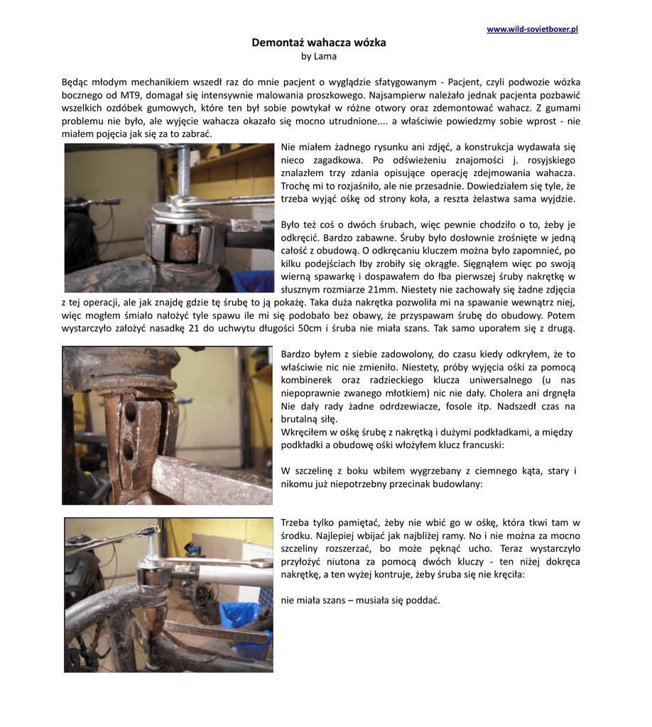 Demontaż wahacza wózka www.wild-sovietboxer.pl by Lama Będąc młodym mechanikiem wszedł raz do mnie pacjent o wyglądzie sfatygowanym - Pacjent, czyli podwozie wózka bocznego od MT9, domagał się intensywnie malowania proszkowego. Najsampierw należało jednak pacjenta pozbawić wszelkich ozdóbek gumowych, które ten był sobie powtykał w różne otwory oraz zdemontować wahacz. Z gumami problemu nie było, ale wyjęcie wahacza okazało się mocno utrudnione.... a właściwie powiedzmy sobie wprost - nie miałem pojęcia jak się za to zabrać. Nie miałem żadnego rysunku ani zdjęć, a konstrukcja wydawała się nieco zagadkowa. Po odświeżeniu znajomości j. rosyjskiego znalazłem trzy zdania opisujące operację zdejmowania wahacza. Trochę mi to rozjaśniło, ale nie przesadnie. Dowiedziałem się tyle, że trzeba wyjąć ośkę od strony koła, a reszta żelastwa sama wyjdzie. Było też coś o dwóch śrubach, więc pewnie chodziło o to, żeby je odkręcić. Bardzo zabawne. Śruby było dosłownie zrośnięte w jedną całość z obudową. O odkręcaniu kluczem można było zapomnieć, po kilku podejściach łby zrobiły się okrągłe. Sięgnąłem więc po swoją wierną spawarkę i dospawałem do łba pierwszej śruby nakrętkę w słusznym rozmiarze 21mm. Niestety nie zachowały się żadne zdjęcia z tej operacji, ale jak znajdę gdzie tę śrubę to ją pokażę. Taka duża nakrętka pozwoliła mi na spawanie wewnątrz niej, więc mogłem śmiało nałożyć tyle spawu ile mi się podobało bez obawy, że przyspawam śrubę do obudowy. Potem wystarczyło założyć nasadkę 21 do uchwytu długości 50cm i śruba nie miała szans. Tak samo uporałem się z drugą. Bardzo byłem z siebie zadowolony, do czasu kiedy odkryłem, że to właściwie nic nie zmieniło. Niestety, próby wyjęcia ośki za pomocą kombinerek oraz radzieckiego klucza uniwersalnego (u nas niepoprawnie zwanego młotkiem) nic nie dały. Cholera ani drgnęła Nie dały rady żadne odrdzewiacze, fosole itp. Nadszedł czas na brutalną siłę. Wkręciłem w ośkę śrubę z nakrętką i dużymi podkładkami, a między podkładki a obudowę ośki włożyłem klucz francuski: W szczelinę z boku wbiłem wygrzebany z ciemnego kąta, stary i nikomu już niepotrzebny przecinak budowlany: Trzeba tylko pamiętać, żeby nie wbić go w ośkę, która tkwi tam w środku. Najlepiej wbijać jak najbliżej ramy. No i nie można za mocno szczeliny rozszerzać, bo może pęknąć ucho. Teraz wystarczyło przyłożyć niutona za pomocą dwóch kluczy - ten niżej dokręca nakrętkę, a ten wyżej kontruje, żeby śruba się nie kręciła: nie miała szans – musiała się poddać.
