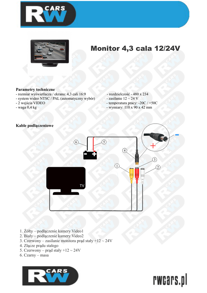 Monitor 4,3 cala 12/24V Parametry techniczne - rozmiar wyświetlacza / ekranu: 4,3 cali 16:9 - system wideo NTSC / PAL (automatyczny wybór) - 2 wejścia VIDEO - waga 0,4 kg - rozdzielczość - 480 x 234 - zasilanie 12 ~ 24 V - temperatura pracy: -20C / +50C - wymiary: 110 x 90 x 42 mm Kable podłączeniowe 6 5 4 - + 3 1 1. Żółty – podłączenie kamery Video1 2. Biały – podłączenie kamery Video2 3. Czerwony – zasilanie monitora prąd stały +12 ~ 24V 4. Złącze prądu stałego 5. Czerwony – prąd stały +12 ~ 24V 6. Czarny – masa 2