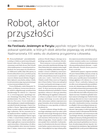 8 TEMAT Z OKŁADKI / NADMARIONETA XXI WIEKU Robot, aktor przyszłości AUTOR: IZABELLA PLUTA Na Festiwalu Jesiennym w Paryżu japoński reżyser Oriza Hirata pokazał spektakle, w których obok aktorów pojawiają się androidy. Nadmarioneta XXI wieku do złudzenia przypomina człowieka. „Wyrecytuj Rimbauda” – prosi młoda kobieta siedząca w fotelu na wprost innej, którą publiczność widzi en face. Na niemal pustej, przyciemnionej scenie biały dywan, fotel, krzesło i dwie żeńskie postaci w czarnych prostych sukienkach, bez narzucającej się charakteryzacji. Publiczność szybko zdaje sobie sprawę, że kwestie jednej dziewczyny są strofami poezji, recytowanymi w spokojnej intonacji głosu, oraz że to właśnie ona jest robotem. Druga kobieta większość czasu słucha, siedząc w fotelu, to znów przemieszczając się po przestrzeni gry wyznaczonej prostokątem dywanu. Utwory Rimbauda, a także Shimazaki, Tanikawy czy Bokusui, tworzą trzon słowny tego zaledwie półgodzinnego przedstawienia zatytułowanego Do widzenia wer. 2 (Sayonara ver. 2), stworzonego przez japońskiego reżysera i dramaturga Orizę Hiratę. Wraz z innym przedstawieniem: Trzy siostry. Wersja z androidem (Les Trois soeurs. Version Androïde), zostało ono pokazane w ramach czterdziestej pierwszej edycji Festiwalu Jesiennego w Teatrze Genneviliers w Paryżu. Tegorocznym spektaklom Hiraty wyraźnie nadano charakter artystycznego wydarzenia. Nie bez znaczenia jest tutaj międzynarodowa współpraca sceny Genneviliers z eksperymentalnym Teatrem Agora w Tokio, w ramach której zrodziły się te dwie propozycje sceniczne. Jednak spektakle zyskały rozgłos głównie z racji nowatorskiej koncepcji reżyserskiej, w której jedną z ról odtwarza humanoidalny robot, nazwany Geminoidem F, będący najnowszym osiągnięciem TEATR • 3/2013 profesora Hiroshi Ishiguro, słynnego już japońskiego specjalisty w dziedzinie robotyki. Warto zaznaczyć, że nie są to jedyne dokonania reżyserskie pięćdziesięcioletniego dziś Orizy Hiraty, który jest cenionym twórcą współczesnej sceny tokijskiej, założycielem trupy Seinendan i wreszcie wykładowcą uniwersyteckim. Jest również autorem wielu sztuk, jak chociażby tych przetłumaczonych na język francuski, m.in.: Ludzie z Seulu (Gens de Séoul), Tokijskie notatki (Tokyo notes) czy Pożegnalny śpiew (Chant d’adieu). Twórca ten zasłynął też ze swojej „teorii języka mówionego na scenie”, którą realizuje konsekwentnie w przedstawieniach. Ta dosyć purystyczna propozycja odchodzenia od konwencji zachodnich w teatrze japońskim, zwłaszcza w sferze gry aktorskiej, próby zbliżenia go do zagadnień codzienności, a zwłaszcza podjęcia kwestii relacji języka pisanego i mówionego na scenie, stała się nie tylko estetycznym znakiem rozpoznawczym grupy Seinendan, ale też istotnym elementem kształtującym scenę japońską od dobrych dwudziestu lat. Z punktu widzenia takiego dorobku artystycznego zaskakujący może się wydać wybór kierunku estetycznego obranego przez Hiratę w jego najnowszych przedstawieniach, w których inżynieria robotyczna łączy się ze spektaklem żywego planu. Artysta wpisał je w swój nowy projekt Teatru Androidów i Ludzi przekonany, iż za dwadzieścia lat obecność robota na scenie będzie częstym estetycznym rozwiązaniem. Sam podjął już trzy tego rodzaju próby: dwa najnowsze przedstawienia będące przedmiotem niniejszej analizy oraz wcześniejsze – z domowymi robotami zwanymi wakamaru i dwoma profesjonalnymi aktorami – w spektaklu Hataraku Watashi (Jestem pracownikiem) z 2008 roku. Jakkolwiek by spojrzeć, zagranie teatralnej roli przez humanoidalną maszynę sytuuje się nadal jeszcze w granicach eksperymentu. Istotnie, praca z perfekcyjnym Geminoidem F, którego oglądamy w Do widzenia wer. 2 i Trzech siostrach. Wersji z androidem, łudzącym nas nie tylko swym antropomorficznym podobieństwem, ale i zdumiewającym efektem obecności, jest niekwestionowaną innowacją nie tylko naukową, ale i artystyczną. Przypomnijmy, że termin efekt obecności (effect de présence) jest chętnie używany w kontekście spektakli i instalacji o naturze technologicznej. Trafnie bowiem ujmuje grę obecności tu i teraz w sensie teatralnym z rozwiązaniami technologii cyfrowej, jak chociażby z interkonektywnością, transmisją na odległość, które powodują jej mutację i powstanie wirtualno-realnych hybryd typu teleobecność. Sprecyzujmy, że robot typu geminoid wykonany został w Laboratorium Hiroshi Ishiguro i jest androidem, czyli wzorowaną na ciele i psychologii człowieka, skomplikowaną technologicznie maszyną. Każdy geminoid jest mechanicznym klonem konkretnej osoby. W przypadku omawianych spektakli jest on wizerunkiem dwudziestopięcioletniej Japonki, której tożsamość jest anonimowa. Jego mechanizm osiągnął dziś tak wysoki poziom elektroniczny, androidy Orizy Hiraty iż żaden z inżynierów nie zna w pełni jego całkowitej budowy i funkcjonowania. Hirata, reżyserując Do widzenia wer. 2, wpisał w dramaturgiczną i scenograficzną strukturę przedstawienia możliwości oraz ograniczenia Geminoida F, co nadaje wizji reżyserskiej interesujący aspekt. Takie a nie inne rozwiązania mają więc swe teatralne i jednocześnie technologiczne uzasadnienia. Tematyką tego spektaklu jest umieranie i samotność, bowiem główną bohaterką jest nieuleczalnie chora młoda Japonka. Rodzice, pragnąc jej zapewnić stałe towarzystwo, kupują androida. Ma on postać ślicznej młodej dziewczyny o przyjemnym głosie, która jest stale obecna przy chorej i recytuje jej wiersze (Geminoid F). Dla Europejczyków historia tak pomyślana ociera się co najmniej o fantastykę, futurologiczną prognozę społeczeństwa przyszłości. Jak się jednak okazuje, Hirata zarysował w taki sposób socjologiczny kontekst społeczności japońskiej, dla której roboty stanowią coraz bar- dziej integralną część