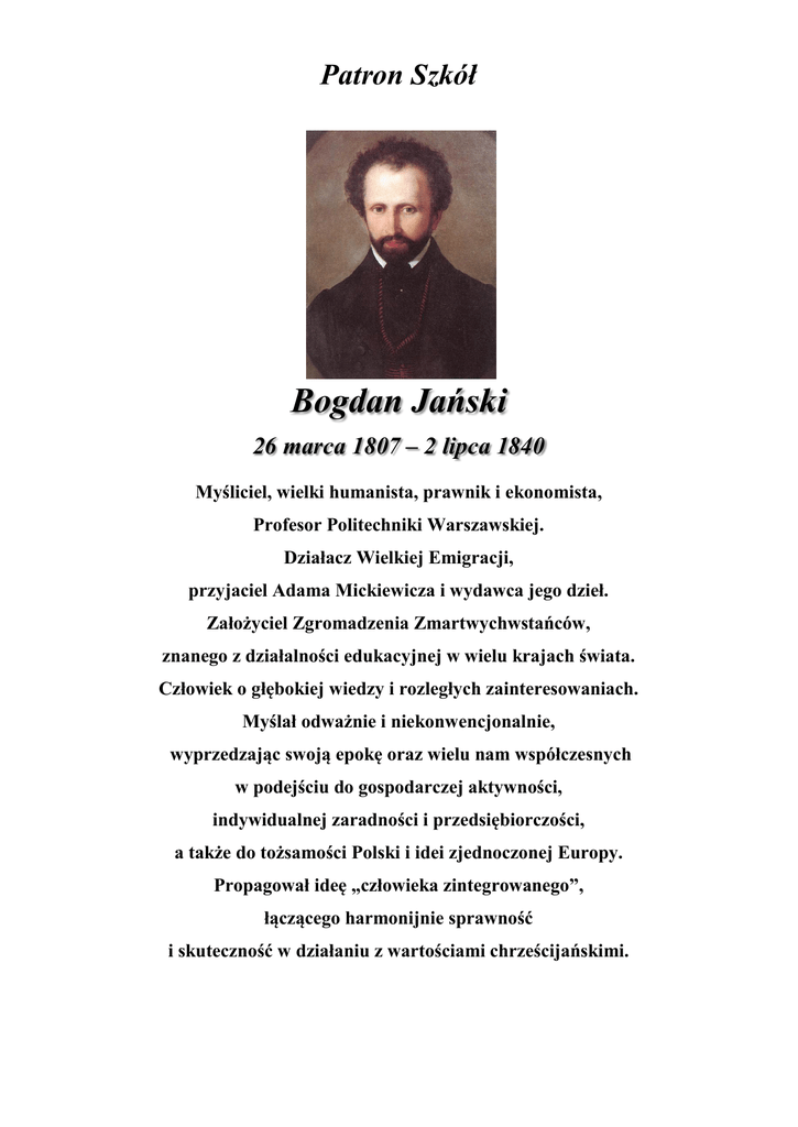 Patron Szkół Bogdan Jański 26 marca 1807 – 2 lipca 1840 Myśliciel, wielki humanista, prawnik i ekonomista, Profesor Politechniki Warszawskiej. Działacz Wielkiej Emigracji, przyjaciel Adama Mickiewicza i wydawca jego dzieł. Założyciel Zgromadzenia Zmartwychwstańców, znanego z działalności edukacyjnej w wielu krajach świata. Człowiek o głębokiej wiedzy i rozległych zainteresowaniach. Myślał odważnie i niekonwencjonalnie, wyprzedzając swoją epokę oraz wielu nam współczesnych w podejściu do gospodarczej aktywności, indywidualnej zaradności i przedsiębiorczości, a także do tożsamości Polski i idei zjednoczonej Europy. Propagował ideę „człowieka zintegrowanego”, łączącego harmonijnie sprawność i skuteczność w działaniu z wartościami chrześcijańskimi. Jan Paweł II o Słudze Bożym Bogdanie Jańskim: Bogdan Jański, profesor ekonomii politycznej, „pokutnik jawny” i świecki apostoł emigracji polskiej w Paryżu, znany jest członkom Wspólnoty jako „Brat Starszy” i jako Założyciel Zgromadzenia. Rozczarowany ruchami społecznopolitycznymi swojej epoki, uświadomił sobie, że prawdziwe „zmartwychwstanie” społeczeństwa może dokonać się jedynie poprzez głębokie nawrócenie do Boga i dawanie życiem świadectwa wiary w służbie bliźnim. Proces jego nawrócenia trwał około trzech lat. Pisał Bogdan Jański: Spodobało się Bogu użyć mnie za środek naszego braterskiego zjednoczenia.. Dziwnymi drogami prowadzi nas Bóg do swoich celów. Chociaż krótko przebywali razem, to jednak Bogdan zdołał głęboko wryć w serca pierwszych uczniów Piotra Semenenki i Hieronima Kajsiewicza swoją wizję odnowy społeczeństwa. Miał wtedy przed sobą zaledwie parę lat życia. W ciągu ostatnich pięciu lat oddał się całkowicie pracy nad dogłębnym nawróceniem i posłudze swoim rodakom w Paryżu. Gdy zmarł w Rzymie 2 lipca 1840 roku, uznany został za męża świętego nie tylko przez członków Zgromadzenia, ale również przez wszystkich spoza Zgromadzenia, którzy korzystali z jego duchowej posługi. /Fragment homilii Ojca św. Jana Pawła II z okazji 150-lecia powstania Zgromadzenia Rzym 4 I 1987 r./ CZŁOWIEK ZE ŚRODOWISKA SZKÓŁ JAŃSKIEGO TO: wierny Bogu, krzyżowi i Ewangelii kierujący się w życiu wartościami chrześcijańskimi kreatywny profesjonalista pilny w zdobywaniu wiedzy zintegrowana osobowość pilnie poszukiwany na rynku pracy kompetentny i sumienny pracownik lider i społecznik Bogdan Jański Bogdan Jański urodził się 26 marca 1807 roku w Lisowie koło Grójca. W wieku sześciu lat, w związku z kłopotami finansowymi rodziców, zamieszkał w Niestępowie koło Pułtuska u swej ciotki i z jej synami przygotowywał się do nauki w szkole. W 1813 roku rozpoczął edukację w szkole elementarnej w Pułtusku. Z powodu pogłębiającego się ubóstwa i separacji rodziców, jako 11-letni chłopiec, musiał zająć się wychowaniem swoich dwóch młodszych braci. Mimo licznych, ponad miarę obciążających go obowiązków, w swej klasie zajmował pierwsze miejsce. 29 sierpnia 1822 roku otrzymał świadectwo maturalne. Aby wspomóc rodzinę i zarobić na studia, rozpoczął pracę w szkole w Pułtusku. W tym okresie zaczął w jego duszy narastać bunt przeciw dotychczas wyznawanym wartościom religijnym. Porzucił pracę i przeprowadził się do Warszawy, pozostawiając opiekę nad matką młodszym braciom. 18 sierpnia 1823 roku zapisał się na Wydział Prawa Uniwersytetu Warszawskiego. Okres studiów to dla niego czas poznawania innych systemów filozoficznych, rzucenia się w wir rozmaitych przyjemności i w konsekwencji odejście od wiary katolickiej. Studia zakończył w 1827 roku uzyskaniem magisterium z prawa i ekonomii politycznej. Rok później wygrał konkurs na stanowisko profesora ekonomii w tworzonym Instytucie Politechnicznym w Warszawie. Wraz ze stanowiskiem otrzymał stypendium na podróż naukową po Europie Zachodniej. Wyjazd opóźniła nagła decyzja poślubienia Aleksandry Zawadzkiej. Ślub odbył się 23 października 1828 roku. Dzień później Bogdan Jański opuścił Polskę, by nigdy już do niej nie powrócić. Lata 1828-1830 Jański spędził na zapoznawaniu się z działalnością Szkoły Handlu i Przemysłu w Paryżu, podróżował do Londynu, tłumaczył na język francuski „Konrada Wallenroda”, udzielał się w środowiskach związanych z ruchem saintsimonistycznym. 13 grudnia 1830 roku w Londynie podano oficjalnie wiadomość o wybuchu powstania listopadowego. Po otrzymaniu wieści o upadku powstania i rozłamie w ruchu saintsimonistycznym Jański zerwał stosunki z jego przedstawicielami. W tym czasie rozpoczęła do Paryża napływać fala emigrantów. Na początku 1832 roku postanowił rozpocząć pracę wśród Polaków na emigracji. Wygnańcom brakowało środków materialnych, ale też nadziei i właściwego kierownictwa duchowego. Sam Jański przeżywał również kłopoty finansowe i zdrowotne. 12 sierpnia 1832 roku spotkał się z Adamem Mickiewiczem. Częste kontakty, wspólne ideały i poglądy doprowadziły do tego, że postanowili wspólnie zamieszkać, a ich mieszkanie stało się miejscem spotkań nie tylko najwybitniejszych emigrantów, ale także francuskich polityków i redaktorów czasopism. W tym samym roku został redaktorem „Pielgrzyma Polskiego”. W piśmie tym znalazły się liczne artykuły Adama Mickiewicza, jak również samego Jańskiego. W tym okresie rozpoczął się w jego duszy proces nawrócenia. W dniach od 24 listopada 1834 do 10 stycznia 1835 podczas pięciu spotkań z ks. Chossotte odbył spowiedź i otrzymał rozgrzeszenie. Od tego momentu Jański rozpoczął pracę nad rozwojem życie religijnego wśród emigrantów. Z czasem wokół niego zaczęła powstawać grupa osób przepojonych ideami odrodzenia życia politycznego, narodowego i religijnego. W 1834 roku współtworzył Stowarzyszenie Braci Zjednoczonych, którego dział