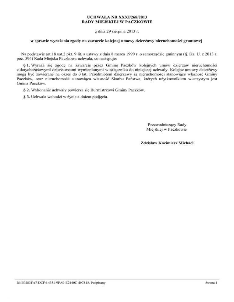 UCHWAŁA NR XXXI/268/2013 RADY MIEJSKIEJ W PACZKOWIE z dnia 29 sierpnia 2013 r. w sprawie wyrażenia zgody na zawarcie kolejnej umowy dzierżawy nieruchomości gruntowej Na podstawie art.18 ust.2 pkt. 9 lit. a ustawy z dnia 8 marca 1990 r. o samorządzie gminnym (tj. Dz. U. z 2013 r. poz. 594) Rada Miejska Paczkowa uchwala, co następuje: § 1. Wyraża się zgodę na zawarcie przez Gminę Paczków kolejnych umów dzierżaw nieruchomości z dotychczasowymi dzierżawcami wymienionymi w załączniku do niniejszej uchwały. Kolejne umowy dzierżawy mogą być zawierane na okres do 3 lat. Przedmiotem dzierżawy są nieruchomości stanowiące własność Gminy Paczków, oraz nieruchomość stanowiąca własność Skarbu Państwa, których użytkownikiem wieczystym jest Gmina Paczków. § 2. Wykonanie uchwały powierza się Burmistrzowi Gminy Paczków. § 3. Uchwała wchodzi w życie z dniem podjęcia. Przewodniczący Rady Miejskiej w Paczkowie Zdzisław Kazimierz Michael Id: E0283FA7-DCF4-4351-9FA9-E2440C1BC518. Podpisany Strona 1 Załącznik Nr 1 do Uchwały Nr XXXI/268/2013 Rady Miejskiej w Paczkowie z dnia 29 sierpnia 2013 r. Lp. 1 2 3 4 5 6 7 8 9 10 11 12 Nr ew. działki Cz. dz. 1109 Cz. dz. 143/1 Cz. dz. 1262/21 Cz. dz. 434/1 Cz. dz. 591/4 Cz. dz. 434/1 Cz. dz. 609/6 Cz. dz. 549/2 Cz. dz. 683/6 Cz. dz. 526/1 Cz. dz. 94 Cz. dz. 1262/21 Adres dzierżawy Paczków, ul. Zawadzkiego Wilamowa 2a Paczków, ul. Jagiellońska Paczków, ul. Kościuszki Paczków, ul. Bartosza Paczków, ul. Kościuszki Paczków, ul. Robotnicza Dziewiętlice Paczków, ul. Daszyńskiego Paczków, ul. Robotnicza Paczków, ul. Mostowa Paczków, ul. Jagiellońska Id: E0283FA7-DCF4-4351-9FA9-E2440C1BC518. Podpisany Powierzchnia nieruchomości 2,9242 ha 0,2737 ha 400 m² 1/20 część gruntu (67,30 m²) 162 m² 1/20 część gruntu (67,30 m²) 12,5 m² 0,35 ha 108 m² 5 m² 5 m² 5 m² Przeznaczenie nieruchomości Cmentarz komunalny Cmentarz komunalny Komis samochodowy Grunt pod zabudowę garażową Ogródek warzywny Grunt pod zabudowę garażową Grunt pod garaż Cele rolne Ogródek warzywny Tablica reklamowa o pow. 3,45 m² Tablica reklamowa o pow. 3,45 m² Tablica reklamowa o pow. 3,45 m² Obręb 0001 0012 0001 0001 0001 0001 0001 0002 0001 0001 0001 0001 Strona 1 Przewodniczący Rady Miejskiej w Paczkowie Zdzisław Kazimierz Michael Id: E0283FA7-DCF4-4351-9FA9-E2440C1BC518. Podpisany Strona 2 Uzasadnienie: Zgodnie z art. 18 ustawy o samorządzie gminnym, do wyłącznej właściwości Rady Miejskiej należy podejmowanie uchwał w sprawach majątkowych gminy, przekraczających zakres zwykłego zarządu, dotyczących zasad: nabywania, zbywania i obciążania nieruchomości oraz ich wydzierżawiania lub wynajmowania na czas oznaczony dłuższy niż 3 lata lub na czas nieoznaczony. Uchwała Rady Miejskiej jest wymagana również w przypadku, gdy po upływie zawartej na czas oznaczony do 3 lat strony zamierzają zawrzeć kolejne umowy, których przedmiotem jest ta sama nieruchomość. W tej sytuacji Burmistrz może zawrzeć kolejną umowę wyłącznie za zgodą Rady Miejskiej. Niniejsza uchwała dotyczy wyrażenia zgody na zawarcie kolejnej umowy z dotychczasowymi dzierżawcami następujących działek: • Nieruchomość oznaczona jako działka o numerze Ew. 1109 (Bi) położona w Paczkowie przy ul. Zawadzkiego oraz nieruchomość oznaczona jako działka o numerze Ew. 143/1 (Bi) położona w Wilamowej 2a, na których usytuowane są cmentarze komunalne stanowiące własność Gminy Paczków, były dzierżawione na czas oznaczony do trzech lat. Dotychczasowy Dzierżawca wystąpił z wnioskiem do Burmistrza Gminy Paczków o zawarcie kolejnej umowy dzierżawy przedmiotowych nieruchomości. Dzierżawca należycie wykonuje obowiązki wynikające z umowy dzierżawy. • Nieruchomość oznaczona jako działka o numerze Ew. 1262/21 (RIIIb) położona w Paczkowie przy ul. Jagiellońskiej stanowiąca własność Gminy Paczków, była dzierżawiona na czas oznaczony do trzech lat z przeznaczeniem na komis samochodowy. Dotychczasowy Dzierżawca wystąpił z wnioskiem do Burmistrza Gminy Paczków o zawarcie kolejnej umowy dzierżawy przedmiotowej nieruchomości. • Nieruchomość oznaczona jako działka o numerze Ew. 434/1 (B) położona w Paczkowie przy ul. Kościuszki, stanowiąca własność Skarbu Państwa, której użytkownikiem wieczystym jest Gmina Paczków była dzierżawiona na czas oznaczony do trzech lat z przeznaczeniem na grunt pod zabudowę garażową. Dotychczasowi Dzierżawcy wystąpili z wnioskiem do Burmistrza Gminy Paczków o zawarcie kolejnej umowy dzierżawy przedmiotowej nieruchomości. • Nieruchomość oznaczona jako działka o numerze Ew. 591/4 (Bp) położona w Paczkowie przy ul. Bartosza stanowiąca własność Gminy Paczków, była dzierżawiona na czas oznaczony do trzech lat z przeznaczeniem na ogródek warzywny. Dotychczasowy Dzierżawca wystąpił z wnioskiem do Burmistrza Gminy Paczków o zawarcie kolejnej umowy dzierżawy przedmiotowej nieruchomości. • Nieruchomość oznaczona jako działka o numerze Ew. 609/6 (Bi) położona w Paczkowie przy ul. Robotniczej stanowiąca własność Gminy Paczków, była dzierżawiona na czas oznaczony do trzech lat z przeznaczeniem na grunt pod garaż. Dotychczasowy Dzierżawca wystąpił z wnioskiem do Burmistrza Gminy Paczków o zawarcie kolejnej umowy dzierżawy przedmiotowej nieruchomości. • Nieruchomość oznaczona jako działka o numerze Ew. 549/2 (RIVa, PsIV) położona w Dziewiętlicach stanowiąca własność Gminy Paczków, była dzierżawiona na czas oznaczony do trzech lat z przeznaczeniem na cele rolne. Dotychczasowy Dzierżawca wystąpił z wnioskiem do Burmistrza Gminy Paczków o zawarcie kolejnej umowy dzierżawy przedmiotowej nieruchomości. • Nieruchomość oznaczona jako działka o numerze Ew. 683/6 (B) położona w Paczkowie przy ul. Daszyńskiego stanowiąca własność Gminy Paczków, była dzierżawiona na czas oznaczony do trzech lat z prz