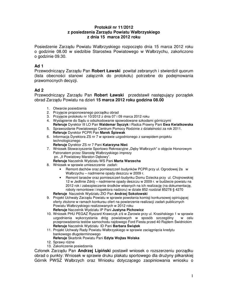 1 Protokół nr 11/2012 z posiedzenia Zarządu Powiatu