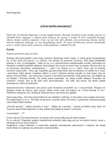 Sara Kasprzak ,,Utwór bardzo niesceniczny” Zmierzcha. Do kościoła skąpanego w mroku zagląda Księżyc. Rzucając mozaikowe snopy światła, sprawia, że odrobinki kurzu, pląsające w niemym tańcu wdzięczą się, prosząc o uwagę. W ławce nieopodal bocznego ołtarza chrapie osobliwy jegomość. Unosi się nad nim odór alkoholu, pod przenoszoną koszulą słychać miarowe łomotanie utulonego we śnie niespokojnego ducha. W worku osierdziowym, prawym przedsionku serca, w okolicy ujścia zatoki wieńcowej, siedzi pogrążona w refleksji Prawda. Prawda Szeptem przemawia sama do siebie: Każdego dnia poszczególne części mego jestestwa obumierają wbrew logice, w cichej agonii przypominając mi, że być może jest jeszcze o co walczyć. Nie potrafię im ponownie zawierzyć. Zbyt długo pokładałam nadzieję w tym, co nieosiągalne... Zdaje mi się, że w nieskończoność podejmowałam wysiłki, zmierzające do obnażenia wszelkich ludzkich zakłamań. Dość jednak! Nie ma już we mnie wiary na zmianę. Mój kres jawi się na horyzoncie przeszłości, teraźniejszości i ... jutra? Czy istnieje m o j e jutro? Teraz, gdy nie potrafię zawierzyć samej sobie... Teraz, gdy wygasłam, gdy pierwotnej formy nikt nie namierzy, bo zatarła się w czasie i przestrzeni. Jakże patrzeć wrogiemu odbiciu w oczy? Adamowe plemię uczyniło ze mnie kogoś, kim nie jestem. Kim nie byłam... Nie żywię żalu, iż poszli w niewłaściwym kierunku. Wiek gonił wiek, oni oddalali się od Jedynej i Wiecznej Prawdy, Tej, której jestem namiastką. Tej, której światło odbijam. Wszystkie ich wymówki, wyrzuty, żale są dla mnie tylko potwierdzeniem... Nie tylko mój koniec, tak bardzo jednak nieostateczny, zbliża się dyskretnie. Samounicestwienie wykluczono nim jeszcze samo brzmienie przerodziło się w rzeczywistość. Przejście do drugiego świata nie dotyczy mnie jeszcze. Minie trochę czasu nim połączę się z Żywą Prawdą. To nic... Niebawem ostateczny cios i anihilacja. Ród człowieczy sam kreśli swą zagładę. Znam moją misję... Do końca mam kołatać do serc ludzkich z nadzieją, iż choć jedne wrota zostaną otworzone. Do ostatecznego k o ń c a. Nie lubię się narzucać, wszystko zależy od wyboru. Z godnością i pokorą przyjmuję więc kolejne niepowodzenia. „Powiedz prawdę.”, „Spójrz prawdzie w oczy.”, „Mijasz się z prawdą.” - dziwne są ludzkie istoty, łatwo im wyrzucać innym brak znajomości ze mną, jednak sami lękają się stanąć w szczerości. Co pozostaje? ... ?!? Z kim walczyć? Nie jestem herosem, nie stawię czoła rzeszy bełkoczących malwersantów. Po co walczyć? Pragnienie podjęcia jakiejkolwiek polemiki jedną nogą jest już na tamtym świecie, razem z afirmacją życia ma się ku końcowi. Perspektywy zmian? Marniały w zestawieniu aspektów nierozłącznie wplecionych w istnienie, bez skargi traciły blask, by rozpłynąć się ostatecznie i niezauważalnie. 1 Nie oszukuję się... O iluzoryczna ideo! Jakże mogłabym zadać kłam samej sobie? Koniec nadejdzie, przyjdzie niebawem... Mój kres będzie jednak inny... P o ł ą c z e n i e. Słychać kroki. Z okolic żyły głównej aorty powoli wyłaniają się pojedyncze dźwięki, śmiechy i wesołe pokrzykiwania. Do serca dostają się Miłość, Wiara i Nadzieja. Nim jedno serca bicie przeminie, już Prawda śle ukłony w stronę przybyłych i serdecznie się z nimi wita. Nastrój w prawym przedsionku wyraźnie zmienia się, melancholia na chwilę ustępuje beztrosce. Nadzieja wyraźnie uradowana spotkaniem Chwycić raz jeszcze obraz Twój oczami, przyuważyć jasności kształty płynne... Nie śmiałam śnić. Tyle czasu już w rozłące... Finezja - zdumienie, gdy lśnienie opływa nas w bieli. Powab esencję w wir przedziwny sprasza... I pragnę posiąść i chwycić muszę nieskazitelności rozkosz Twoją. Zrywam tchnienie, by walcować tu i nucić, zwinnie wkradam się w blask Blasku, by scalić niepojętość. Prawda dyskretnie ocierając lękliwie spływającą po strukturze nieskazitelną substancję Nie widzisz m n i e. Obraz pradawny, obraz odległy zawitał przed spojrzeniem kwintesencji istnienia Twego. Z tejże samej materii powstałe, odrazy wynaturzeń ludzkich na nas płodzonych ujrzeć nie chcemy. Dziewicza postać moja przed Tobą się obnaża, choć od w t e d y, mnie samej nie dano uchwycić artyzmu kryształów konstelacji barw, należącej do mnie w istocie. Zapomniałam... Zapomniałam, kim jestem. Kim byłam... Spójrz dokładniej. Nadzieja Choć dostrzegam urok stary, słowa Twoje zmianę wnoszą. Drobne skazy u podstawy cień w jasności Twej rozproszyć zdołały. Skąd myśl, że przekształcenia drobne gorsze, niż minione wdzięki? Wiara Zasmucona chwyta Prawdę za ręce, by spenetrować jej wnętrze przenikliwością. Widzi nagą pustkę, skuloną między jednym promień światła a przebłyskiem prostoty. Brak zawierzenia w cokolwiek i nic, wyraźnie ją niepokoi. Kuzynko, czemuż to strapienie Cię przepełnia. Skąd boleści gorzkie dźwięki w mowę Twoją się wkradają? Wdzięczna szczerość Twoja nieprzerwanie ostoją była dla nas. Kroczyć ślepo Twym szlakiem? Ruszę zrazu. Żadna wyrwa mi niestraszna, mosty Twoje wytrzymały nazbyt wiele. Przewodnikiem moimś, gwiazdą, co do szczęścia przywodzi. Któż moc ma by skalać nieskalane? Nie uwierzę, że potęga jakaś mroczna światło Twoje przykryć zdolna. W pomieszczeniu gości się nieprzerywalna Cisza. Nawet najbardziej zmysłowe tony nie otrzymają pozwolenia dostępu. Cisza przenika, ukaja i rozdziera. Siostry patrzą na Prawdę i oczekują rozpieczętowania tajemnicy. Prawda smutna, odwraca się tyłem do rozmówczyń, nastrój wyraźnie p o n u r z e j e Człowiek.... Nadzieja Człowiek? To jakby woda góry obalić była zdolna. Czy źdźbło kołysane na wietrze opór stawić mu zdolne? Jak płatek śniegu ma się do ognia? Cień miałby Słońcu zagrozić? Świat wcią