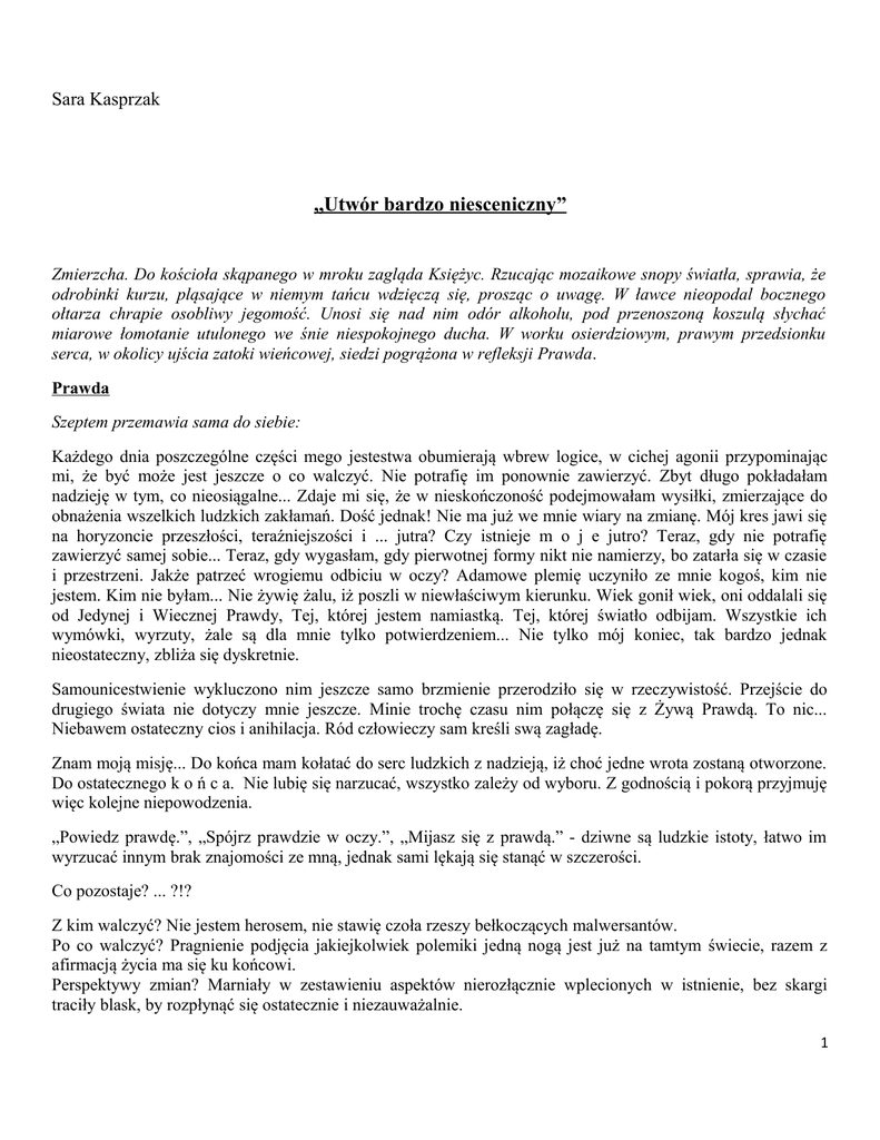 Sara Kasprzak, Utwór bardzo niesceniczny