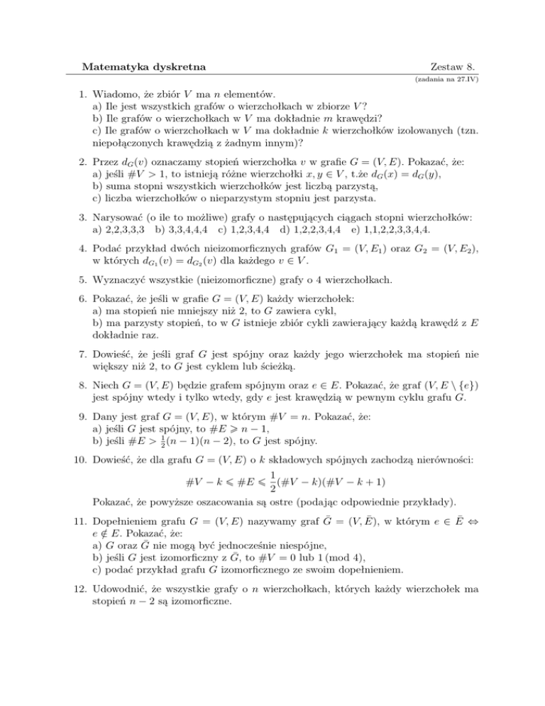 Matematyka dyskretna Zestaw 8. 1. Wiadomo, że zbiór V ma n