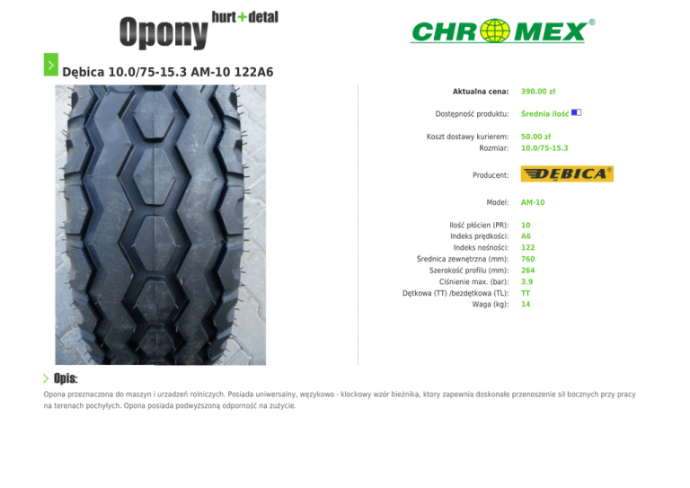Dębica 10.0/75-15.3 AM-10 122A6 Aktualna cena: Dostępność produktu: Koszt dostawy kurierem: Rozmiar: 390.00 zł Średnia ilość 50.00 zł 10.0/75-15.3 Producent: Model: AM-10 Ilość płócien (PR): 10 Indeks prędkości: A6 Indeks nośności: 122 Średnica zewnętrzna (mm): 760 Szerokość profilu (mm): 264 Ciśnienie max. (bar): 3.9 Dętkowa (TT) /bezdętkowa (TL): TT Waga (kg): 14 Opona przeznaczona do maszyn i urzadzeń rolniczych. Posiada uniwersalny, węzykowo - klockowy wzór bieżnika, ktory zapewnia doskonałe przenoszenie sił bocznych przy pracy na terenach pochyłych. Opona posiada podwyższoną odporność na zużycie.