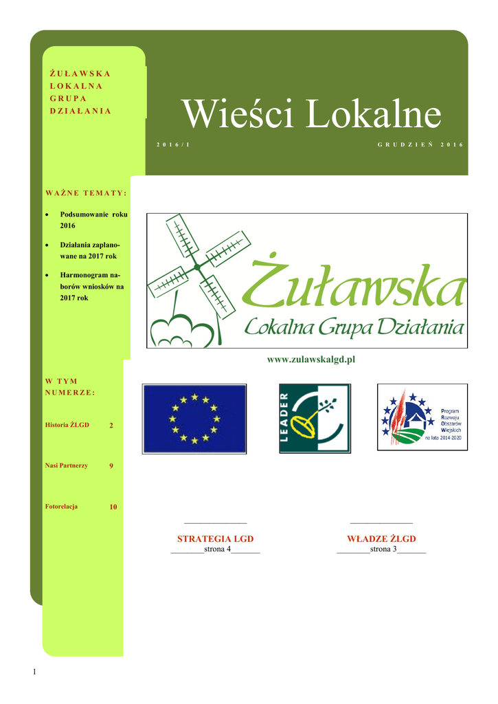 ŻUŁAWSKA LOKALNA GRUPA DZIAŁANIA Wieści Lokalne 2 0 1 6 / I G R U D Z I E Ń WAŻNE TEMATY: Podsumowanie roku 2016 Działania zaplanowane na 2017 rok Harmonogram naborów wniosków na 2017 rok www.zulawskalgd.pl W TYM NUMERZE: Historia ŻLGD 2 Nasi Partnerzy 9 Fotorelacja 10 _______________ 1 _______________ STRATEGIA LGD WŁADZE ŻLGD ________strona 4_______ ________strona 3_______ 2 0 1 6 STR. 2 Czym jest Żuławska Lokalna Grupa Działania? To rodzaj terytorialnego tworzonego zwykle na obszarach wiejskich, zrzeszającego przedstawicieli lokalnych organizacji ( z sektora publicznego, prywatnego i pozarządowego) oraz mieszkańców danego obszaru wyznaczonego granicą gmin członkowskich. Historia Kalendarium opisujące poszczególne etapy powstawania ŻLGD znajdziecie na naszej stronie internetowej: www.zulawskalgd. pl 2 Pomysł utworzenia Lokalnej Grupy Działania, obejmującej powiat malborski, pojawił się wśród przedstawicieli gmin oraz oddziału Pomorskiego Ośrodka Doradztwa Rolniczego w Starym Polu. W maju 2007 r. podjęto pierwsze uchwały w sprawie przystąpienia do Lokalnej Grupy Działania. Przyjęto wówczas Gminę Malbork oraz Gminę Lichnowy. W dniu 17 lipca 2007 r. została podpisana umowa o współpracy partnerskiej pomiędzy gminami: Lichnowy, Malbork, Miłoradz, Nowy Staw, Stare Pole oraz powiatem malborskim. Jej celem było podjęcie współpracy samorządów w zakresie utworzenia Lokalnej Grupy Działania oraz opracowania Lokalnej Strategii Rozwoju. 23 marca 2008 r. odbyło się pierwsze Walne Zebranie Członków, na którym uchwalony został Statut stowarzyszenia. Zarząd, Komisja Rewizyjna i Rada zostały wybrane na drugim Walnym Zebraniu Członków w dniu 16 czerwca 2008 r. Lokalna Grupa Działania Spichlerz Żuławski została zarejestrowana 7 października 2008 r. w Krajowym Rejestrze Sądowym W 2015 roku 5 gmin z powiatu nowodworskiego, tj. Stegna, Sztutowo, Krynica Morska, Ostaszewo i Nowy Dwór Gdański przystąpiło do Lokalnej Grupy Działania Spichlerz Żuławski. Tym samym obszar działania Lokalnej Grupy Działania Spichlerz Żuławski powiększył się o powiat nowodworski. 10 czerwca 2015 r. Nadzwyczajne Walne Zebranie Członków Lokalnej Grupy Działania Spichlerz Żuławski jednogłośnie podjęło decyzję o zmianie nazwy stowarzyszenia na Żuławska Lokalna Grupa Działania. STR. 3 Władze stowarzyszenia Michał Chrząszcz Prezes Zarządu ŻLGD 1. Prezes Zarządu – Gmina Ostaszewo reprezentowana przez Michała Chrząszcza 2. Wiceprezes Zarządu – Gmina Pole reprezentowana 7. 3. Nowy Staw reprezentowana przez Jerzego Szałacha Skarbnik – Gmina Nowy Dwór 4. Gdański reprezentowana przez Jacka Michalskiego Sekretarz – Gmina Miłoradz 8. Członek Zarządu - Gmina Mia- 5. reprezentowana przez Arkadiusza Skorka Członek Zarządu - Gmina Ste- 9. Członek Zarządu - Rajmund 6. gna reprezentowana przez Tomasza Gajewskiego Członek Zarządu - Gmina Stare przez Marka Szczypiora Członek Zarządu - Gmina Malbork reprezentowana przez Marcina Kwiatkowskiego sta Krynica Morska reprezentowane przez Krzysztofa Swata Kossarzecki Komisja Rewizyjna 1. Stowarzyszenie Wspiera- i Rozwoju "Perspektywa" re- 4. sji rewizyjnej PHU LIMKAR repre- nia Aktywności Lokalnej prezentowane w Lasowicach Wielkich przez Małgorzatę Święcką - zentowany reprezentowany Wiceprzewodnicząca Komi- przez Dagmarę Karo- przez Danutę Zalewską - sji Rewizyjnej Gminny Ośrodek Kultury i lak- członek Przewodnicząca 3. Komisji Rewizyjnej 2. Stowarzyszenie na Rzecz Oparcia Społecznego komisji rewizyjnej Sportu w Starym Polu reprezentowany przez Elżbietę Grzybowską - członek komi- Rada ŻLGD 1. Biuro Kompleksowej Obsługi Firmy J&J s.c. reprezen- 6. Gminny Dom Kultury i Sportu w Ostaszewie reprezentowane przez Jarosława Filipczak (Przewodniczący RADY) 7. 2. Stowarzyszenie Przyjaciół Nowego Dworu Gdańskiego -Klub Nowodworski reprezentowanego przez Marka towane przez Monikę Zadrożną Agencja ALFA Adrian Bogusłowicz reprezentowana przez Adriana Bogusłowicza Tomasz Sosnowski 8. 9. Gospodarstwo Rolne Bartłomiej Zalewski reprezento- 3. Opitza (Wiceprzewodniczący) Gminny Ośrodek Kultury i Sportu w Miłoradzu repre- 4. zentowane przez Marcina Szesza AZ Robert Zieliński reprezentowany przez Roberta 10. Zbigniew Puzio 11. Lokalna Grupa Rybacka- Rybacka Brać Mierzei repre- 5. Zielińskiego Stowarzyszenie Coolturalny Nowy Staw reprezentowa- zentowana przez Tomasza Szczepańskiego Stowarzyszenie Przyjazne Przedszkole reprezentowane ne przez Krzysztofa Osijewskiego 3 wane prze Bartłomieja Zalewskiego 12. przez Michała Zielskiego STR. 4 Strategia LGD Pełen dokument strategii, możecie znaleźć na naszej stronie internetowej w zakładce dokumenty. Podpisanie umowy o warunkach i sposobie realizacji RLKS, Gdańsk 23.05.2016r. 4 Strategia Rozwoju Lokalnego Kierowanego przez Społeczność powstawała przy czynnym udziale lokalnej społeczności. Zastosowano 10 różnych metod partycypacji na pięciu najważniejszych etapach prac. Nad uporządkowaniem wszystkich zebranych materiałów czuwali członkowie Zespołu ds. LSR, który został powołany na początku sierpnia 2015 roku. Rekrutacja do zespołu roboczego była otwarta, a każda zainteresowana osoba mogła wziąć czynny udział w opracowaniu LSR. Opracowanie dokumentu Strategii składało się z 5 etapów: 1. Etap I – diagnoza i analiza SWOT, 2. Etap II – określenie celów i wskaźników oraz opracowanie planu działania, 3. Etap III – opracowanie zasad wyboru operacji i ustalenia kryteriów wyboru, 4. Etap IV – opracowanie zasad monitorowania i ewaluacji, 5. Etap V – przygotowanie planu komunikacji. W dniach 18–21 sierpnia 2015 r. przeprowadzono konsultacje społeczne w każdej z gmin wchodzących w skład LGD. Spotkania te podzielone zostały na dwie części. W pierwszej mieszkańcy zapoznani zostali z założeniami programu Leader, w drugiej – warsztatowej, wypracowywali analizę SWOT (określali 