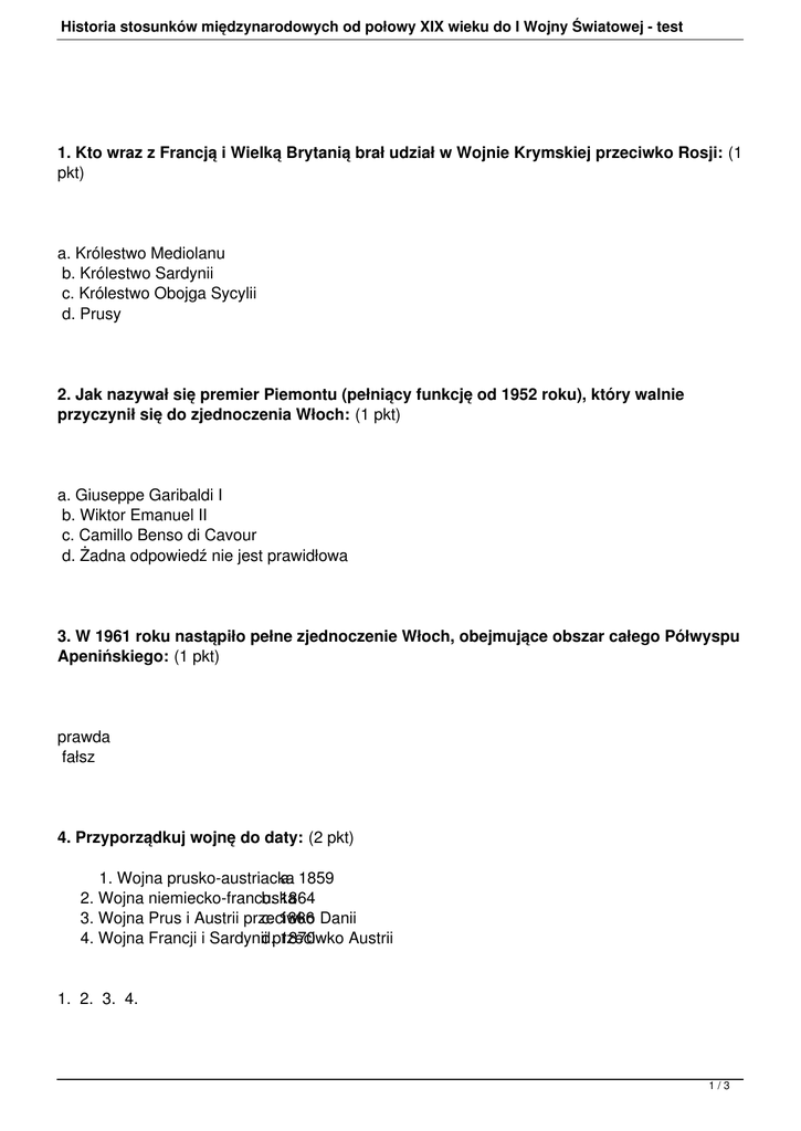 Historia stosunków międzynarodowych od połowy XIX wieku do I Wojny Światowej - test 1. Kto wraz z Francją i Wielką Brytanią brał udział w Wojnie Krymskiej przeciwko Rosji: (1 pkt) a. Królestwo Mediolanu b. Królestwo Sardynii c. Królestwo Obojga Sycylii d. Prusy 2. Jak nazywał się premier Piemontu (pełniący funkcję od 1952 roku), który walnie przyczynił się do zjednoczenia Włoch: (1 pkt) a. Giuseppe Garibaldi I b. Wiktor Emanuel II c. Camillo Benso di Cavour d. Żadna odpowiedź nie jest prawidłowa 3. W 1961 roku nastąpiło pełne zjednoczenie Włoch, obejmujące obszar całego Półwyspu Apenińskiego: (1 pkt) prawda fałsz 4. Przyporządkuj wojnę do daty: (2 pkt) 1. Wojna prusko-austriacka a. 1859 2. Wojna niemiecko-francuska b. 1864 3. Wojna Prus i Austrii przeciwko c. 1866 Danii 4. Wojna Francji i Sardyniid.przeciwko 1870 Austrii 1. 2. 3. 4. 1/3 Historia stosunków międzynarodowych od połowy XIX wieku do I Wojny Światowej - test 5. O jakie ziemie toczyła się wojna Prus i Austrii przeciwko Danii: (1 pkt) 6. Podaj imię i nazwisko męża stanu, który zjednoczył Niemcy "Krwią i Żelazem": (1 pkt) 7. Kongres Berliński odbył się po zakończeniu wojny rosyjsko-tureckiej trwającej w latach 1877-1878, ograniczył on wpływy Rosji na Bałkanach (1 pkt) prawda fałsz 8. Objaśnij jednym zdaniem, co to jest i czego dotyczy "entente cordiale": (2 pkt) 9. Przyporządkuj państwa do nazwy sojuszu, w którego skład wchodziły przed wybuchem pierwszej wojny światowej: (2 pkt) 1. Trójporozumienie (ententa) a. Rosja 2. Trójprzymierze b. Włochy c. Wielka Brytania d. Niemcy 1. 2. 2/3 Historia stosunków międzynarodowych od połowy XIX wieku do I Wojny Światowej - test 10. Z którym państwem Stany Zjednoczone toczyły wojnę w 1898 roku: (1 pkt) a. Z Hiszpanią b. Z Portugalią c. Z Francją d. Z Japonią 11. Podaj imię i nazwisko prezydenta Stanów Zjednoczonych urzędującego w pierwszej dekadzie XX wieku: (1 pkt) 12. Jaką wojnę zakończył traktat pokojowy w Portsmouth i w którym roku miało to miejsce: (2 pkt) Test został przygotowany na podstawie: 1. W. Dobrzycki, Historia stosunków międzynarodowych 1815-1945, Warszawa 2007. 3/3