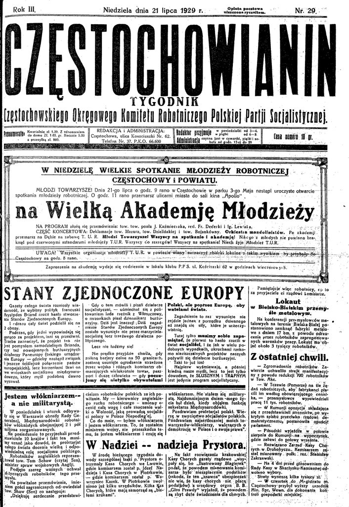 Rok III. Niedziela dnia 21 lipca 1929 r. O p ła ta p o c z to w a n is z c z o n a ry c z a łte m . Nr 29. TYGODNI K [znlodoisiieso fljumweie iwnileli ÄoliglBiiMio Pilsiiei Partii SeiialisltEzoti. - K w a rta ln ie zł. 1.30. Z o d n o s z e n ie m do d o m u Z ł. 1.65. gr. R o c z n ie 5.20 p rz e s y łk ą zł. 860. REDAKCJA i ADMINISTRACJA: I Częstochowa, ulica Koszciuszki Nr. 62. Telefon Nr. 37. P.K.O. 66.600 Ol piZ jljllB jS w p ią tk i o d 6 ^ -8 . I c z y n n a j e s t w c z w a r tk i, p ią tk i i so» _ b o t y o d g o d z : 17-ej_d o 20 « 1 0 er. W ^ N IE D Z IE L Ę _W IE L K IE ^ P O I]K A N IE _M ł^ C ^ S T O C H O IT ^ ^ MŁODZI TOWARZYSZE! Dnia 21-go lipca o godz. 9 rano w Częstochow ie w park u 3-go Maja n astąpi uroczyste otw arcie ” spotkania m łodzieży robotniczej. O godz. 11 rano przem arsz' ulicam i m iasta do sali kina „A pollo“ , . na Wielllą ARademję M|odzieży NA PROGRAM złożą się przemówienia; tow. Iow. posła J. K aźm ieciaka, red. Fr. D edeiki i Ig. L ew iala. ; ,a . a . CZĘŚĆ KONCERTOWA: Deklamacje łow. Mazura, tow. Dzielińskiej i tow. Bojankówny. O r k i e s t r a m a n d o lin is tó w . Po akademii'.przem arsz na Dębie na zabaw ę T. U. R. M łodzi T o w a rz y s z e ! W s z y s c y n a s p o t k a n i e i a k a d e n t j ę ! Nikcgo > m łodych nie powinno bra-. knąć poci czerwonymi sztandaram i młodzieży T.U.R. W szyscy co szeregów! W szyscy na spotkanie! N iech żyje Młodzież T.U.R. UWAGA! 'W sz y stk ie organizacje 'm ło9W Ż y3T. U. R. w pow iecie w in n y ‘ naznaczyć ,zbińrki lokalne -2 tak;m .wynikient by-przybyły-do-.na godz. 8 rano. •• -• -- — : - r y ‘----- ■- • . z ę s to c h o w w yy Zaproszenia na akademię wydaje się codziennie w lokalu klubu P.P S. ul. Kościuszki 62 w godzinach wieczorowy: li. STANY Gazety całego świata rozniosły wia domość, ze wybitny polityk francuski Arystydes Briand rzucił hasło stw orze nia Stanów Zjednoczonych Europy. 1 cdrazu cały świat podzielił się na 2 obozy. Podczas, gdy jedni wypowiadają się gorąco za projektem, inni są przeciwni. Trzeba zaznaczyć, że projekt ten nie jest pom ysłem samodzielnym Brianda, czy też powojennych burżuazyjnych działaczy Paneuropy (takiego urządze nia Europy —* gdzieby nastąpił związek i jeszcze ściślejsze połączenie państw europejskich), lecz korzeniami tkwi on we wnioskach socjalizmu międzynaro dowego, który myśl podobną dawno wysuwał. Jestem w łók n iarzem — a n ie m ilita ry stą . W poniedziałek i w torek o d byw a ły się w W arszawie obrady Rady G e neralnej, M iędzynarodów ki robotni ków włóknistych obejm ującej 2 i pół miljona zorganizow anych. ,Na posiedzenie to przyjechali przed stawiciele 10 krajów i fakt ten musi my uznać jako dow ód, że proletarjat całego św iata docenia wielką i odpo wiedzialną ro)ę socjalizmu polskiego. .Robotników angielskich reprezen tował tow. Tom Schaw (czytaj Szo), minister spraw wojskow ych Ahglji, , P o d ję to s z e r e g w a ż n y c h ' u c h w a ł d .ty c z ą c y c h ro b o tn ik ó w , te g o p rz e 'niysłu. ' . N a p o w ita ln e p rz e m ó w ie n ia , im ie niem g o ś c i z a g ra n ic z n y c h o d p o w ie d z ia ł Iow. S h a w ( S z o ) ć o n a s tę p u je : « D z ię k u ję s e r d e c z n ie p r z e d s t a w i - Gdy o tem mówili i.pisali działacze socjalistyczni, — uśmiechał się z poli towaniem lada rzeźnik z Włoszczowy, o mrzonkach pisał dziennikarz burżuazyjny. Dziś jest inaczej! ; Dziś zagad* nienie Stanów Zjednoczonych Europy zostało wysunięte nie przez marzycielasocjalistę lecz trzeźwego działacza po litycznego. Lecz nie łudźmy sięl Nie prędko przyjdzie chwila, gdy znikną barjery celne na 50 granicach, zostaną usunięte ogrodzenia strzeżone przez wojsko i różnych komisarzy ob macujących wielokrotnie towar, pasz port i duszę człowieka — gdy poczu EUROPY P o le k i, a le p o p t-zez E u r o p ę , . ob y w atelam i św iata. Zagadnienie to raz wysunięte nie zejdzie jednak z porządku dziennego aż znajdą się siły, które je urzeczy wistnią. Tutaj tylko m usim y so b ie zapa m iętać, że pierwsi to hasło rzucili w świat socjaliści, i że lak w wielu po dobnych wypadkach, okrucham i rzeko mo nieziszczalnych projektów naszych pożywili się działacze burżuazyjni, ’ Taki to już los! Najpierw wyśmiewają, a później kradną nasze myśli, lecz to jest tylko dowodem, że SŁUSZNYM i TRAFNYM jest jedynie program socjalistyczny. Pam iętajcie’ więc; robotnicy, cp to za przyjaciele ci rządowi lom iśarże. Lokaut w B ielsko-B ialskim p rz e m y śle m etalow ym . Na konferencji przemysłowców me talowych na terenie Bielska-Białej p o stanow iono zam knąć fabryki m etalo we z dniem 17 bm. z powodu- odrzu cenia przez robotników zaproponow a nych warunków pracy. LokaUt ńia "ob jąć około 3 tysięcy robotników . Z ostatniej chwili. — Zgrom adzenie robotnijców Za wiercia uchwaliło strejk manifestacyj ny z powodu redukcji 700 robotników w Tow. flkc. jem y się n ietylk o obyw atelam i — W Tczewie (Pomorze) na tle żą dań robotniczych, a b y ' fabrykanci pła cielom robotników polskich za ic h po włókniarzem. Nie stałem się m ilitary cili im według obowiązującego cenni wypowiedzieli witanie. My — kierownicy angielskie stą. Najdumniejszym dniem -m ego ży ka, — przemysłowcy go ruchu robotniczego - umiemy o- cia był dzień, kiedy objąłem funkcję pracę 11 tys. robotników. cenić całą wagę i całe znaczenie wal sekretarza M iędzynarodówki. — \V Rumunji opozycja składająca ki o W olność, jaką prow adzą socjaliś Pozdraw iam proletarjat polski. W ie się z przedstawicieli stronnictw, po wy rzę ,w zwycięstwo sócjalistów polskich. krytym spiskti przeciwko rządówi. deci polscy w Polsce Niepodleg’ej. Co do mnie’, — byłem włókniarzem, Pozdrawiam najserdeczniej moich', to- mokratyćznemug postanowiła opu