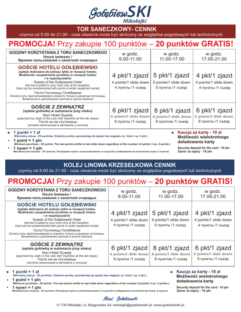 SKI Mikołajki TOR SANECZKOWY- CENNIK czynna od 9.00 do 21.00 - czas otwarcia może być skrócony ze względów pogodowych lub technicznych PROMOCJA! Przy zakupie 100 punktów – 20 punktów GRATIS! GODZINY KORZYSTANIA Z TORU SANECZKOWEGO Hours between / Времия пользования c канатной очередьи w godz. 9.00-11.00 w godz. 11.00-17.00 w godz. 17.00-21.00 GOŚCIE HOTELU GOŁĘBIEWSKI (opłata doliczana do pokoju tylko w recepcji hotelu. Możliwość uzupełnienia punktów w recepcji hotelu i w wypożyczalni) Guests of the Gołębiewski Hotel (the fee is added to your room only at the reception. Card can be complemented with points in winter equipment rental) 4 pkt/1 zjazd 5 pkt/1 zjazd 4 pkt/1 zjazd 4 points/1 slide down 5 points/1 slide down 5 пункты /1 съезд 4 пункты /1 съезд 4 points/1 slide down 4 пункты /1 съезд Гости Гостиницы Голeбевски Оплата эсть присчитываемая в комнату только в рецепци гостиницы. Возможность дополнения пунктов в пункте проката GOŚCIE Z ZEWNĄTRZ (opłata gotówką w automacie przy stoku) Non Hotel Guests (payment by cash in the coin slot machine at the ski slope) Гости из-за гостиницы 6 pkt/1 zjazd 8 pkt/1 zjazd 6 pkt/1 zjazd 6 points/1 slide down 8 points/1 slide down 6 points/1 slide down 6 пункты /1 съезд 6 пункты /1 съезд 8 пунктoв /1 съезд (оплата наличными в автомате у склона) 1 punkt = 1 zł Minimalny zakup - 25 punktów. Ostatnie punkty upoważniają do zjazdu bez względu na ilość ( np. 2 pkt ) 1 point = 1 pln Minimum purchase - 25 points. The last points entitle to last slide down regardless of the number of points ( f.ex. 2 points ) 1 пункт = 1 pln Минимальная покупка - 25 пунктов. Последние пункты уполномочивают в съезд без соображения на количество (напр. 2 пункта) Kaucja za kartę - 10 zł Możliwość wielokrotnego doładowania karty Security deposit for the card - 10 pln Залог за карту - 10 pln KOLEJ LINOWA KRZESEŁKOWA CENNIK czynny od 9.00 do 21.00 - czas otwarcia może być skrócony ze względów pogodowych lub technicznych PROMOCJA! Przy zakupie 100 punktów – 20 punktów GRATIS! GODZINY KORZYSTANIA Z TORU SANECZKOWEGO Hours between / Времия пользования c канатной очередьи w godz. 9.00-11.00 w godz. 11.00-17.00 w godz. 17.00-21.00 GOŚCIE HOTELU GOŁĘBIEWSKI (opłata doliczana do pokoju tylko w recepcji hotelu. Możliwość uzupełnienia punktów w recepcji hotelu i w wypożyczalni) Guests of the Gołębiewski Hotel (the fee is added to your room only at the reception. Card can be complemented with points in winter equipment rental) 4 pkt/1 zjazd 5 pkt/1 zjazd 4 pkt/1 zjazd 4 points/1 slide down 5 points/1 slide down 5 пункты /1 съезд 4 пункты /1 съезд 4 points/1 slide down 4 пункты /1 съезд Гости Гостиницы Голeбевски Оплата эсть присчитываемая в комнату только в рецепци гостиницы. Возможность дополнения пунктов в пункте проката GOŚCIE Z ZEWNĄTRZ (opłata gotówką w automacie przy stoku) Non Hotel Guests (payment by cash in the coin slot machine at the ski slope) Гости из-за гостиницы 6 pkt/1 zjazd 8 pkt/1 zjazd 6 pkt/1 zjazd 6 points/1 slide down 8 points/1 slide down 6 points/1 slide down 6 пункты /1 съезд 6 пункты /1 съезд 8 пунктoв /1 съезд (оплата наличными в автомате у склона) 1 punkt = 1 zł Minimalny zakup - 25 punktów. Ostatnie punkty upoważniają do zjazdu bez względu na ilość ( np. 2 pkt ) 1 point = 1 pln Minimum purchase - 25 points. The last points entitle to last slide down regardless of the number of points ( f.ex. 2 points ) 1 пункт = 1 pln Минимальная покупка - 25 пунктов. Последние пункты уполномочивают в съезд без соображения на количество (напр. 2 пункта) Kaucja za kartę - 10 zł Możliwość wielokrotnego doładowania karty Security deposit for the card - 10 pln Залог за карту - 10 pln 11-730 Mikołajki; ul. Mrągowska 34; [email protected]; www.golebiewski.pl SKI Mikołajki CENNIK WYPOŻYCZALNI RENTAL PRICES / ПРОКАТ - ЦЕНЫ KOMPLET NARCIARSKI SKI SET / ЛЫЖНЫЙ НАБОР Cena do 3 godz. Cena za 1 dzień w godz. 9.00-21.00 Wyłącznie dla Gości Hotelu Gołębiewski Cena za 2 dni Cena za 7 dni Price to 3 hours Цена до 3 часа Price per 1 day Цена за 1 день Price per 2 days Цена за 2 дня Price per 7 days Цена за 7 дней 35 zł 50 zł 80 zł 210 zł Wypożyczony komplet zawiera: narty, buty, kije Ski set includes: skis, boots, ski poles Набор содержит: лыжи, лыжные ботинки, лыжные палки Przechowalnia sprzętu cena storage locker / склады ilość godzin price / цена number of hours / количество часов 5 zł 8 zł 12 zł 20 zł 3 godz. 6 godz. 12 godz. 24 godz. Za rzeczy pozostawione w szafce hotel nie ponosi odpowiedzialności Hotel does not take any responsibilities for objects left in the storage locker За вещи оставленные в шкафчике гостиницу он не несёт ответственности KOMPLET SNOWBOARD SNOWBOARD SET / СНОУБОРД НАБОР Cena do 3 godz. Cena za 1 dzień w godz. 9.00-21.00 Price to 3 hours Цена до 3 часа Price per 1 day Цена за 1 день 35 zł 50 zł Wyłącznie dla Gości Hotelu Gołębiewski cena do 3 godz cena za 1 dzień Cena za 2 dni Cena za 7 dni price to