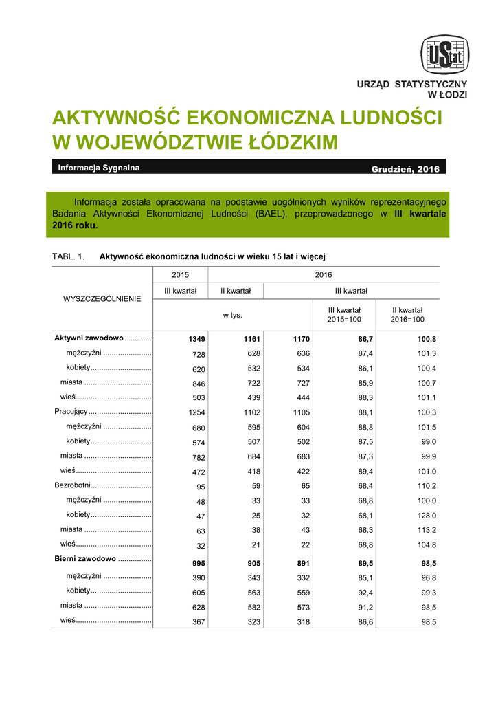 AKTYWNOŚĆ EKONOMICZNA LUDNOŚCI W WOJEWÓDZTWIE ŁÓDZKIM Grudzień, 2016 Informacja Sygnalna Informacja została opracowana na podstawie uogólnionych wyników reprezentacyjnego Badania Aktywności Ekonomicznej Ludności (BAEL), przeprowadzonego w III kwartale 2016 roku. TABL. 1. Aktywność ekonomiczna ludności w wieku 15 lat i więcej 2015 WYSZCZEGÓLNIENIE 2016 III kwartał II kwartał III kwartał III kwartał 2015=100 w tys. II kwartał 2016=100 Aktywni zawodowo ..................... 1349 1161 1170 86,7 100,8 mężczyźni ............................... 728 628 636 87,4 101,3 kobiety ..................................... 620 532 534 86,1 100,4 miasta ........................................ 846 722 727 85,9 100,7 wieś ............................................ 503 439 444 88,3 101,1 Pracujący ...................................... 1254 1102 1105 88,1 100,3 mężczyźni ............................... 680 595 604 88,8 101,5 kobiety ..................................... 574 507 502 87,5 99,0 miasta ........................................ 782 684 683 87,3 99,9 wieś ............................................ 472 418 422 89,4 101,0 Bezrobotni..................................... 95 59 65 68,4 110,2 mężczyźni ............................... 48 33 33 68,8 100,0 kobiety ..................................... 47 25 32 68,1 128,0 miasta ........................................ 63 38 43 68,3 113,2 wieś ............................................ 32 21 22 68,8 104,8 Bierni zawodowo ........................ 995 905 891 89,5 98,5 mężczyźni ............................... 390 343 332 85,1 96,8 kobiety ..................................... 605 563 559 92,4 99,3 miasta ........................................ 628 582 573 91,2 98,5 wieś ............................................ 367 323 318 86,6 98,5 AKTYWNOŚĆ EKONOMICZNA LUDNOŚCI W WOJEWÓDZTWIE ŁÓDZKIM 2 AKTYWNOŚĆ EKONOMICZNA LUDNOŚCI W WOJEWÓDZTWIE ŁÓDZKIM W III kwartale 2016 r. zbiorowość aktywnych zawodowo w województwie łódzkim, według danych BAEL, liczyła 1170 tys. osób, a biernych zawodowo 891 tys. osób. Liczba aktywnych zawodowo zmniejszyła się w stosunku do III kwartału 2015 r. o 179 tys. osób (o 13,3%), a liczba osób biernych zawodowo zmalała w tym okresie o 104 tys. (o 10,5%). W grupie aktywnych zawodowo odnotowano spadek zarówno liczby pracujących – o 149 tys. osób (o 11,9%), jak i bezrobotnych – o 30 tys. osób (o 31,6%). WYKRES 1. Zmiany na rynku pracy w III kwartale 2016 r. Tabl. 2. Ludność w wieku 15 lat i więcej według statusu na rynku pracy, wieku i poziomu wykształcenia Aktywni zawodowo WYSZCZEGÓLNIENIE pracujący razem Bierni zawodowo bezrobotni w tys. III KWARTAŁ 2016 OGÓŁEM ......................................... 1170 1105 65 891 w tym w wieku produkcyjnyma ... 1124 1060 65 324 15-24 lata ......................................... 88 77 11 161 25-34................................................ 304 284 20 39 35-44................................................ 316 301 14 42 45-54................................................ 255 247 8 41 55 lat i więcej ................................... 208 195 12 607 Wyższe ............................................ 365 350 15 92 Policealne i średnie zawodowe ........ 317 306 11 163 Średnie ogólnokształcące ................ 126 116 11 103 Zasadnicze zawodowe ..................... 287 266 21 177 Gimnazjalne, podstawowe i niepełne podstawowe ................. 75 68 7 357 Według wieku: Według poziomu wykształcenia: a Mężczyźni 18-64 lata, kobiety 18-59 lat. 3 AKTYWNOŚĆ EKONOMICZNA LUDNOŚCI W WOJEWÓDZTWIE ŁÓDZKIM Tabl. 2. Ludność w wieku 15 lat i więcej według statusu na rynku pracy, wieku i poziomu wykształcenia (dok.) Aktywni zawodowo WYSZCZEGÓLNIENIE pracujący razem Bierni zawodowo bezrobotni w tys. III KWARTAŁ 2015 OGÓŁEM ......................................... 1349 1254 95 995 w tym w wieku produkcyjnyma ... 1299 1206 93 398 15-24 lata ......................................... 107 88 19 198 25-34................................................ 374 345 29 58 35-44................................................ 348 332 16 47 45-54................................................ 287 270 17 52 55 lat i więcej ................................... 234 219 14 640 Wyższe ............................................ 413 395 18 96 Policealne i średnie zawodowe ........ 361 341 20 178 Średnie ogólnokształcące ................ 152 140 12 127 Zasadnicze zawodowe ..................... 330 300 30 198 Gimnazjalne, podstawowe i niepełne podstawowe ............... 92 78 15 397 Według wieku: Według poziomu wykształcenia: a Mężczyźni 18-64 lata, kobiety 18-59 lat. Głębszy spadek liczby aktywnych zawodowo niż biernych zawodowo, znajduje odzwierciedlenie w liczbie biernych zawodowo na 100 osób aktywnych zawodowo. W III kwartale 2016 r., wskaźnik ten wyniósł 76 osób, rok wcześniej – 74 osoby. W miastach ukształtował się na wyższym poziomie niż w skali województwa – 79 osób (w analogicznym okresie roku poprzedniego – 74 osoby), natomiast na wsi na 100 osób aktywnych zawodowo przypadały 72 bierne zawodowo (73 – przed rokiem). WYKRES 2. Struktura ludności w wieku 15 lat i więcej według aktywności ekonomicznej w III kwartale 2016 r. 4 AKTYWNOŚĆ EKONOMICZNA LUDNOŚCI W WOJEWÓDZTWIE ŁÓDZKIM W III kwartale 2016 r. w stosunku do III kwartału 2015 r., odnotowano spadek zarówno liczby aktywnych zawodowo mężczyzn – o 92 tys. osób (o 12,6%), jak i aktywnych zawodowo kobiet – o 86 tys. osób (o 13,9%). W analizowanym okresie kobiety stanowiły 45,6% ogółu aktywnych zawodowo, tj. o 0,4 p. proc. mniej niż w analogicznym okresie roku poprzedniego. Na 100 mężczyzn aktywnych zawodowo w III kwartale br. przypadało 52 mężczyzn biernych zawodowo (54 przed rokiem), natomiast na 100 kobiet aktywnych zawodowo – 105 biernych zawodowo kobiet (98 w roku ubiegłym). Miern