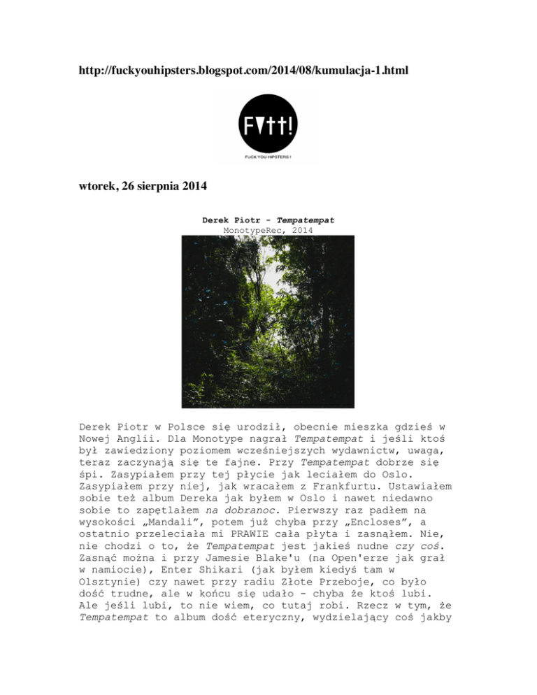 http://fuckyouhipsters.blogspot.com/2014/08/kumulacja-1.html wtorek, 26 sierpnia 2014 Derek Piotr - Tempatempat MonotypeRec, 2014 Derek Piotr w Polsce się urodził, obecnie mieszka gdzieś w Nowej Anglii. Dla Monotype nagrał Tempatempat i jeśli ktoś był zawiedziony poziomem wcześniejszych wydawnictw, uwaga, teraz zaczynają się te fajne. Przy Tempatempat dobrze się śpi. Zasypiałem przy tej płycie jak leciałem do Oslo. Zasypiałem przy niej, jak wracałem z Frankfurtu. Ustawiałem sobie też album Dereka jak byłem w Oslo i nawet niedawno sobie to zapętlałem na dobranoc. Pierwszy raz padłem na wysokości „Mandali”, potem już chyba przy „Encloses”, a ostatnio przeleciała mi PRAWIE cała płyta i zasnąłem. Nie, nie chodzi o to, że Tempatempat jest jakieś nudne czy coś. Zasnąć można i przy Jamesie Blake'u (na Open'erze jak grał w namiocie), Enter Shikari (jak byłem kiedyś tam w Olsztynie) czy nawet przy radiu Złote Przeboje, co było dość trudne, ale w końcu się udało - chyba że ktoś lubi. Ale jeśli lubi, to nie wiem, co tutaj robi. Rzecz w tym, że Tempatempat to album dość eteryczny, wydzielający coś jakby aurę spokoju, choć zależy, co kto uznaje za spokój. Tym razem mamy niby koncept poświęcony brzmieniom z Indonezji, obudowanym w większej mierze na zabawie, modulacji i obróbce samego głosu Dereka. Czasami kombinacje wydają się lekko męczące, jednak w całościowym rozrachunku Tempatempat powinno się jednak odbierać pozytywnie. „Mandala” wpada w ucho dzięki swojemu prostemu i równemu rytmowi, na który stopniowo nachodzi przesterowany wokal, wychodzący tym samym na pierwsze miejsce. „Encloses” zaczyna się od rozciągniętych syntezatorów, które przerywa pocięty - a jakże - wokal. translation: Derek Peter was born in Poland, currently living somewhere in New England. For Monotype recorded Tempatempat and if anyone was disappointed with the level of earlier releases, note, now begins the fun. When Tempatempat good sleep. Asleep at the plate as I flew to Oslo. I fell asleep with her, as I was returning from Frankfurt. I set up the album Derek also as I was in Oslo and even recently it zapętlałem a good night. The first time I fell at the height of "Mandala", then probably the "Encloses" and recently flew me ALMOST the entire plate and fell asleep. No, it's not about that Tempatempat is some boring or something. You can fall asleep and when James Blake (at Open'er as he played in a tent), Enter Shikari (as I was once there in Olsztyn) or even the radio Golden Oldies, which was quite difficult, but in the end it worked out - unless someone likes. But if he likes, I do not know what this does. The thing that Tempatempat this album quite volatile, emitting something like an aura of calm, but depends on what anyone considers to be calm. This time, we like the concept of dedicated Voices from Indonesia, shielded to a greater extent on the fun, modulation and processing the voice of Derek. Sometimes combinations seem to be a little tiring, but in the overall settlement Tempatempat should still answer positively. "Mandala" is catchy thanks to its simple and equal rhythm, which gradually intrudes distorted vocals, overlooking the same on the first place. "Encloses" begins with a stretched synthesizers, which interrupts the cut - and how - vocals.