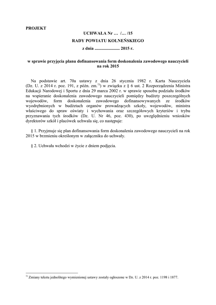 PROJEKT UCHWAŁA Nr … /… /15 RADY POWIATU KOLNEŃSKIEGO z dnia ....................... 2015 r. w sprawie przyjęcia planu dofinansowania form doskonalenia zawodowego nauczycieli na rok 2015 Na podstawie art. 70a ustawy z dnia 26 stycznia 1982 r. Karta Nauczyciela (Dz. U. z 2014 r. poz. 191, z późn. zm.1)) w związku z § 6 ust. 2 Rozporządzenia Ministra Edukacji Narodowej i Sportu z dnia 29 marca 2002 r. w sprawie sposobu podziału środków na wspieranie doskonalenia zawodowego nauczycieli pomiędzy budżety poszczególnych wojewodów, form doskonalenia zawodowego dofinansowywanych ze środków wyodrębnionych w budżetach organów prowadzących szkoły, wojewodów, ministra właściwego do spraw oświaty i wychowania oraz szczegółowych kryteriów i trybu przyznawania tych środków (Dz. U. Nr 46, poz. 430), po uwzględnieniu wniosków dyrektorów szkół i placówek uchwala się, co następuje: § 1. Przyjmuje się plan dofinansowania form doskonalenia zawodowego nauczycieli na rok 2015 w brzmieniu określonym w załączniku do uchwały. § 2. Uchwała wchodzi w życie z dniem podjęcia. 1) Zmiany tekstu jednolitego wymienionej ustawy zostały ogłoszone w Dz. U. z 2014 r. poz. 1198 i 1877. Załącznik do Uchwały Nr … /…/15 Rady Powiatu Kolneńskiego z dnia ……..2015 r. PLAN DOFINANSOWANIA FORM DOSKONALENIA ZAWODOWEGO NAUCZYCIELI NA ROK 2015 Lp. 1. Nazwa szkoły Zespół Szkół Ponadgimnazjalnych w Kolnie Formy doskonalenia zawodowego 1) Kształcenie organizowane przez szkoły wyższe i zakłady kształcenia nauczycieli: studia podyplomowe – wiedza o społeczeństwie. 2) Kursy kwalifikacyjne i doskonalące, seminaria oraz inne formy doskonalenia zawodowego dla nauczycieli: a) szkolenia dla egzaminatorów, b) szkolenia dyrektorów szkół, c) obowiązkowe konferencje metodyczne, d) przedmiotowe warsztaty metodyczne, e) kursy doskonalące dla nauczycieli przedmiotów, f) kursy instruktorskie, g) kursy i warsztaty dla wychowawców klas i opiekunów organizacji szkolnych. 3) Szkolenia Rady Pedagogicznej: warsztaty grupowe. Wysokość środków finansowych (w złotych) w § 4300 (usługi edukacyjne) w § 4410 (podróże służbowe) 5 020 4 500 RAZEM 2. Zespół Szkół Technicznych w Kolnie 1) Kształcenie organizowane przez szkoły wyższe i zakłady kształcenia nauczycieli: studia podyplomowe - wiedza o kulturze, wychowanie do życia w rodzinie, rolnictwo, 2) Kursy kwalifikacyjne i doskonalące, seminaria oraz inne formy doskonalenia zawodowego dla nauczycieli: a) szkolenia dyrektorów szkół, b) obowiązkowe konferencje metodyczne, c) przedmiotowe warsztaty metodyczne, d) kursy doskonalące dla nauczycieli przedmiotów, e) kursy i warsztaty dla wychowawców klas i opiekunów organizacji szkolnych, f) kursy kwalifikacyjne egzaminatora, g) kursy informatyczne wg standardów MEN. 3) Szkolenia Rady Pedagogicznej: warsztaty – jak zapobiegać przemocy i agresji w szkole? 9 520 3 900 RAZEM 3. Zespół Szkół Ponadgimnazjalnych w Stawiskach Kursy kwalifikacyjne i doskonalące, seminaria oraz inne formy doskonalenia zawodowego dla nauczycieli: a) szkolenia dyrektora szkoły, b) przedmiotowe warsztaty metodyczne, c) konferencje metodyczne. 14 565 450 RAZEM 4. Liceum 10 665 260 710 240 0 Ogólnokształcące dla Dorosłych w Grabowie 1) Kursy kwalifikacyjne i doskonalące, seminaria oraz inne formy doskonalenia zawodowego dla nauczycieli: a) szkolenia dyrektora szkoły, b) obowiązkowe konferencje metodyczne, c) kursy doskonalące dla nauczycieli przedmiotów. 2) Szkolenia Rady pedagogicznej warsztaty grupowe. RAZEM 5. Poradnia PsychologicznoPedagogiczna w Kolnie 1) Kształcenie organizowane przez szkoły wyższe i zakłady kształcenia nauczycieli: studia podyplomowe - socjoterapia. 2) Kursy kwalifikacyjne i doskonalące, seminaria oraz inne formy doskonalenia zawodowego dla nauczycieli: a) kursy doskonalące, seminaria, konferencje oraz inne formy doskonalenia zawodowego dla nauczycieli z zakresu pomocy psychologiczno - pedagogicznej i logopedycznej, b) kursy doskonalące, seminaria, konferencje oraz inne formy doskonalenia zawodowego dla dyrektora w zakresie kierowania i zarządzania placówką. 240 2 100 RAZEM Bursa Szkolna w Kolnie 6. Kursy kwalifikacyjne i doskonalące, seminaria oraz inne formy doskonalenia zawodowego dla nauczycieli: a) kursy doskonalące, seminaria, konferencje oraz inne formy doskonalenia zawodowego nauczycieli z zakresu działań opiekuńczo-wychowawczych, b) kursy doskonalące, seminaria, konferencje oraz inne formy doskonalenia zawodowego dla dyrektora w zakresie kierowania i zarządzania placówką, c) szkolenia wychowawców w zakresie działań opiekuńczowychowawczych. RAZEM OGÓŁEM 1 140 3 240 300 360 660 12 010 16 925 28 935